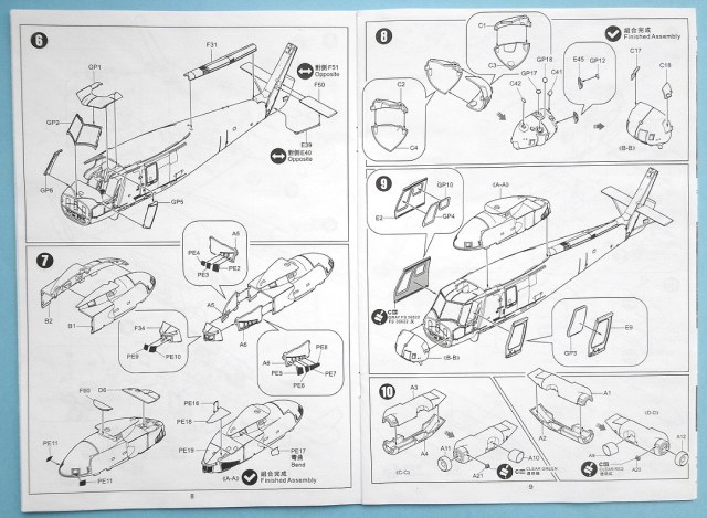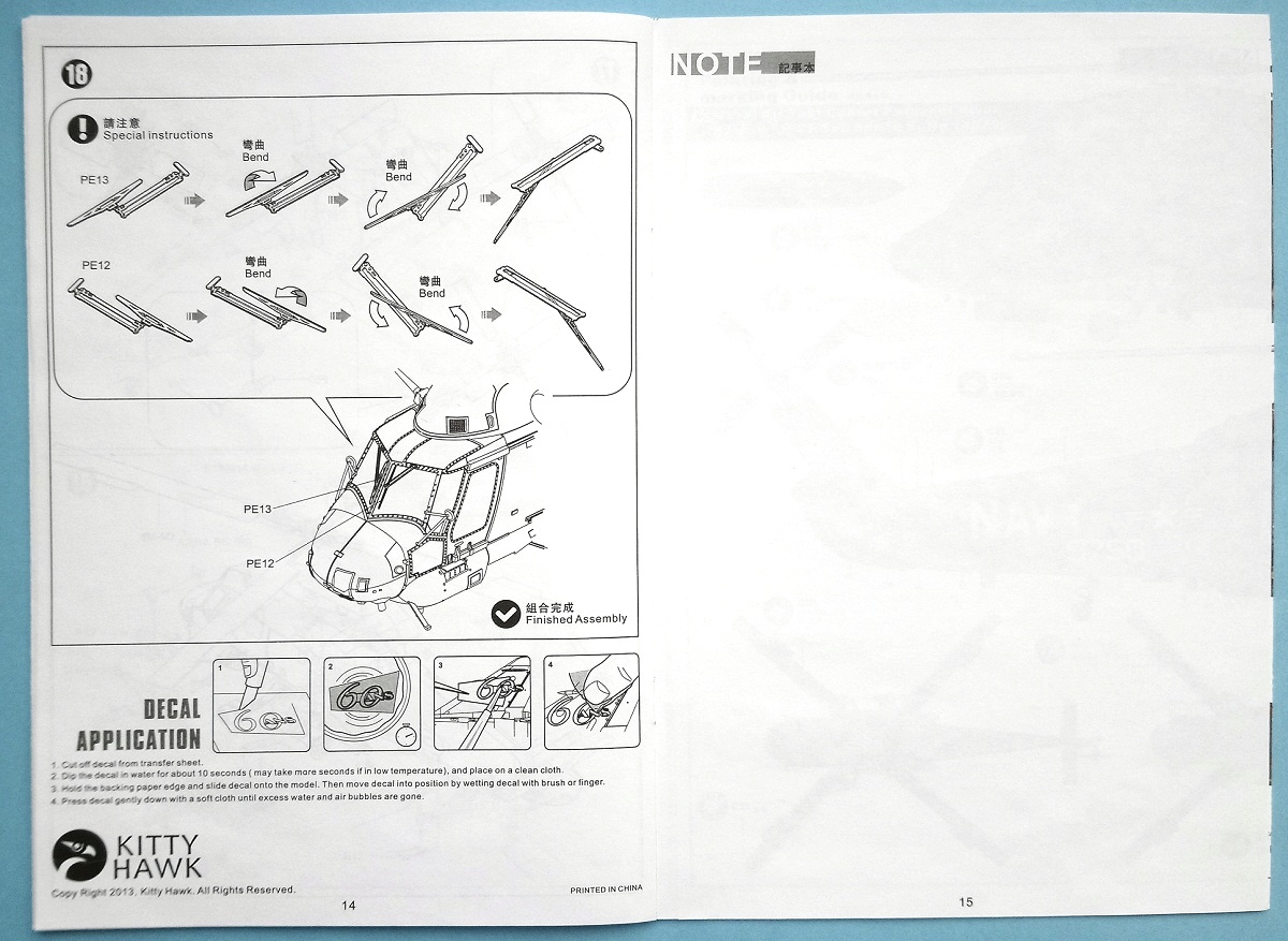 Коротко о впечатлении. Все детали отлиты гладко, без малейших следов облоя и утяжек. На фото виден ровный расшив и аккуратная клепка. На мой взгляд, глубина кроя достаточна для его выделения, если только в некоторых местах нужно будет углубить. Все прозрачные детали остекления также хорошего качества. Фототравленные детали из латуни больше относятся к экстерьеру. К интерьеру, только ремни на кресла пилотов. Декали модели с хорошей печатью без размытости границ. Качество самих картинок и надписей внешне не вызывает никаких подозрений, это выяснится в процессе нанесения на модель. Инструкция как всегда у КН грамотная, информативная и доходчивая моделисту любого уровня. Варианты окраски вертолета показаны на трех цветных разворотах и в 4-х ракурсах. Всё это наглядно показано на прилагаемых фото.