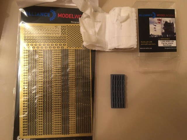 5. Допы от ModelWorks. Были куплены из-за мешков с песком (была акция 2=3). В итоге приобретено: набор иллюминаторов для японских кораблей (с какой-то непонятной мне волнистой проволокой - SOS, объясните что это, кто знает), набор с названиями японских военных кораблей (оказался не нужен т.к. FlyHawk в своем наборе для Такао его и так дает. Может на будущее - хочу со временем замахнуться на Тамиевкий Ямато!) и, собственно, мешки с песком (почему-то темно-серого цвета).