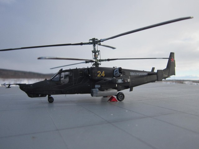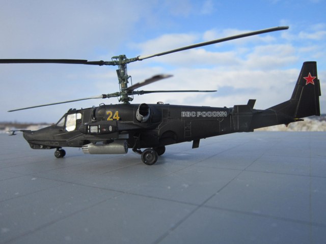 Доброго всем здоровья.Вот доделал модель,решил поделиться.Сам вертолет мне очень нравиться,более чем его двух местный брат. Данный борт,носил камуфляж ,был участником БУГ на Кавказе.В 2010 участвовал в параде победы над Москвой.Сейчас их судьба плачевна .Не всем машинам удалось стать "Алигатором".Теперь, что касаемо модели.Переделал кабину,добавил прицел.Переделал втулку НВ,заменил и добавил поручни.Заменил и рассверлил блоки НАР.Добавил бронилисты на кабину.Переделал блоки отстрела тепловых ловушек.И по мелочи,всего не запомнишь.Самое главное очень замерз,когда делал фотографии.Выложил фото ,а они маленькие,кто то сунул свой нос в настройки.Если такие не пойдут, оставлю в личных.За окном мороз еще сильнее.Всем спасибо.