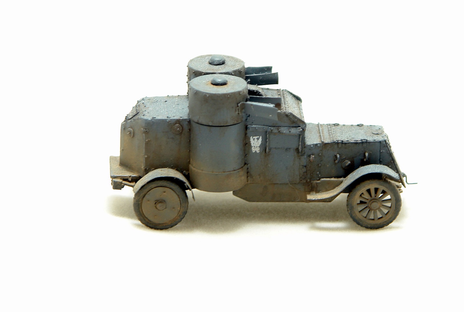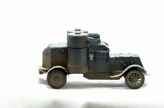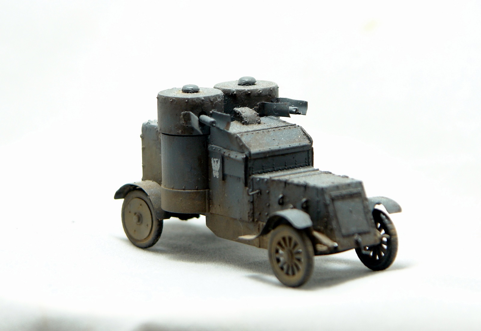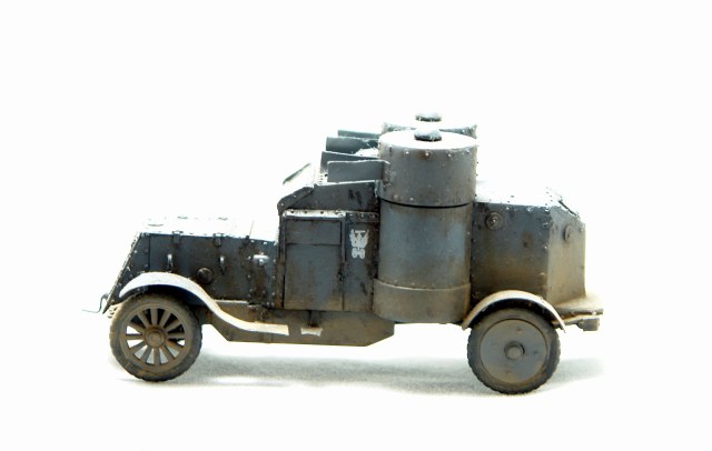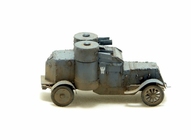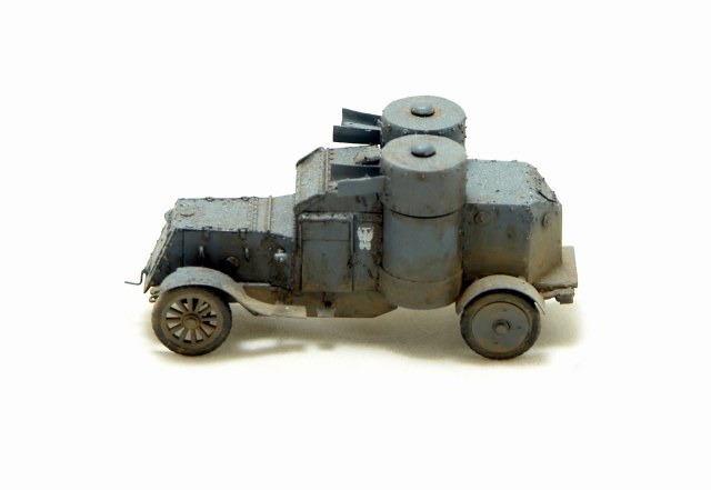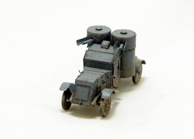Давно хотел заиметь модель Остина 2 серии но она есть только в смоле от польских производителей Модел Кряк. Смола не верная по геометрии и с грубой клепкой. Решив взять за основу модель МастерБокса 3 серии, совершил запил. Изменена форма корпуса в задней и передней части, башни, крылья ну и по мелочам. Покрасил в серый цвет и с эмблемами бронечастей Российской Империи.