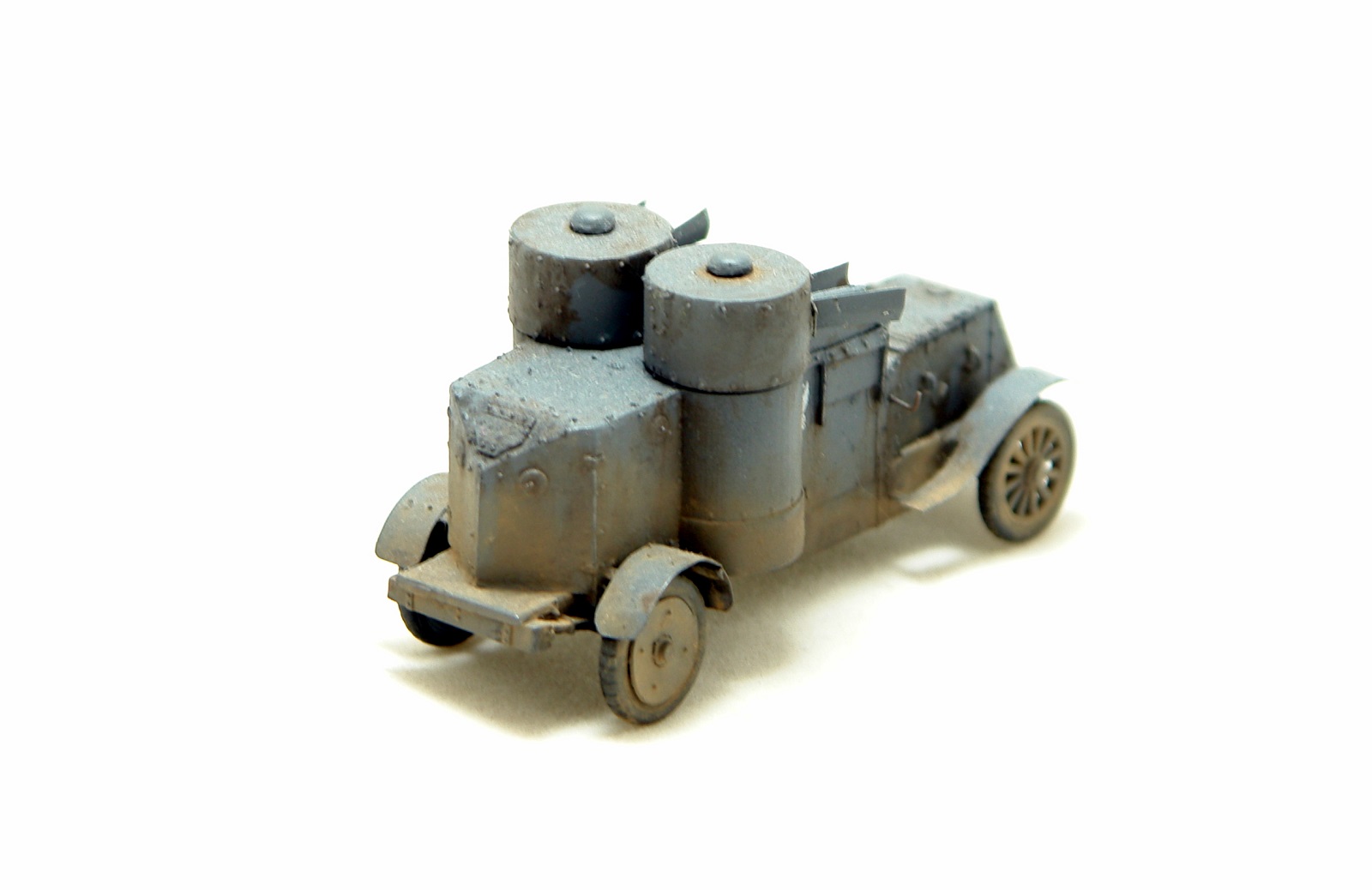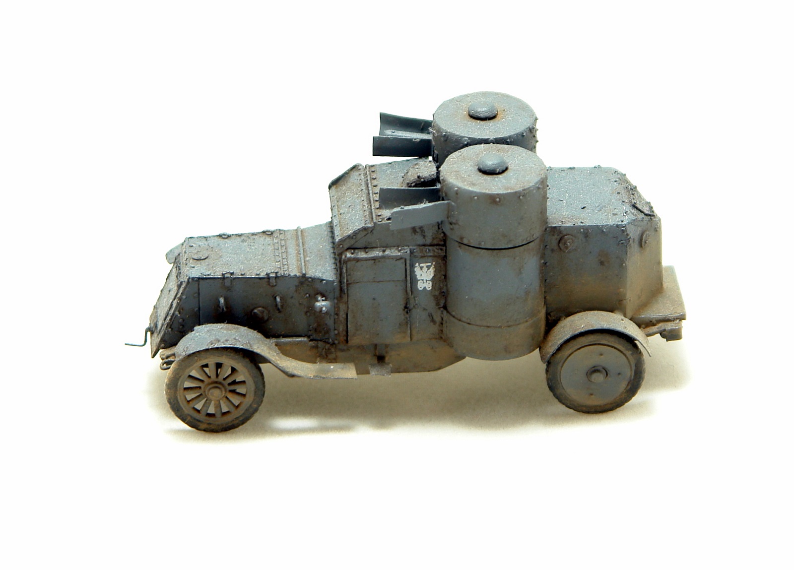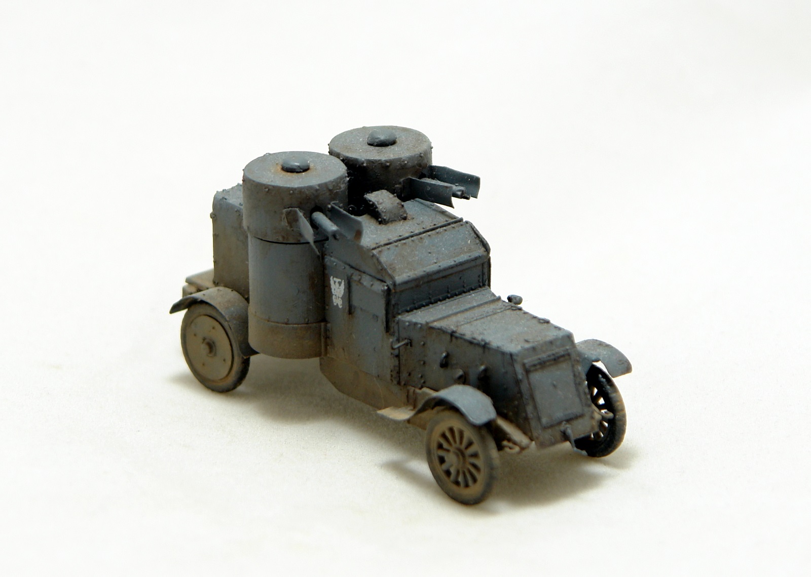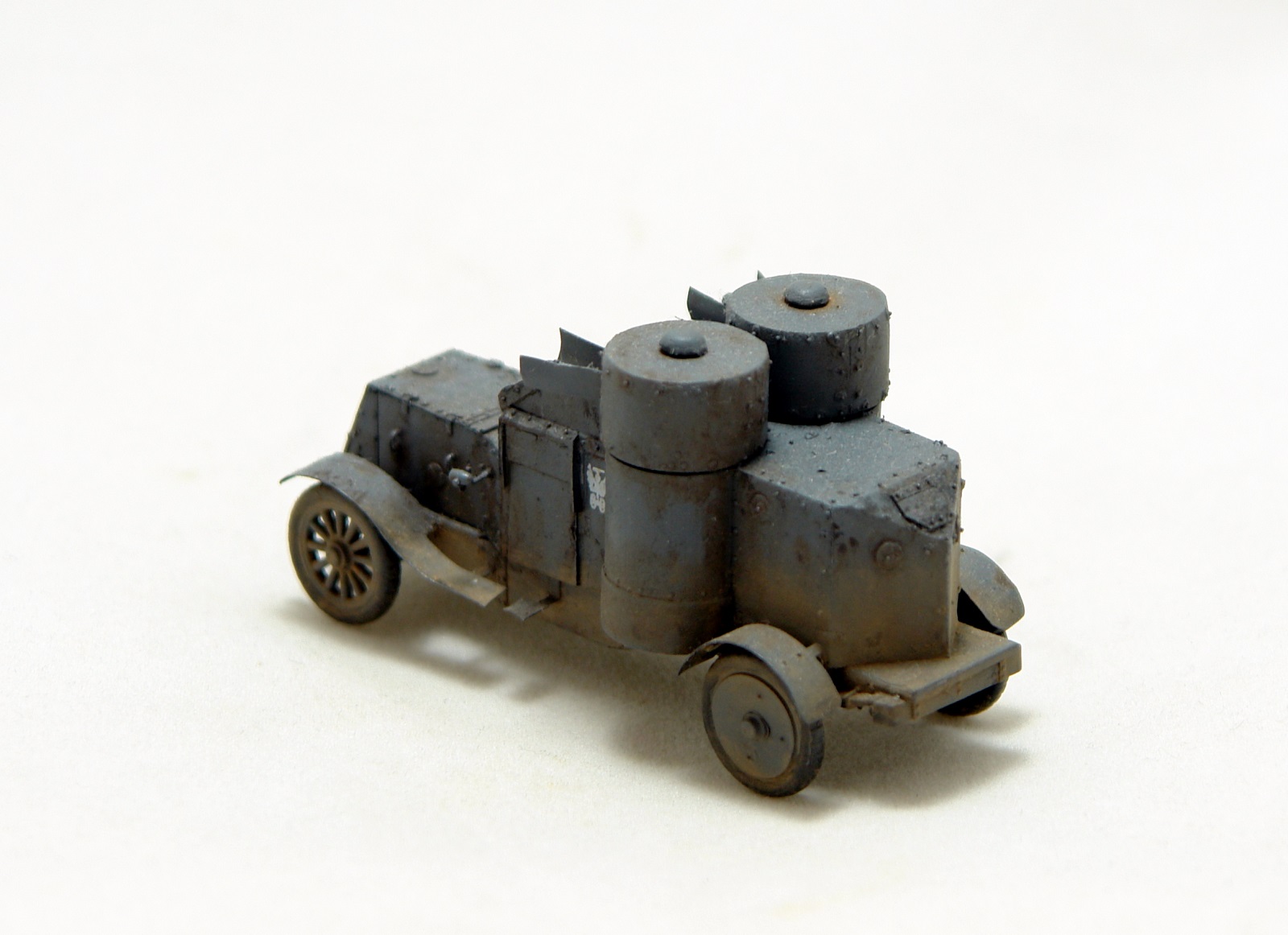Давно хотел заиметь модель Остина 2 серии но она есть только в смоле от польских производителей Модел Кряк. Смола не верная по геометрии и с грубой клепкой. Решив взять за основу модель МастерБокса 3 серии, совершил запил. Изменена форма корпуса в задней и передней части, башни, крылья ну и по мелочам. Покрасил в серый цвет и с эмблемами бронечастей Российской Империи.