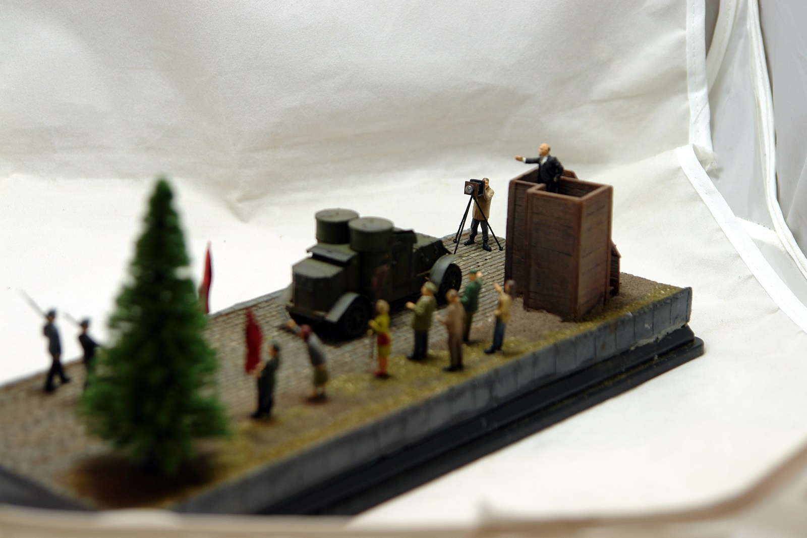 Образ общий и не имеет определенной привязки. Дату взял, как наиболее подходящую, судя по фото. Трибуну сделал, с образца с которой выступал Ильич перед Метрополем. Огромное спасибо Александру Гусеву за его фигуры Ленина и серии Уличные протесты. Марширующие ополченцы это перепил из Народной милиции от Звезды.