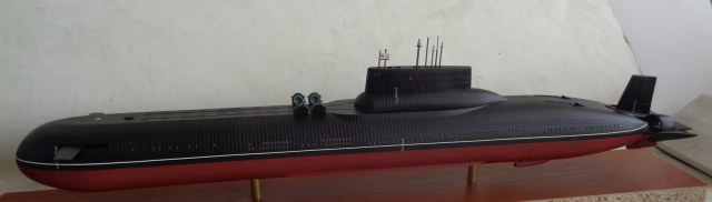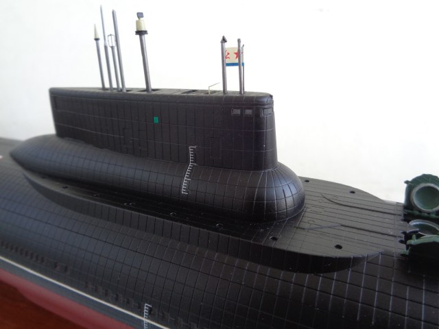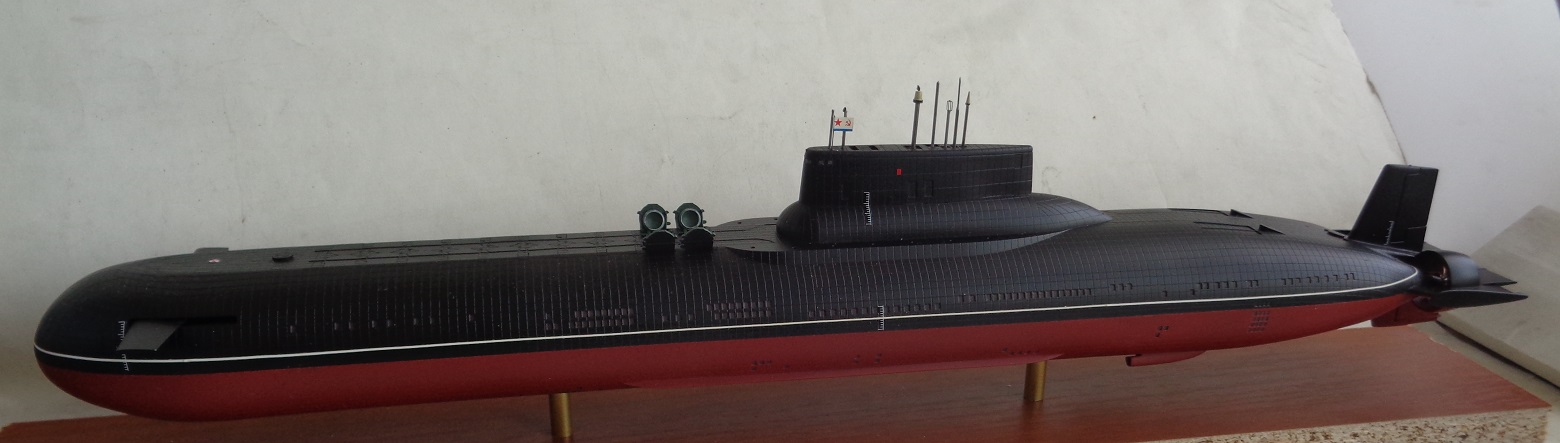 Данная работа по сути "искаропка" на заказ, с небольшими уточнениями и дополнениями. Дело в том, что на 6 построенных "Акул" приходится Три разных типа, хотя все они обозначаются как пр. 941 и индексов не имеют (исключая модернизированного "Дмитрия Донского"). После долгих раздумий дабы не завязнуть в перестройке модели, пришёл к выводу что пожалуй китайский пластик наиболее близок к первой паре построенных "Акул",причём по форме носовой оконечности он не может быть ТК-208. (Это мнение не категорично, возможно я в чём-то и ошибаюсь).