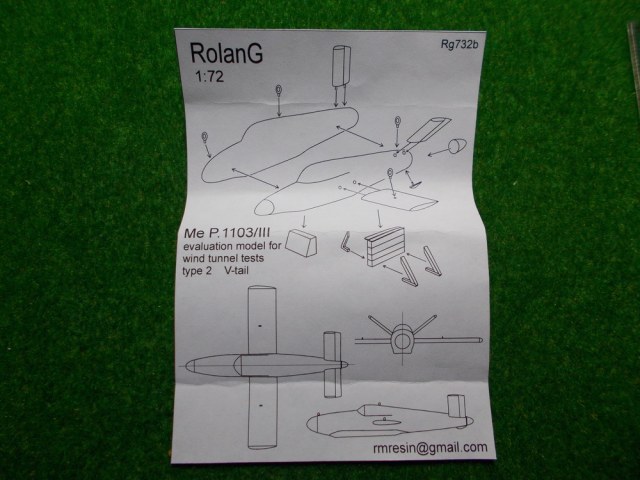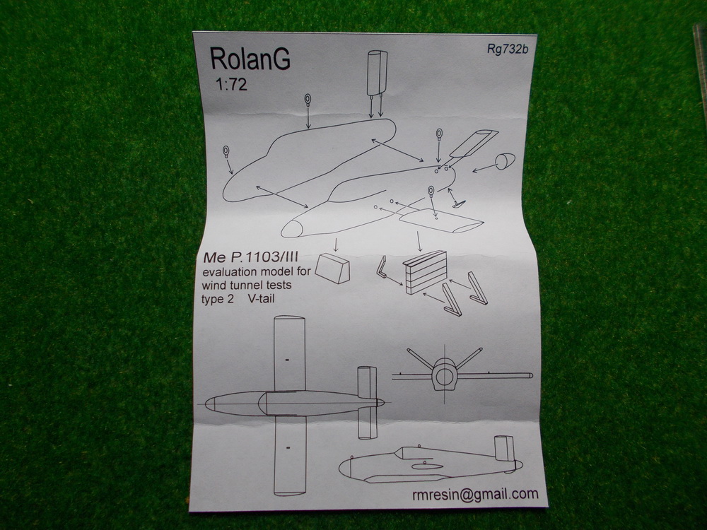 Полиуретановая модель MesserschmittMeP.1103 с V-образным оперением производится фирмой из подмосковного Воскресенска RolanG. Масштаб 1:72 (номер по каталогу Rg732b). Компания производит 2 варианта «продувочных» Ме Р.1103 – typeI и type II, которые отличаются размахом крыльев и размерами килей. Для сборки выбран MeP.1103 typeII…