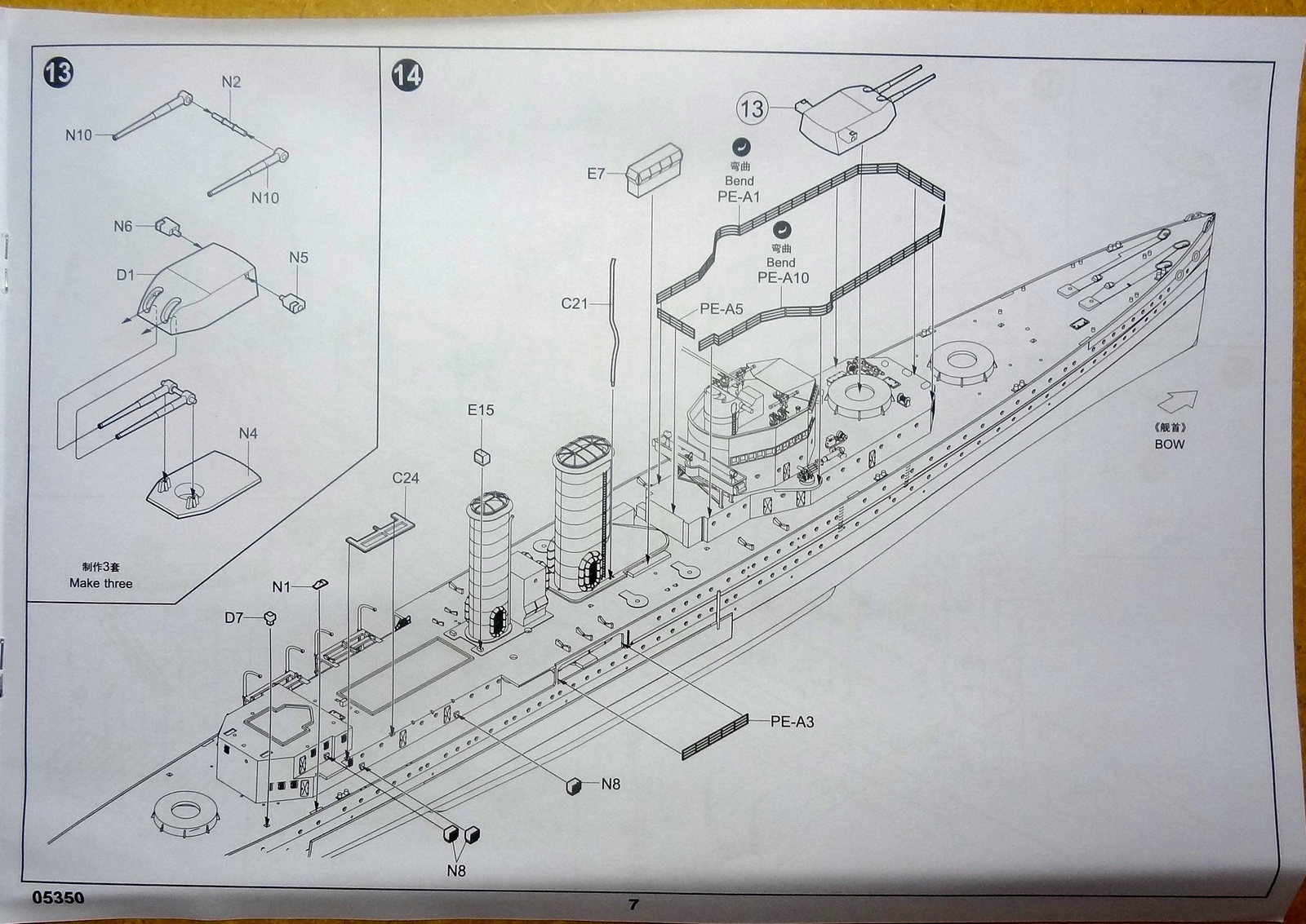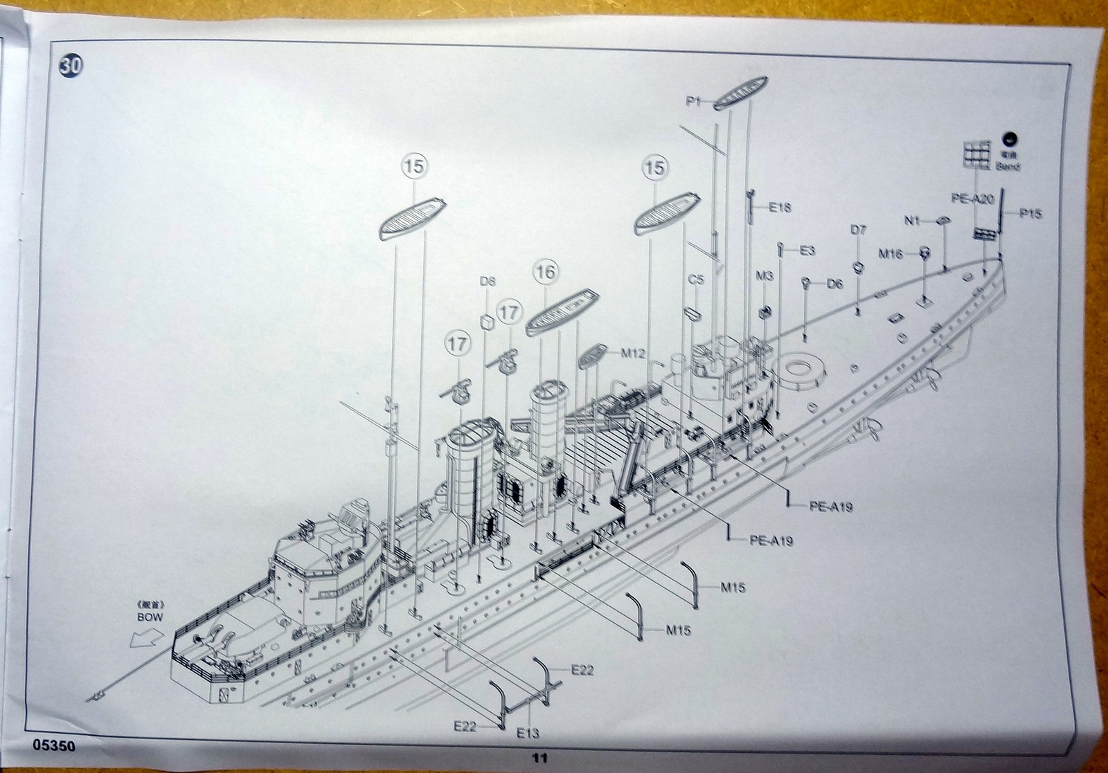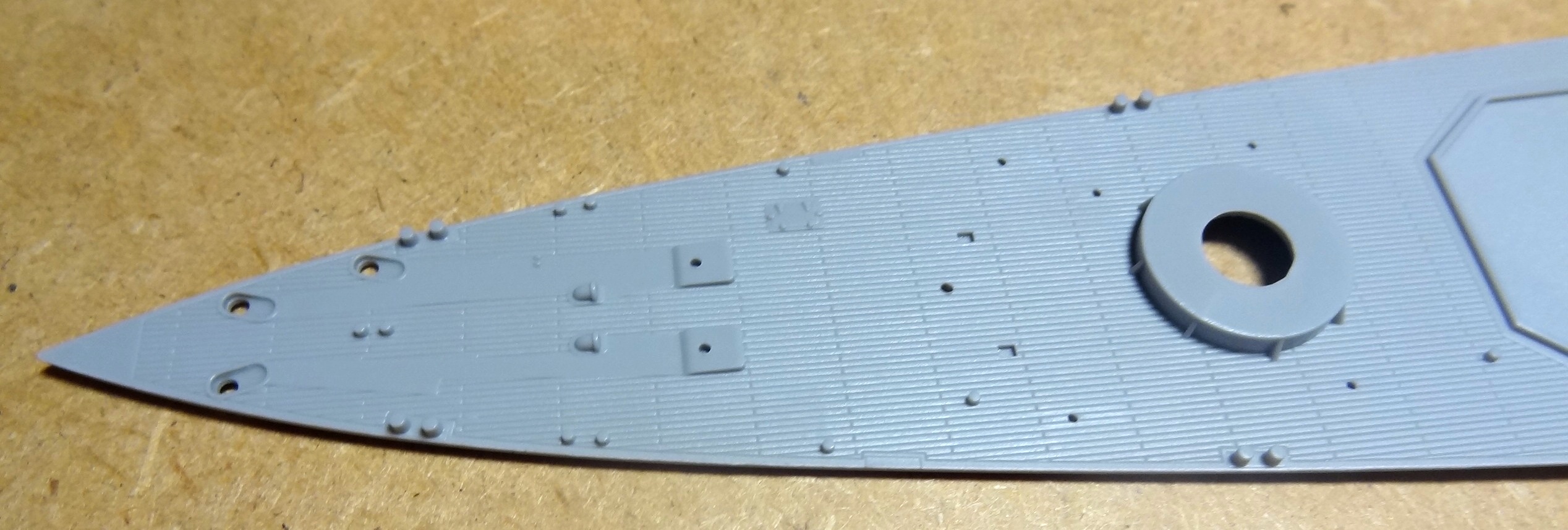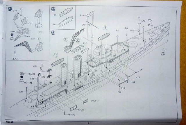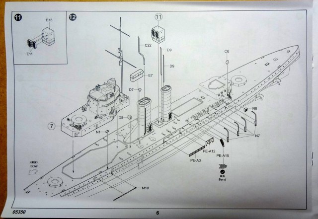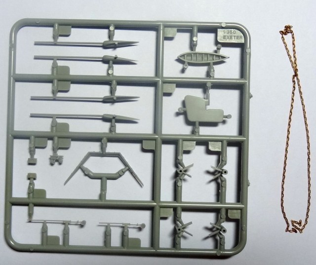 Первые впечатления: литье без явных дефектов, чистое и аккуратное. Неплохо и ажурно пролита мелочь. Орудия главного калибра с отверстиями, сверлить не надо. Травление вполне самодостаточно, хотя истинным эстетам конечно будет маловато. Я планирую добавить только палубу из шпона (уже на подходе) и, наверное, иллюминаторы. Беглое сравнение с доступной графикой (профили морские) грубых расхождений не выявило.