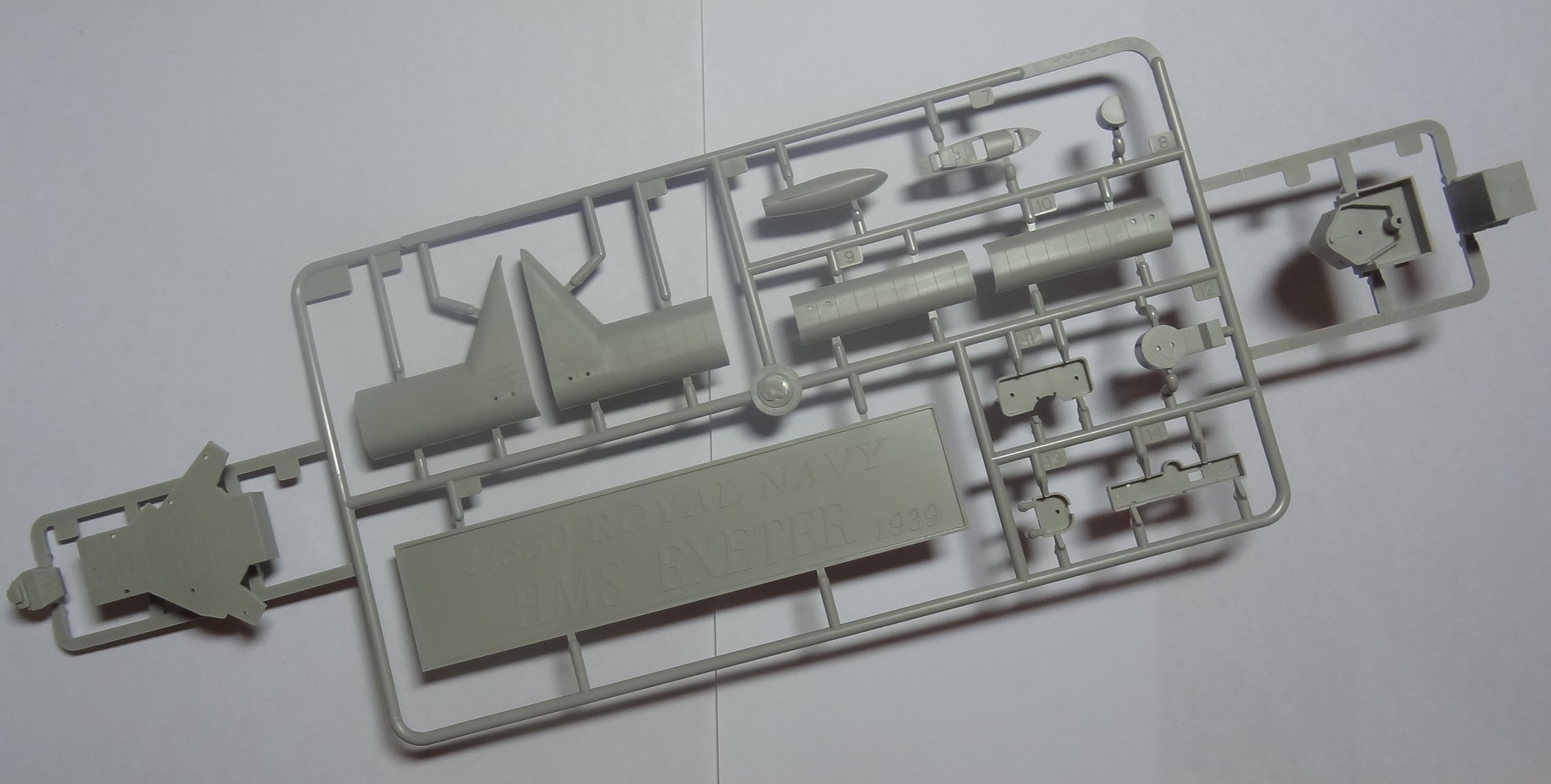 Коротко о прототипе: тяжелый крейсер типа York, заметно отличался более старомодным силуэтом от головного корабля. Спущен в 1929 г., достроен в 1931 г. Изначально служил в Вест-Индии. Участник боя у Ла-Платы с германским линкором "Адмирал Граф Шпее" в декабре 1939 г. (как раз на этот бой и сделан набор), где получил тяжелые повреждения. К слову это был первый артиллерийский морской бой Второй Мировой войны. После того знаменитого боя прошел основательный ремонт и модернизацию. Потоплен 1 марта 1942 г. во втором сражении в Яванском море. После боя с японскими крейсерами "Асигара" и "Миоко" добит торпедами японских эсминцев.