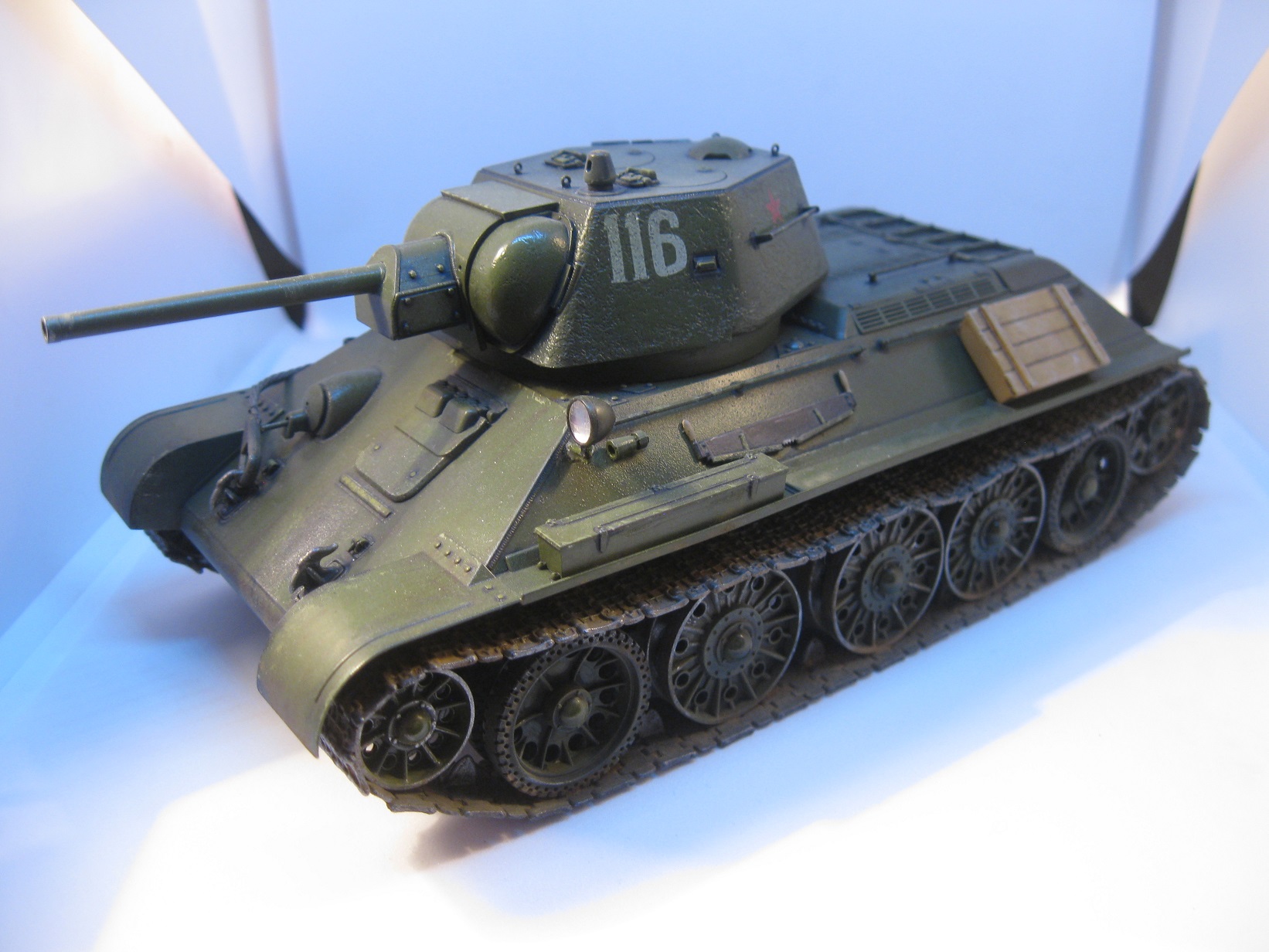 При покраске цвет мешал сам, да вроде не особо попал. Смывка от Tamiya, добавил немного сколов( пока не особо получаеться). Припылил немного ходовую, да вроде и все. Первая модель, которую пытаюсь разместит на сайте, да и вообще третья из всех собранных.