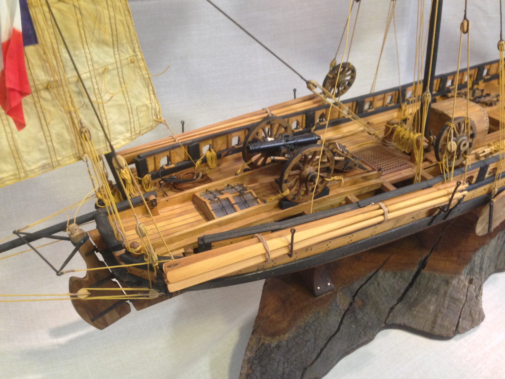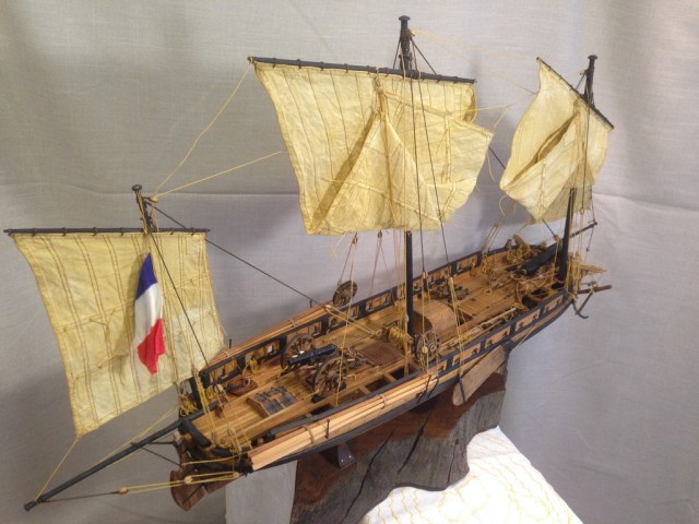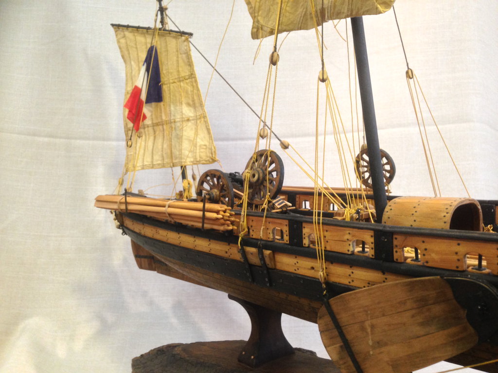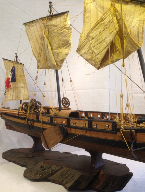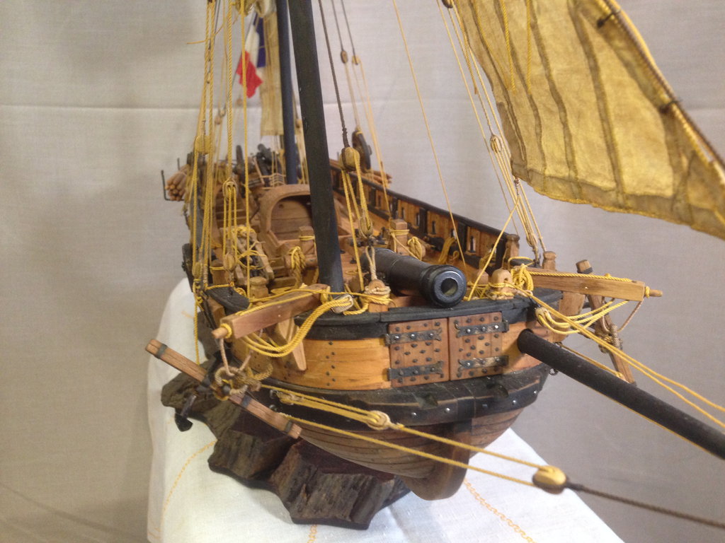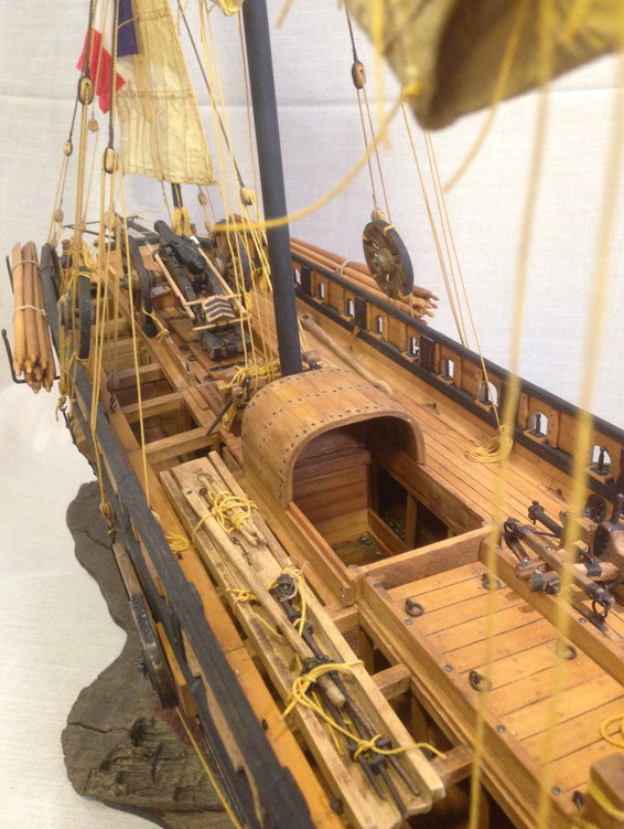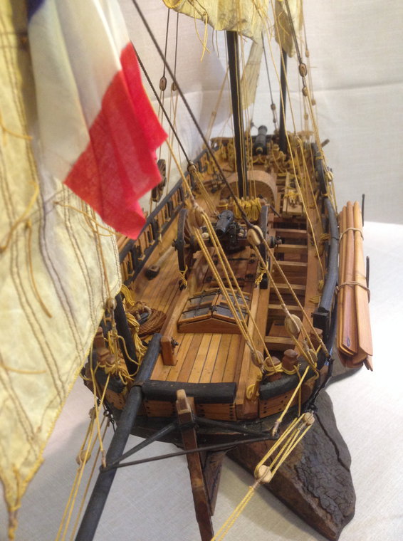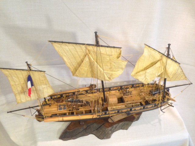 Масштаб 1:30 . Материал груша. Года 4 назад попался мне этот корабль в интернете, начал собирать инфу. Нашлось совсем не столько сколько хотелось бы - обрывки чертежей их монографии и фотки моделей французских моделистов (две модели вообще ни о чем , одна на очень хорошем уровне - ее и взял за основу. Там можно было много что увидеть, по чему не было вообще инфы.....) Переработал чертежи в свой масштаб и через два года начал стройку (очередь была.....) Корпус сделал скорлупой , что бы собрать полностью всю внутрянку.... Ее правда плоховато видно, но резать борт тут не хотелось. Половина палубного настила отсутствует через него и можно все рассмотреть внутри....... Строил два года без месяца. Не обошлось, к сожалению, и без косяков. Особо явные переделал, некоторые остались. Без них пока не получается........ Особое удовольствие доставила сборка пехотной пушки. Полный комплект с лафетом и сопутствующим, она представлена в галерее отдельно.