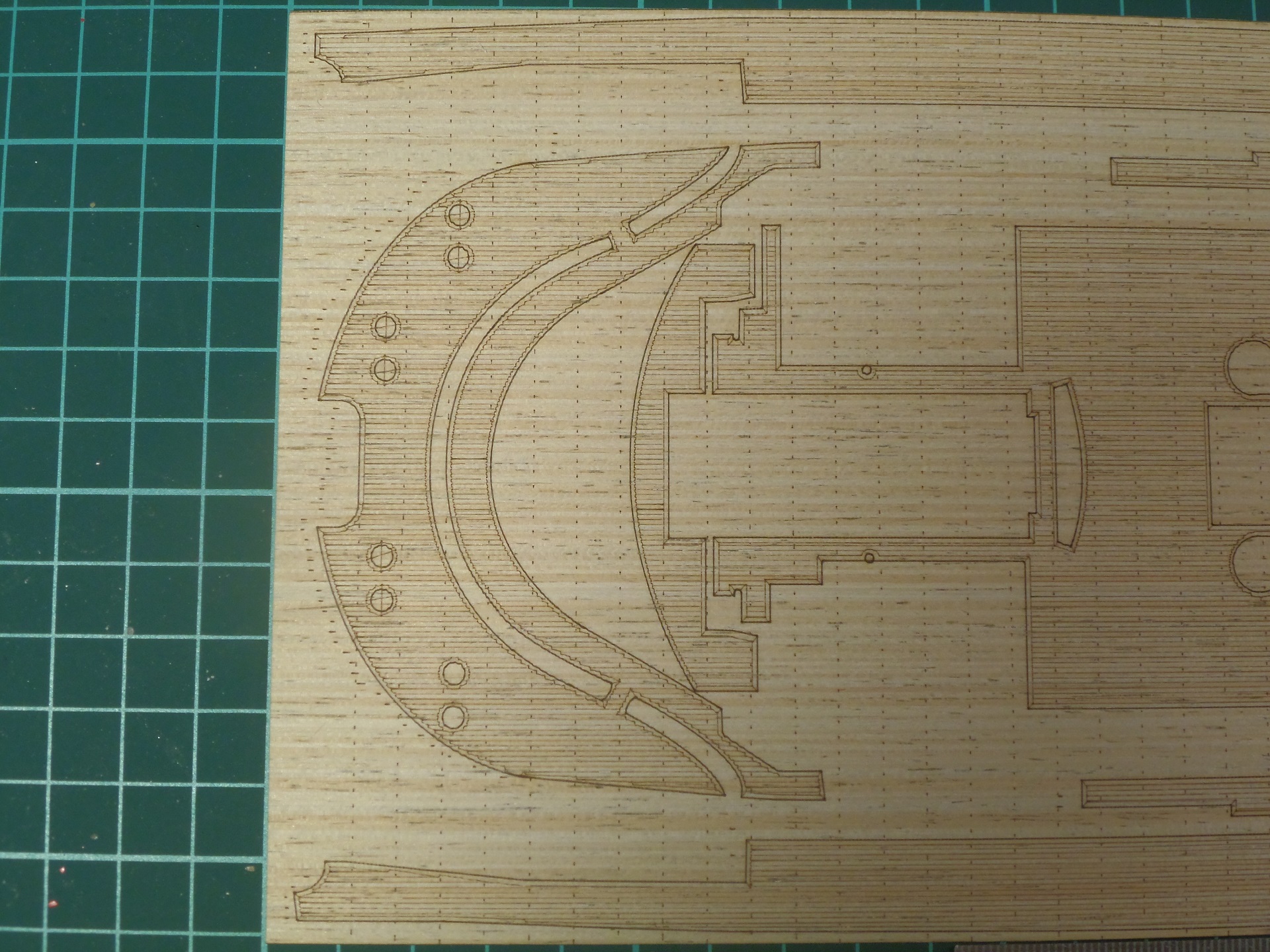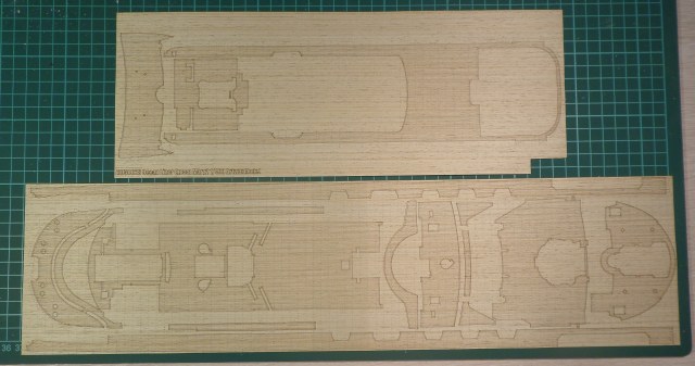В комплект входит два фрагмента листов шпона толщиной 0,3 мм, размерами 15*43 и 15*35 см, с нанесенным лазером рисунком палуб (Некоторые фрагменты достаточно длинные, всего их 15), и вырезанных так же фрагментов, все это держится на клеевой основе. Исполнение на уровне, отличное, как работающему на ЧПУ, поражает ширина реза, наверно 0,2 мм. Из минусов слегка контрастный рисунок дерева, тут уж обусловлено отсутствием масштаба дерева, ну это минус всех лазерных палуб, зато достаточно светлый. В дальнейшем кормовой участок палубы 6 (№15 в инструкции), а также носовой участок палубы 7 (№1) придется затемнить, либо отказаться от них, и просто покрасить, как это сделано на оригинале. Из этих листов, остается примерно половина дельных отходов, которые можно в будущем тоже куда нибудь применить, я уже немного использовал.