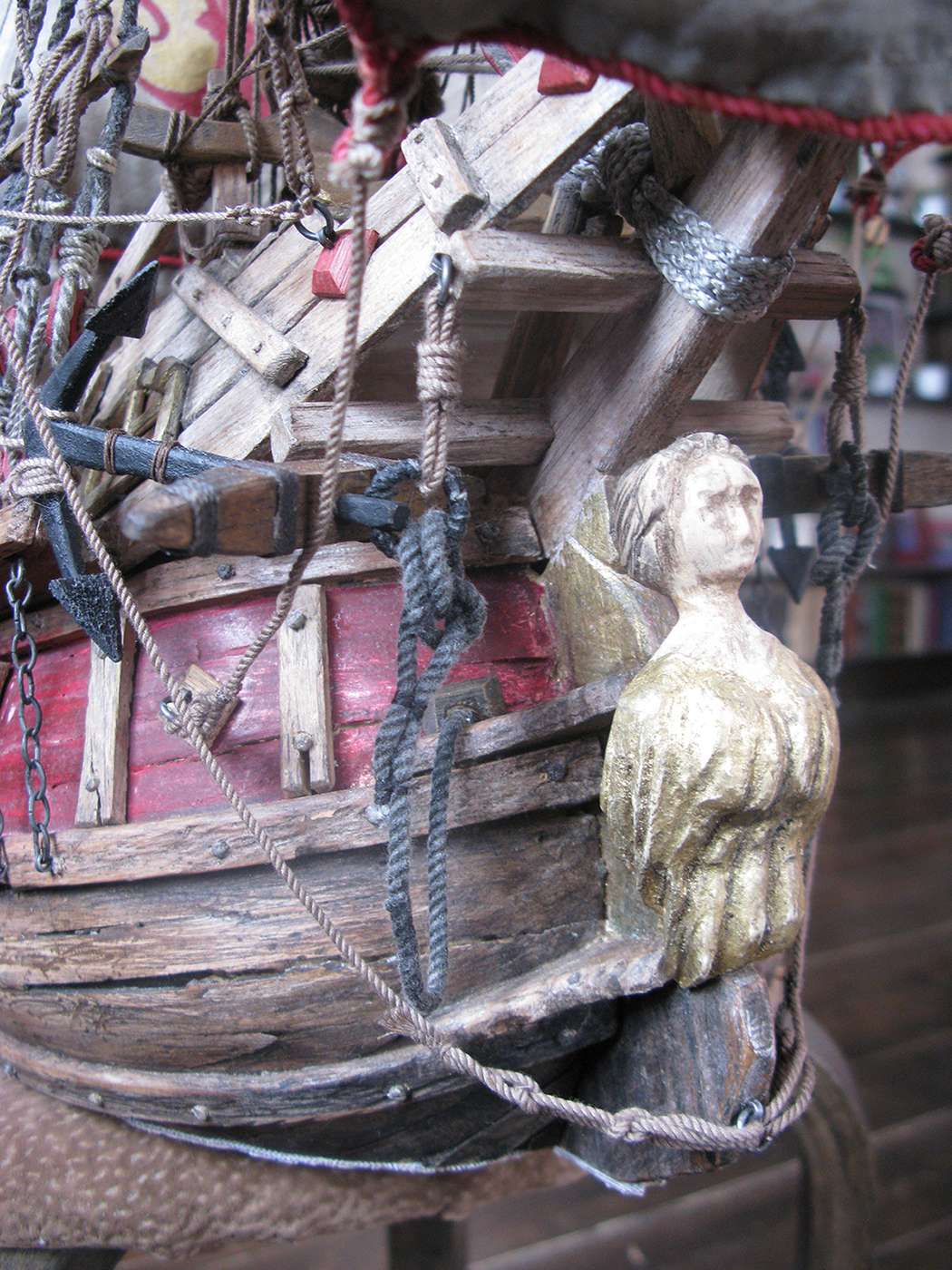 Модель-фантазия галеона, стремящегося превратиться в ландо, но запнувшегося где-то на уровне кормы. «Virgo» — то есть девушка-невеста в платьице стареньком, но вполне опрятном. Плавать не умеет, но, как и положено невесте, по мере сил украшает интерьер... и одаривает радостью окружающих.