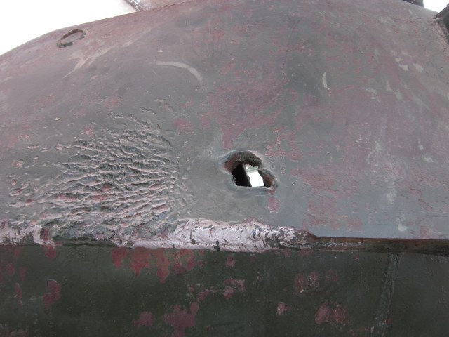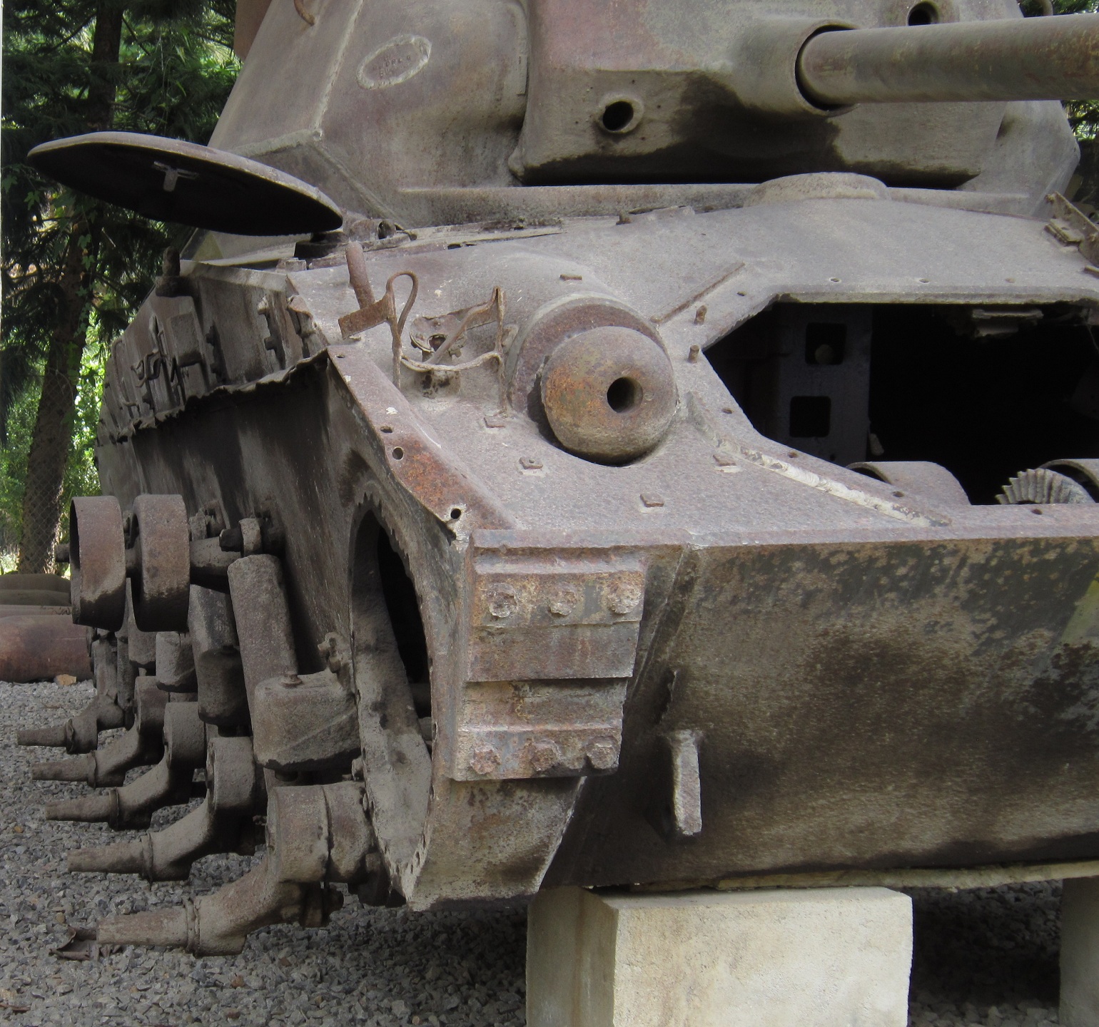 На танке с именем "Ettlingen" хорошо видны точно такие же повреждения правого "крыла" и пробоина в левой скуле башни, как на машине, стоящей на площадке у подножия "Элиан 2".