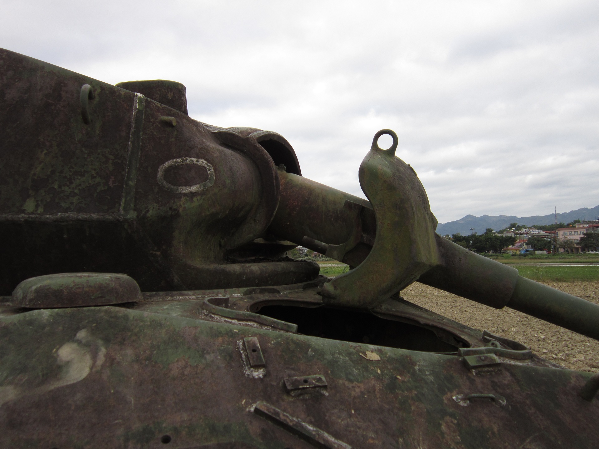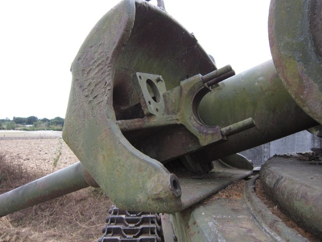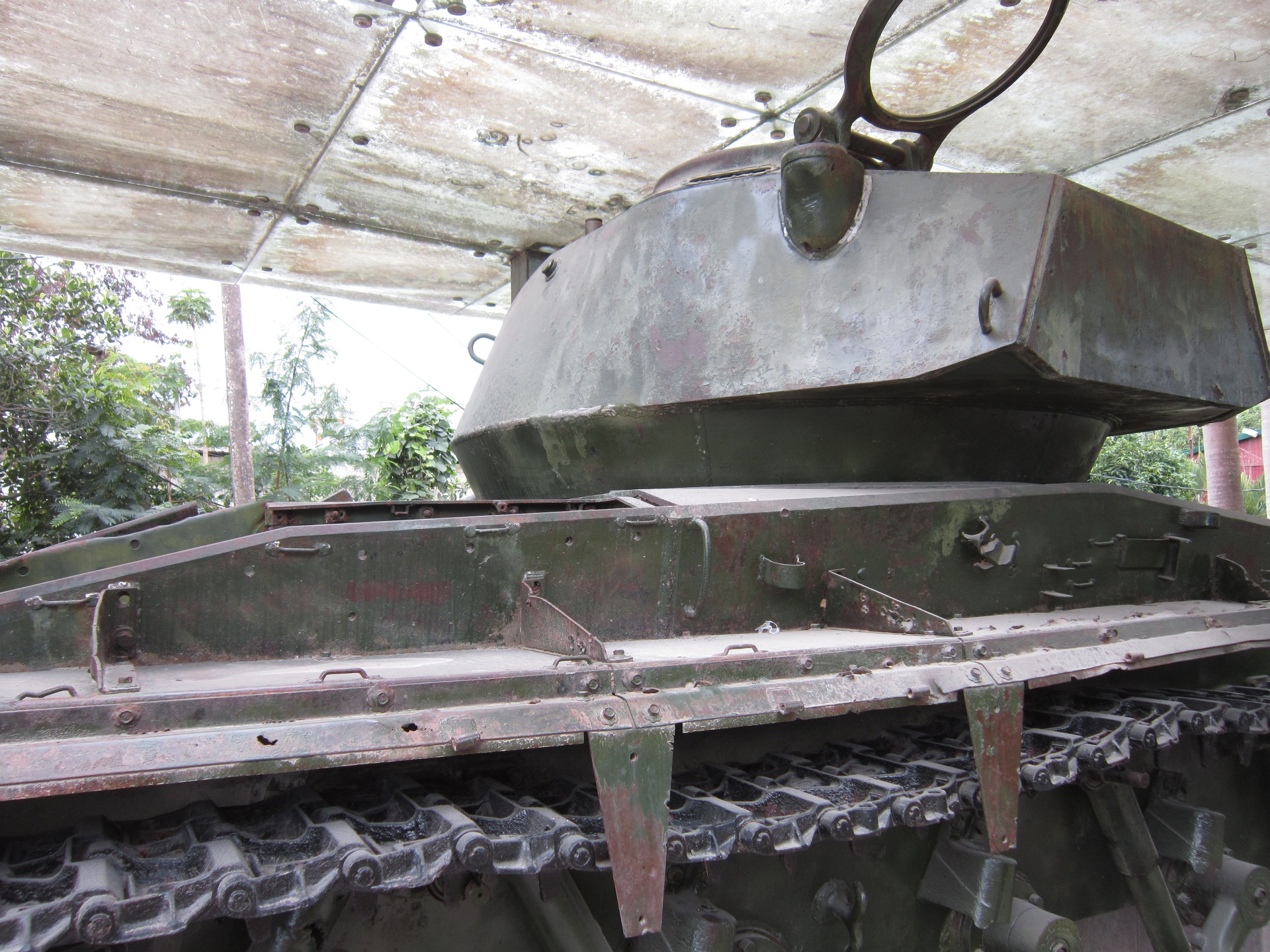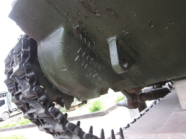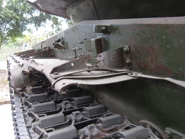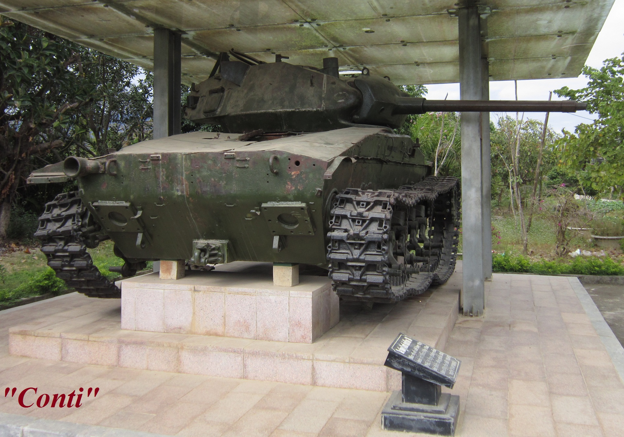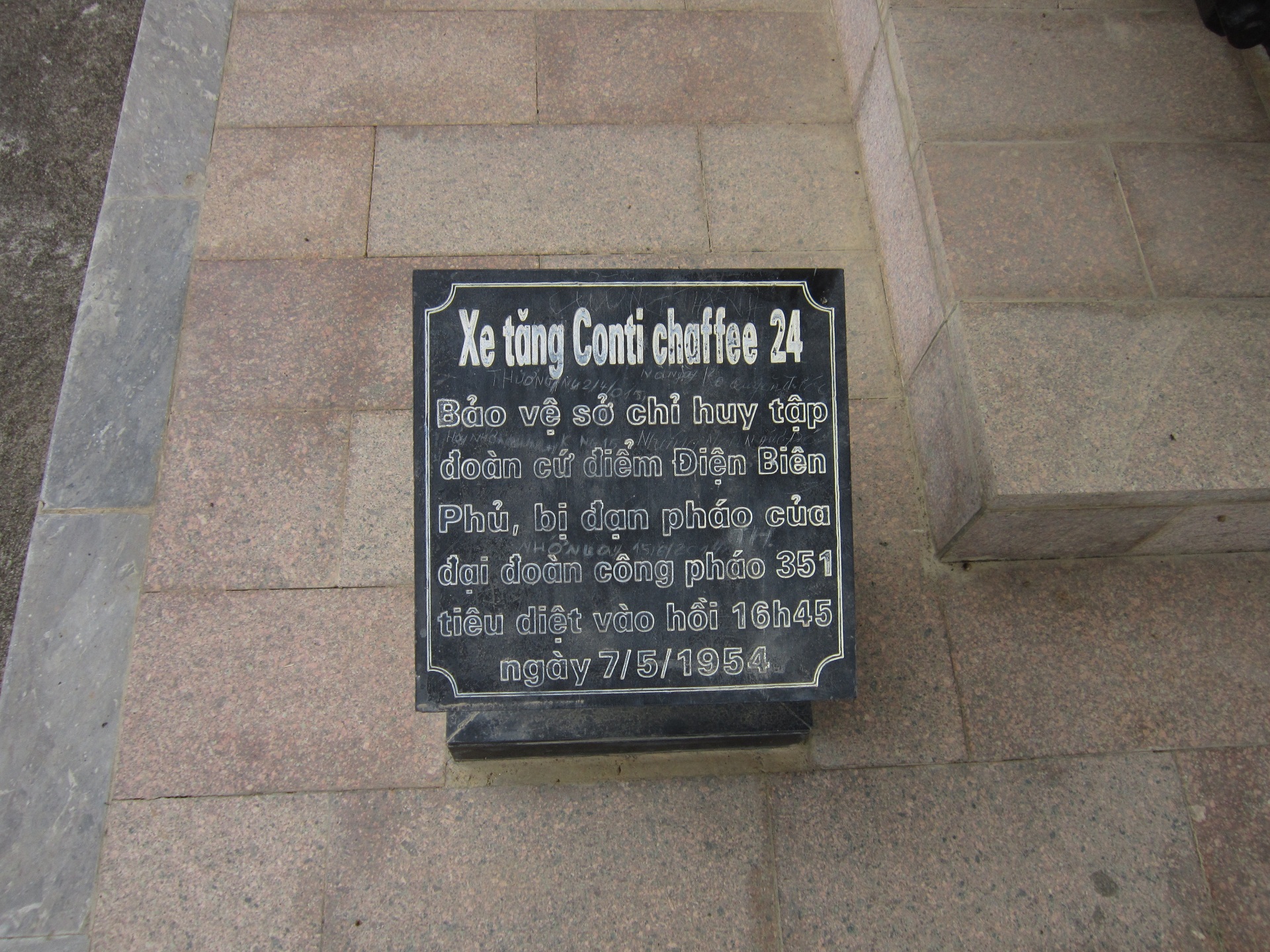 На перекрёстке около моста Бейли стоит "Conti", танк командира эскадрона капитана Эрвуэ. Он подорвался на мине во время одной из контратак на "Югетт 6" в ночь с 04.04 на 05.04.1954 и до конца осады использовался как неподвижная огневая точка. Кто и когда забил снаряд в ствол его орудия мне пока неизвестно. Возможно, что это сделал его экипаж перед капитуляцией. Гусеничные ленты на нём сейчас натянуты не "родные". На всех "прижизненных" фото "Conti" с траками Т85, а сейчас слева Т72, а справа вообще неизвестного мне типа. Такие же гусеницы ещё на "Bazeille"(обе) и на "Ettlingen"(справа).