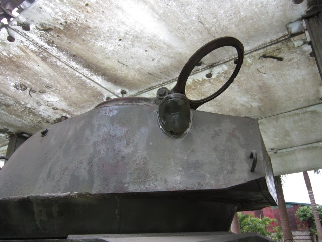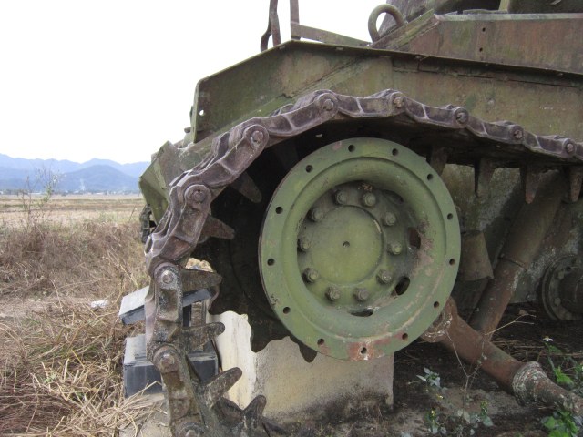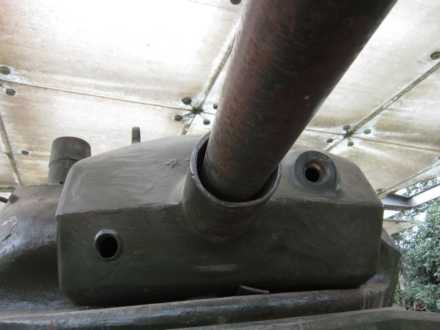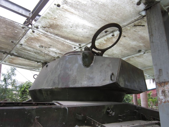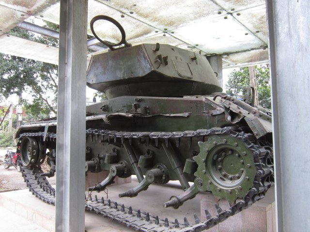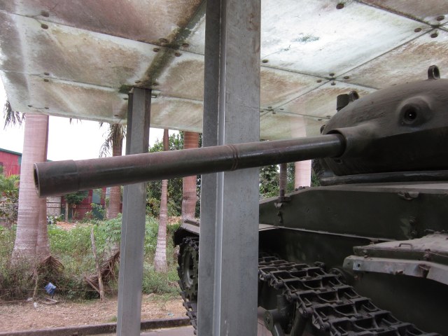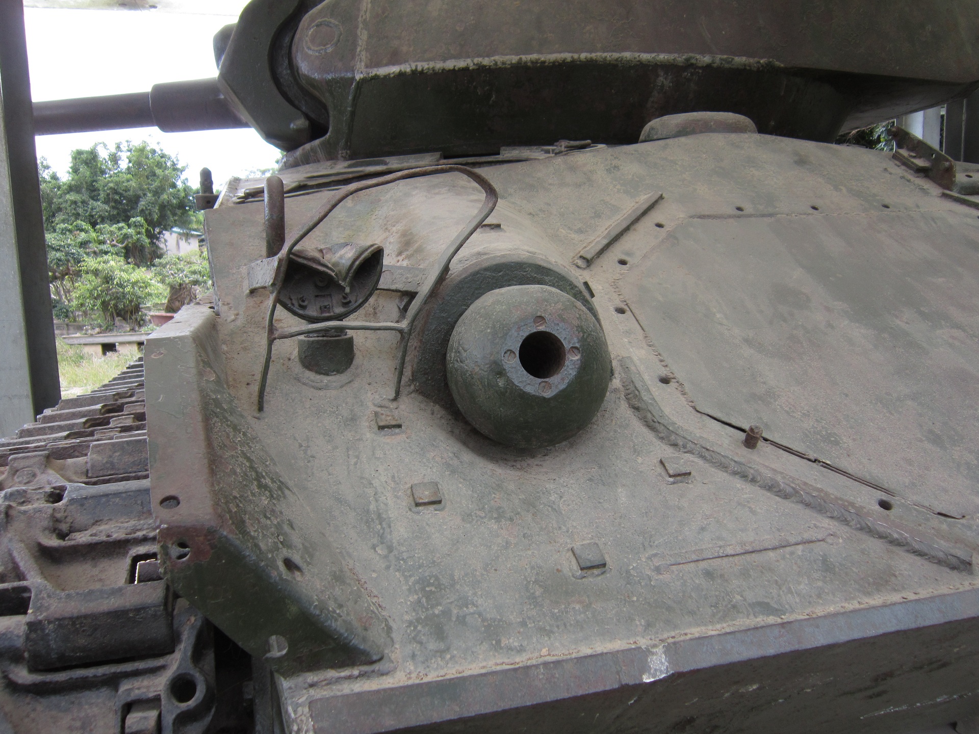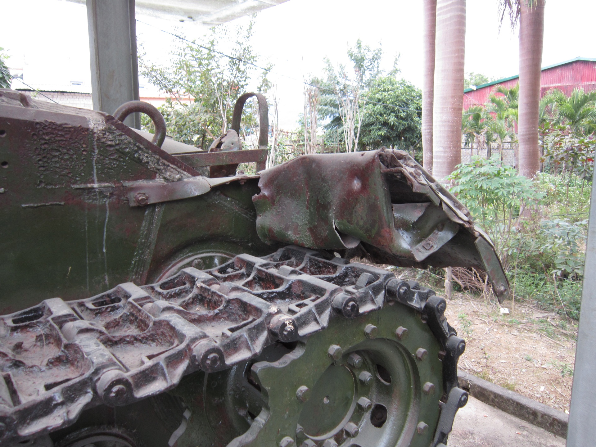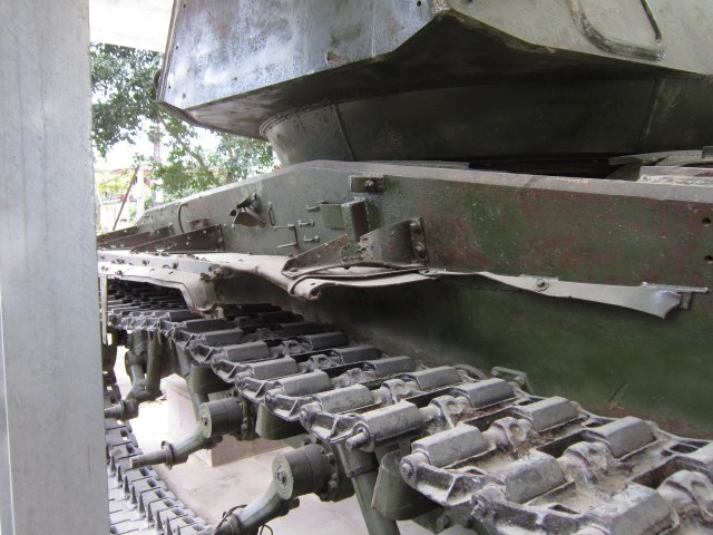 На перекрёстке около моста Бейли стоит "Conti", танк командира эскадрона капитана Эрвуэ. Он подорвался на мине во время одной из контратак на "Югетт 6" в ночь с 04.04 на 05.04.1954 и до конца осады использовался как неподвижная огневая точка. Кто и когда забил снаряд в ствол его орудия мне пока неизвестно. Возможно, что это сделал его экипаж перед капитуляцией. Гусеничные ленты на нём сейчас натянуты не "родные". На всех "прижизненных" фото "Conti" с траками Т85, а сейчас слева Т72, а справа вообще неизвестного мне типа. Такие же гусеницы ещё на "Bazeille"(обе) и на "Ettlingen"(справа).