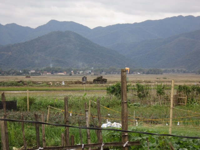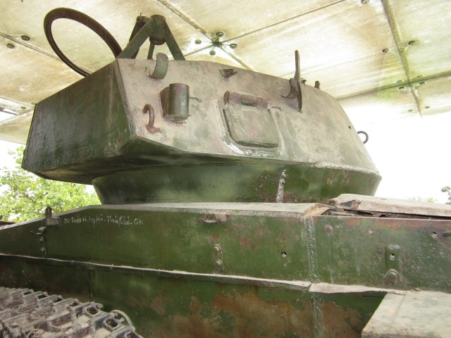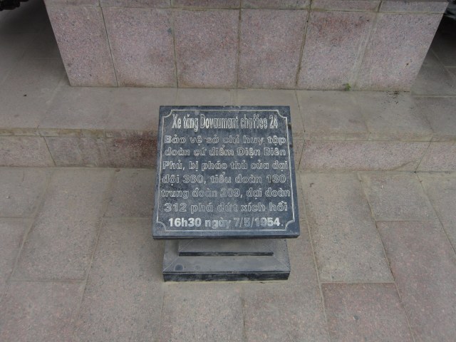 Последний из сохранившихся танков, "Mulhouse" расположен в 400 метрах севернее, в районе бывшего опорного пункта "Югетт 2" недалеко от края ВПП. Чтобы увидеть его вблизи, последние метров двести придётся пробираться огородами и полями - нормальной дороги или даже тропы к нему нет, несмотря на то что возле него стоит стелла с текстом о взятии аэродрома. На табличке с описанием имени танка нет, перечисляются номера артполков Вьетминя и калибры состоявших на их вооружении орудий, указана дата 23.04.1954 - дата последней крупной контратаки французов, в попытке отбить "Югетт 1". Вполне возможно, что именно в этой контратаке танк и был окончательно выведен из строя артогнём. Заплата слева сзади на башне приварена ещё французами и закрывает пробоину от попадания 105мм снаряда.