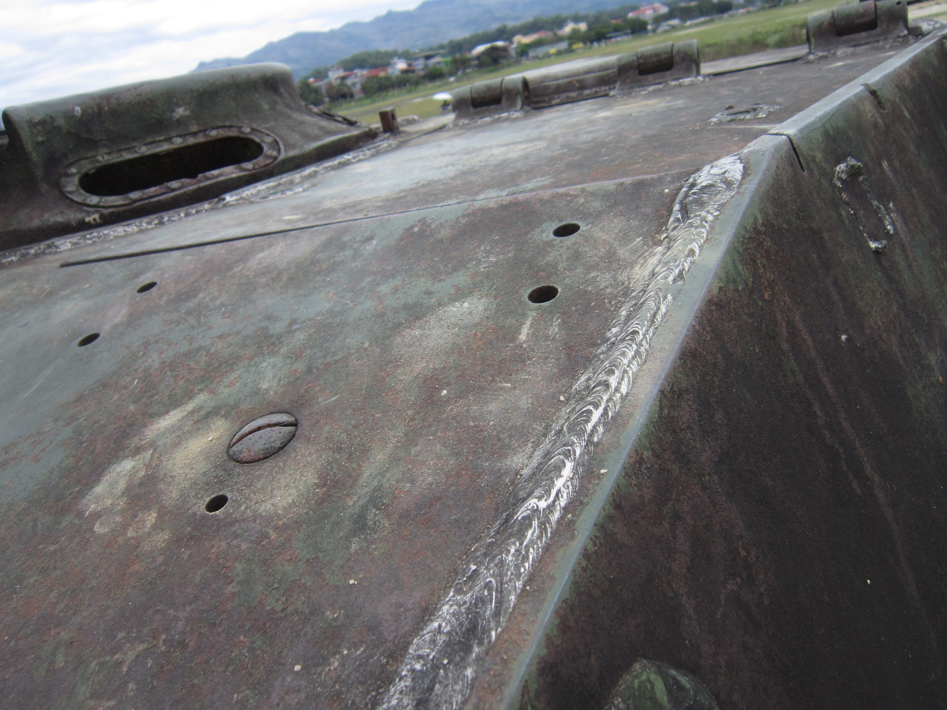 Ну, как тонкое? Те края листов, что были вывернуты взрывом, толщиной в палец. Они не проржавели до дыр, видимо потому, что вода по ним стекала. А вот там, где она стояла годами, там да, как консервная банка. И даже 25-мм борта в нижней части проржавлены изрядно и стали тоньше, а выше те же самые борта почти как новые.