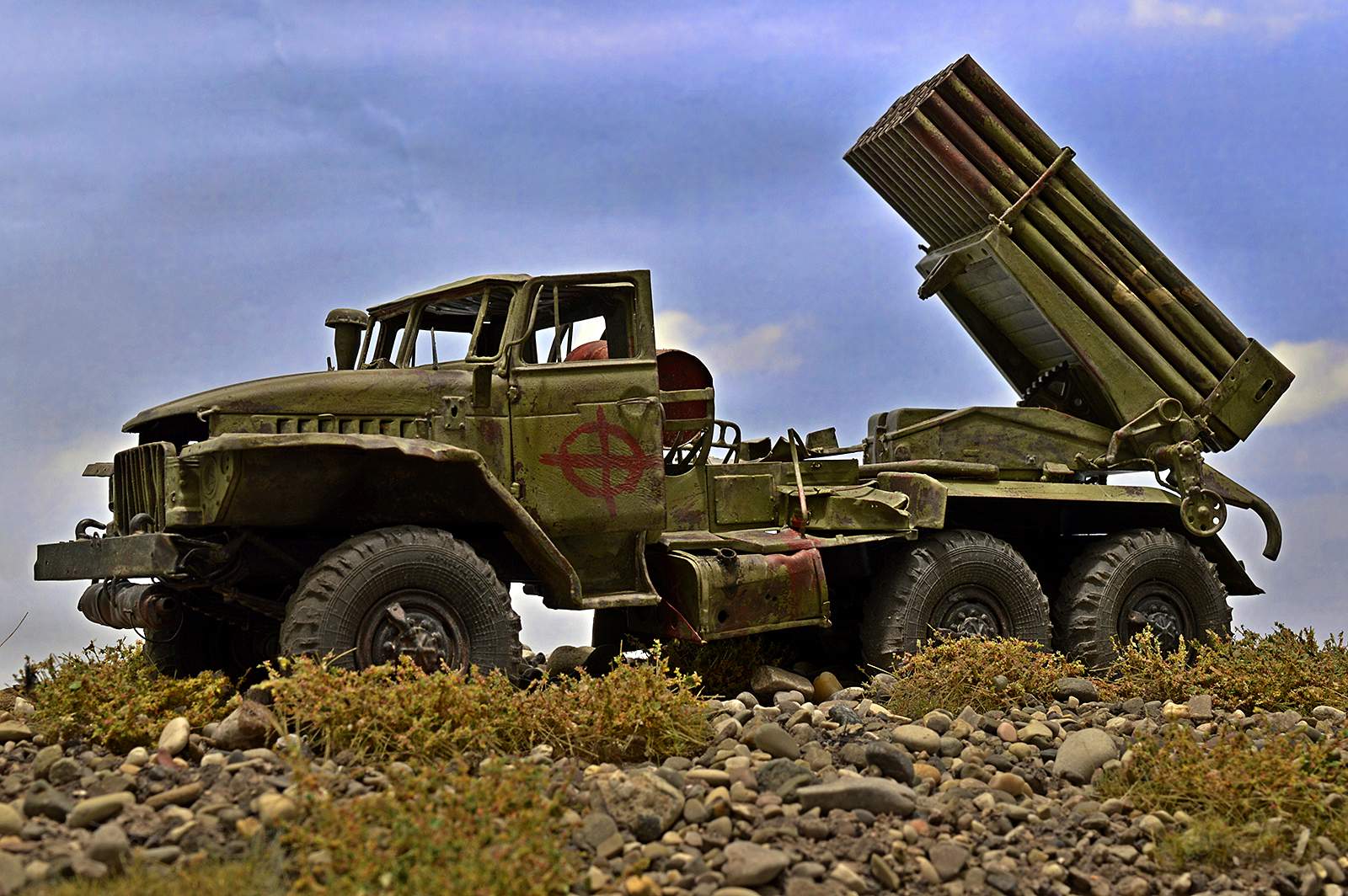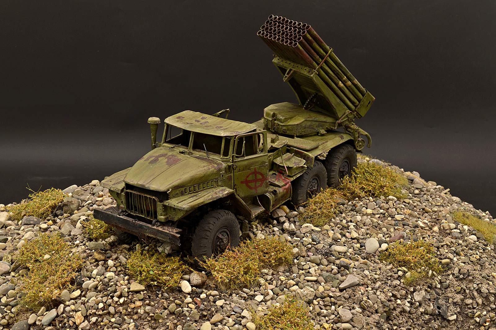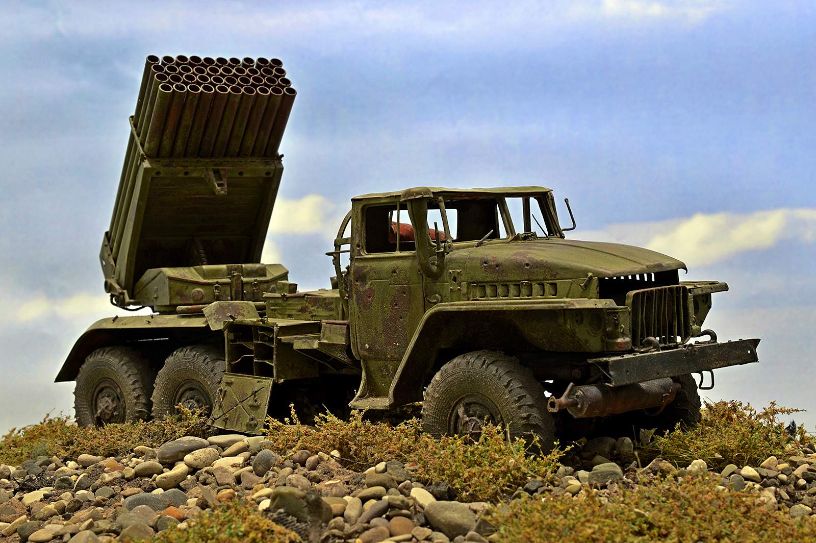 Модель от TRUMPETER. Замечательный набор, при сборке которого получаешь только удовольствие. Отменное качество и количество деталей, превосходная стыкуемость… Данная модель не является прототипом конкретной машины, но работал по фотографиям валка Дмитрия Деревянкина БМ-21 РСЗО 9К51 "Град" на шасси Урал-375Д.