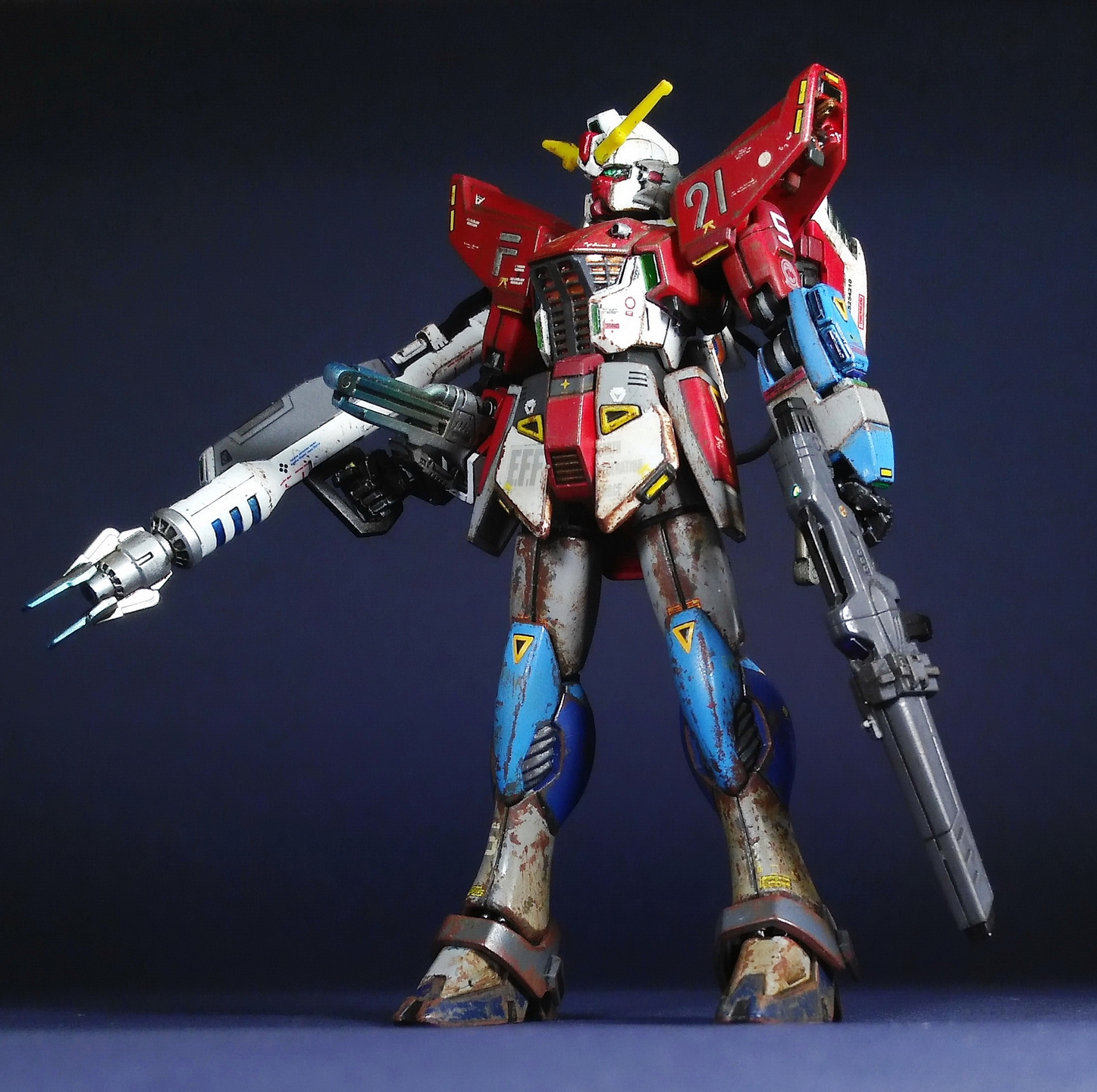 Набор - простая и дешевая моделька, для пробный шар в новом жанре 'gunpla', очень популярном в Азии. Собирал с доработками, заменил "рога" гандама, расточил стволы, добавил кабель питания к большой пушке. Схема окраски не родная, красил на свой вкус, ржавчина и загадинг тоже - надо было потренироваться, поэтому робот получился поюзанным. Декали из запасов, оптика - пайетки, окрашивал тамией и ганзой, лак - футура и "Звезда". Шарниры гандама вклеил в статичную позу, мне не нужна подвижность модели. Глаза и другая оптика из пайеток отлично блестит, но заснять это мне не удалось. Возможно, в будущем сделаю подставку для этого костюма, но пока постоит в таком виде. В принципе работать над моделью понравилось, хороший отдых от классического моделизма, не зря азиатам это нравится - сочно и просто. Страдающим от модельного бессилия рекомендую обратить внимание.