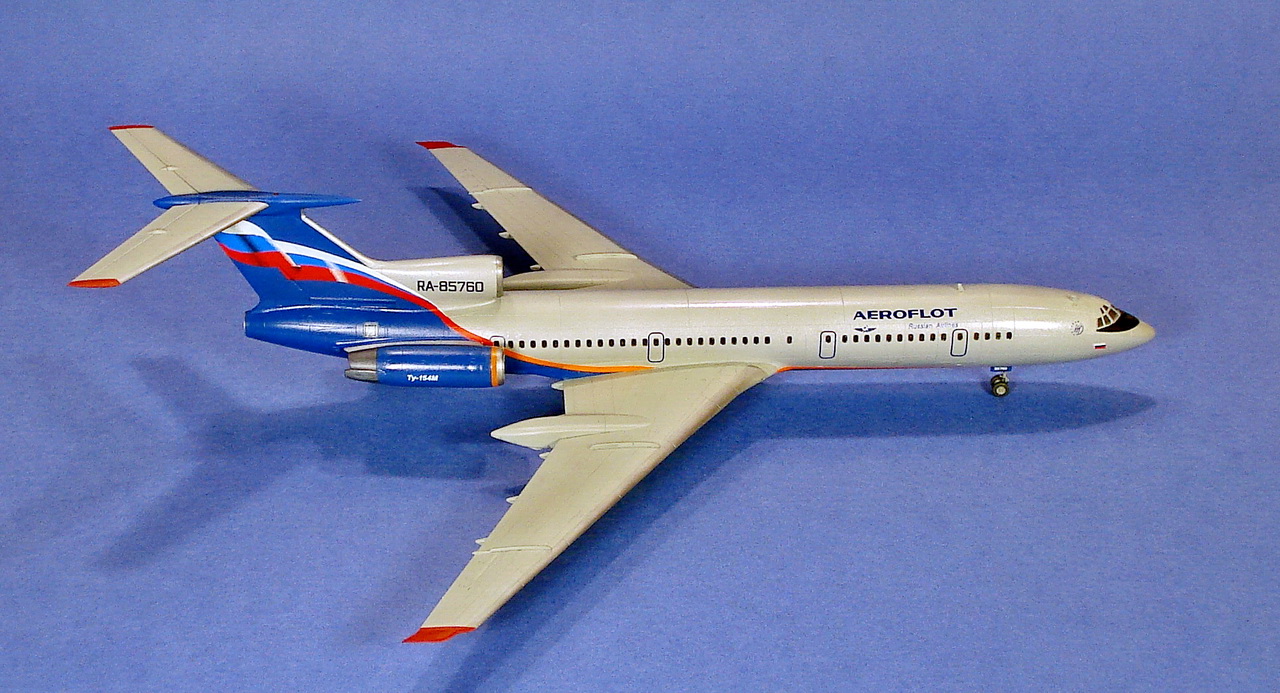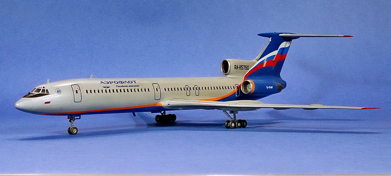 А вот с синим цветом был другой нюанс. Я конечно, не эксперт, но мне кажется, что "Звезда" ошиблась с цветом декали. На флаге у них получился очень темный синий цвет, практически темго-фиолетовый. И для того чтобы соблюсти разницу в цветах на флаге и киле ( как в реальности) пришлось бы киль делать еще темнее, что многие и делают. Я пошел другим путем.Я слегка подкорректировал саму декаль. Была у меня неиспользованная дека от "звездовского" 767-го ( делал другой авиакомпании).Там мне показался более правильный цвет.Вырезал его и "подогнал" под размер на ТУ-154. Так мне показалось будет лучше, чем почти черный киль. Вот, сделал маленький коллаж для сравнения. А оттенок,как известно, очень сильно зависит от освещения и ракурса.