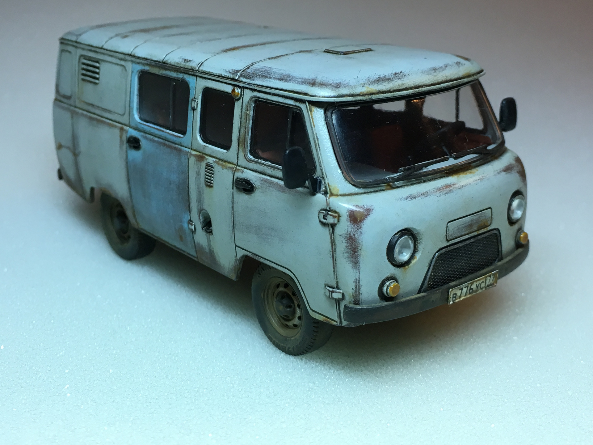 Буханка используется рыбаками и охотниками в плохо проходимых местах средней полосы нашей бескрайней Родины. Молярить её в лесу бессмысленно. От постоянного воздействия окружающей среды старая краска с неё потихоньку слезает, а постоянное обтирание бортами по кустам и камышам усугубляет этот процесс. Дверь, судя по всему, совсем плохо себя чувствовала и была заменена на первую попавшуюся (судя по всему тоже не новую). Левое заднее крыло прогнило насквозь, в последствии оно было выпилино и заклёпано листом нержавейки. Вот такая вот история...