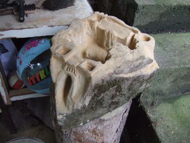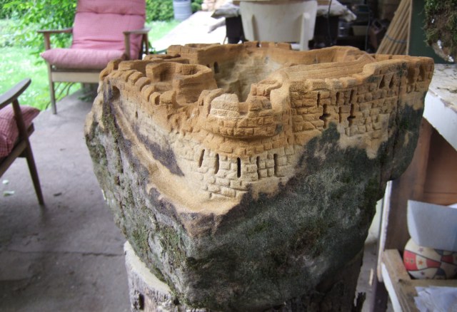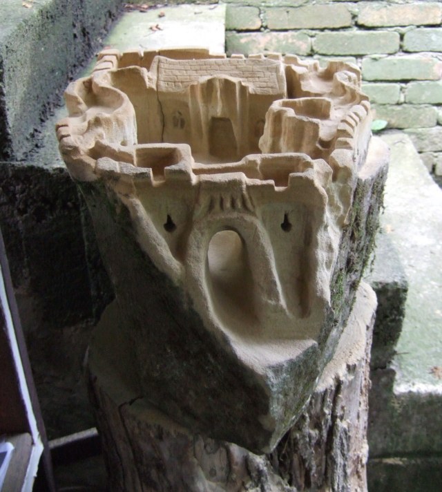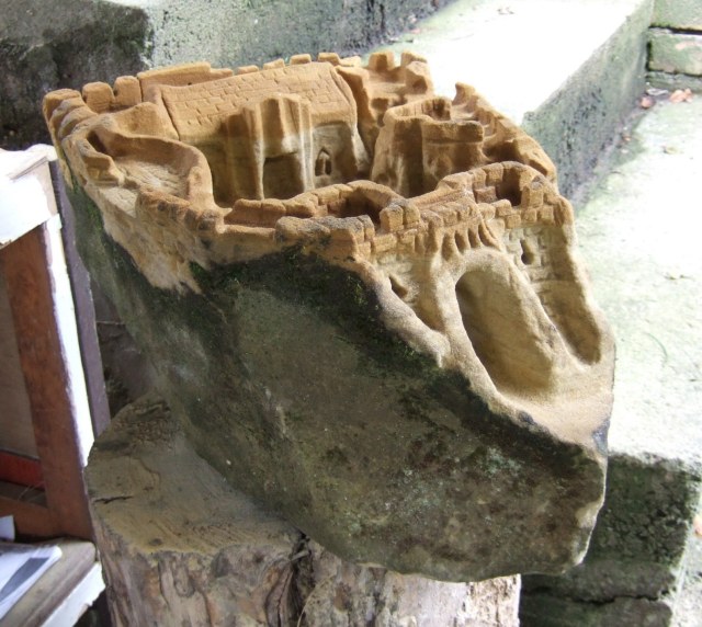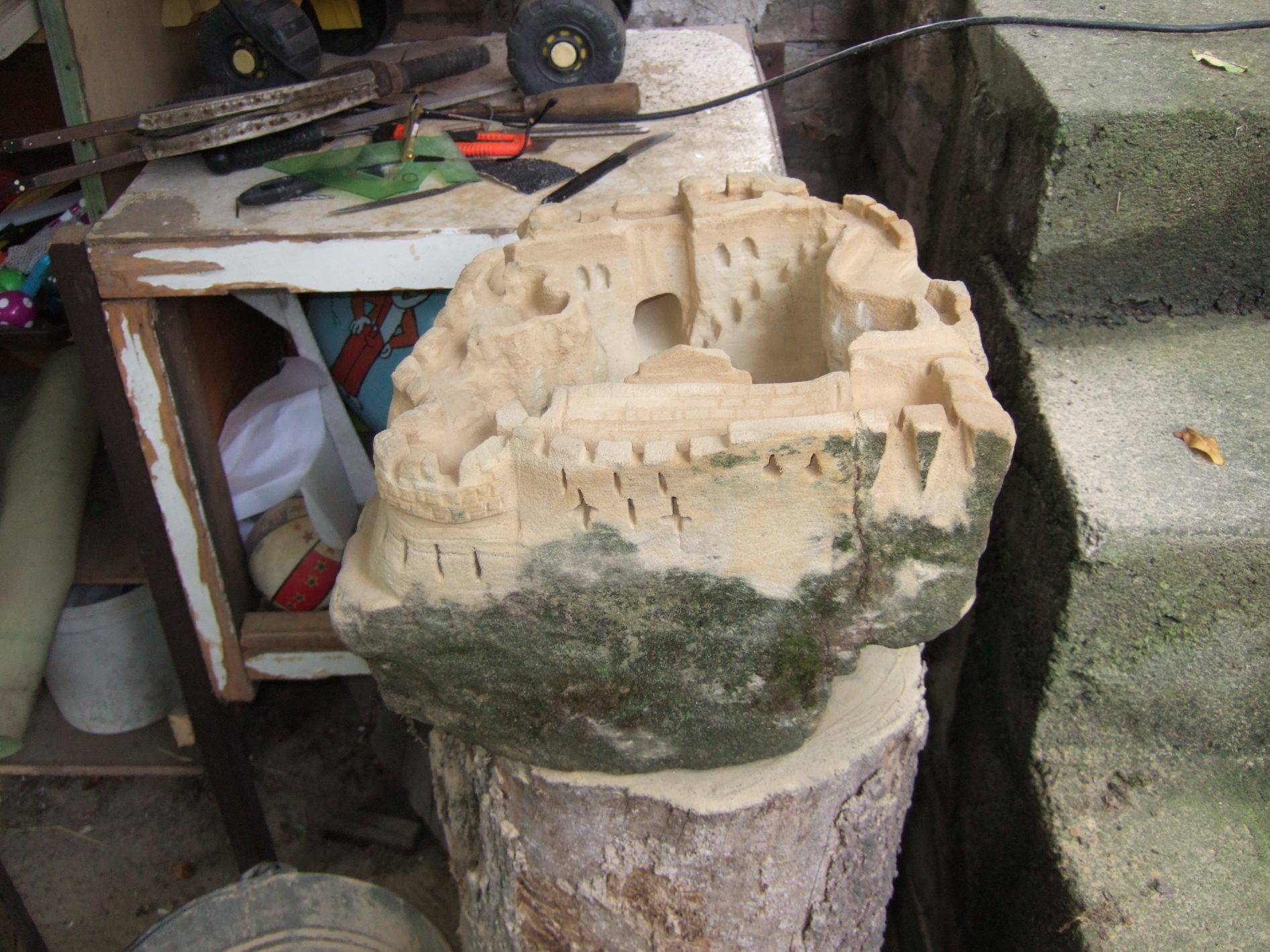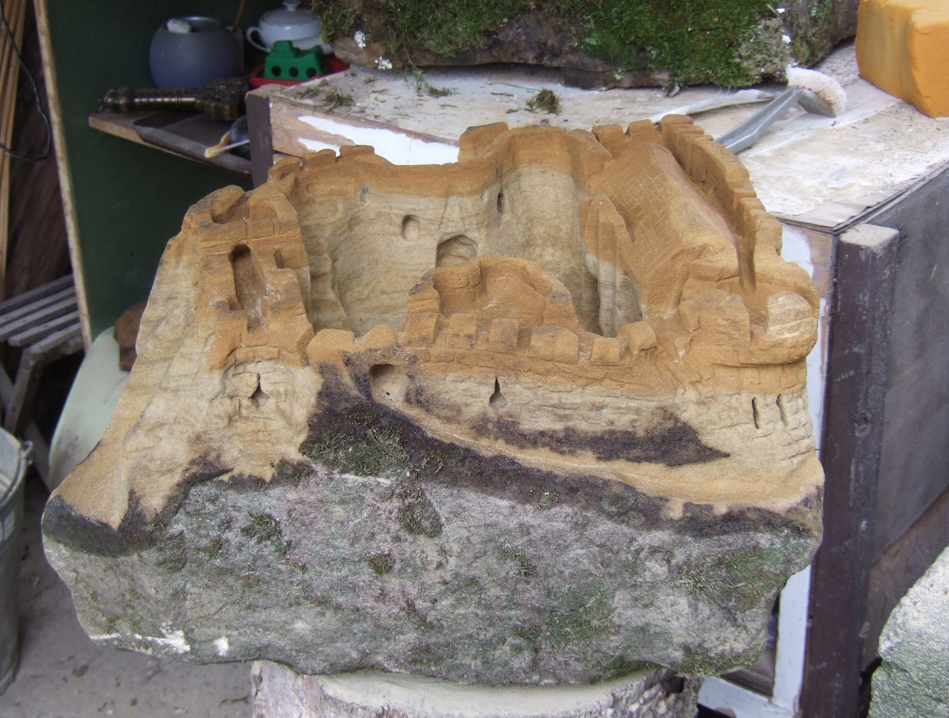I made this little castle before years as per my phantasy so can not say anything about scale. It was intended to stand at one of the little ponds on my garden For this castle model I used a block of sand stone. Reshape the stone I used mostly sharp tools and a drill with bigger diameter bits. I took that project like a preliminary for the next work - a bigger castle. Hope that could be inspiration for someone who likes medieval era.