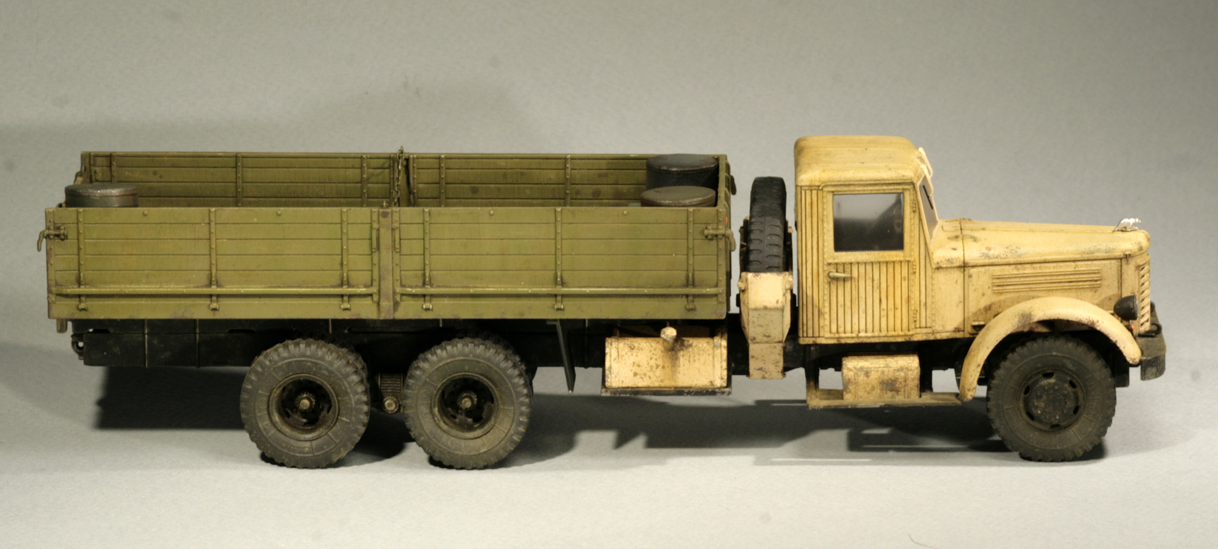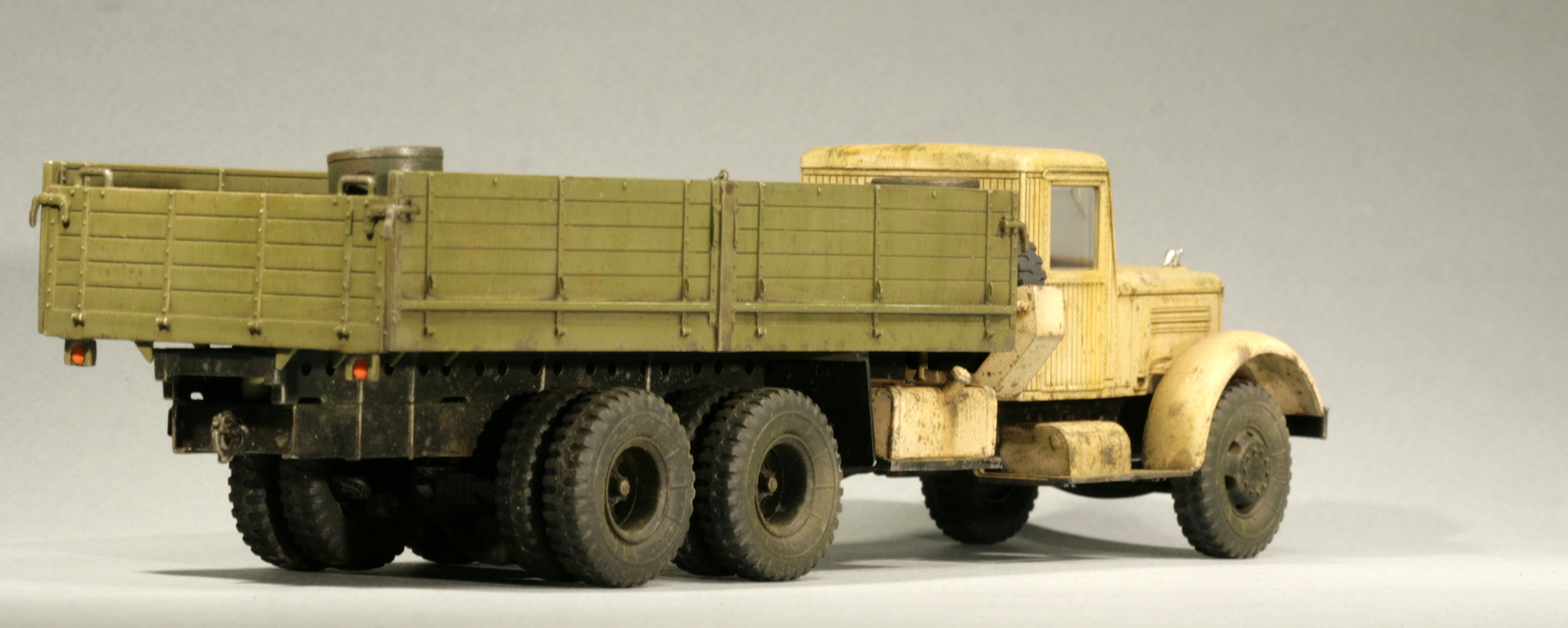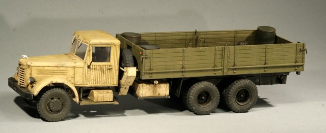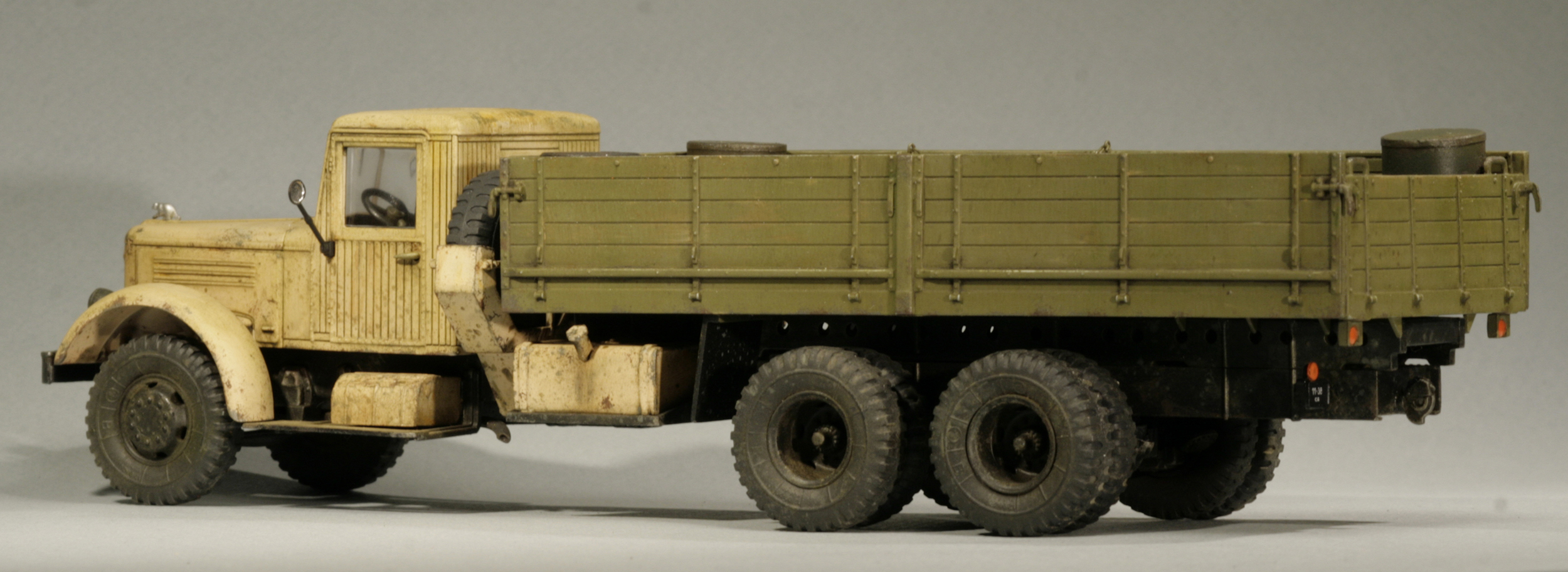 Сборка тут пошла совсем быстро. Сначала немного напутал с рычагами в кабине из-за жуткой инструкции, но потом поправил это. Зашпаклевал стыки на бензобаках, поставил лысые покрышки от НАМИ внутрь задних мостов, покрасил отражатели фар маркером от Молотова.