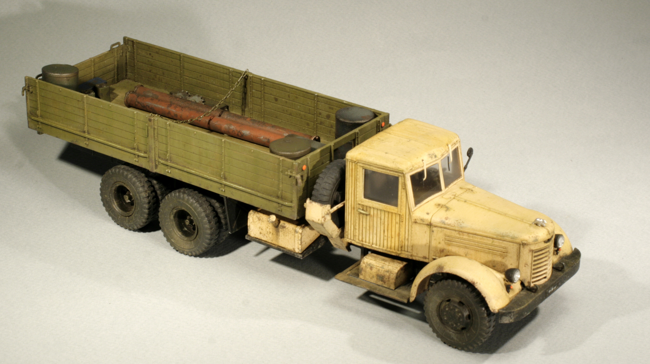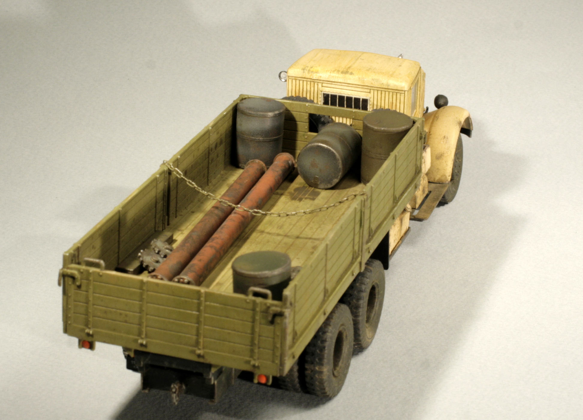 Бочки из корпуса фломастера, цепь самодельная,трубы из каких-то трубочек, остальное из запасов. Собрал, покрасил и поставил в кузов. Пустовато, но что есть.