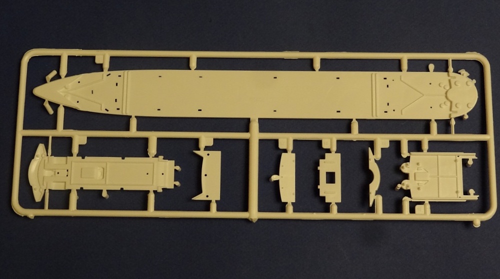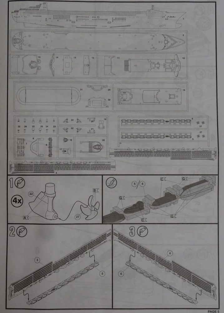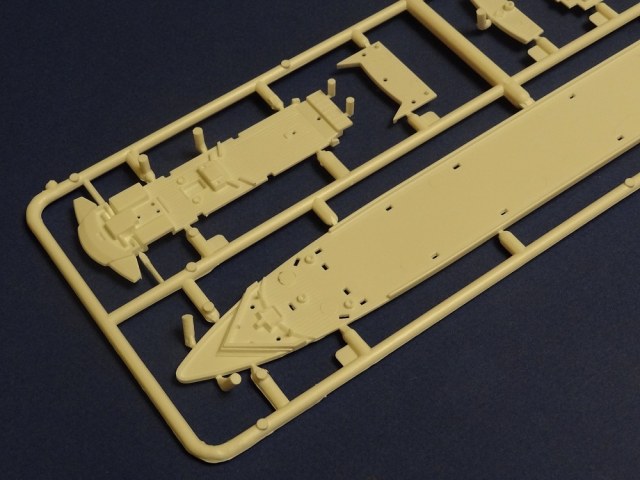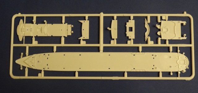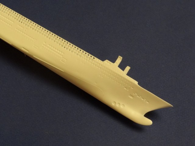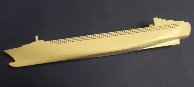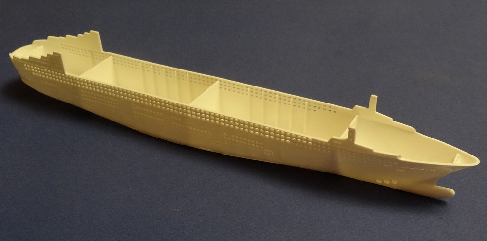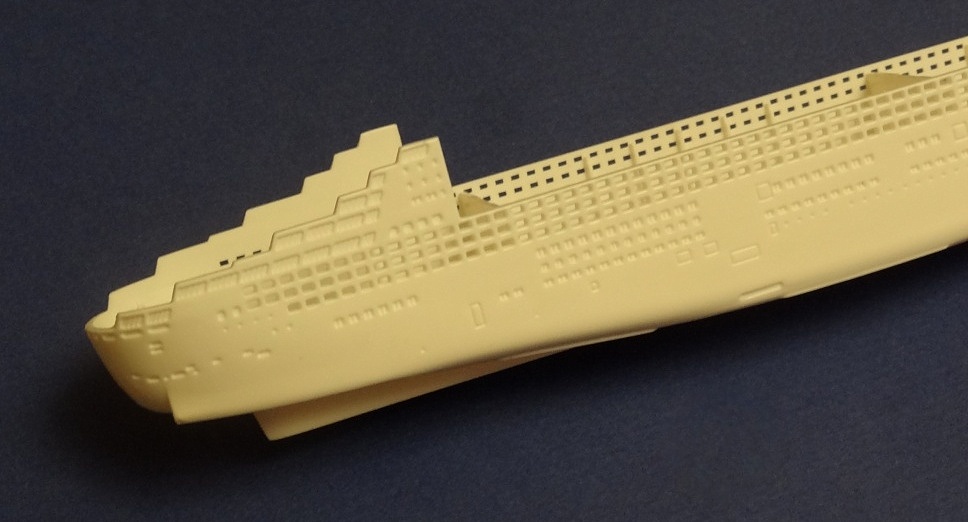 Корпус судна отлит одной большой монолитной деталью. Корпус отлит хорошо: облой не обнаружен, толкатели или следы от пресс-форм отсутствуют. Иллюминаторы сделаны не сквозными, то же самое и с подруливающими винтами(которые вообще не отлиты) в носовой части судна. Все спасательные средства отлиты всего на двух деталях. На палубе сделана имитация древесины, но смотрится немного "замылено". У гребных винтов большая толщина, нужно стачивать до оптимальной толщины. В набор входит подставка под модель.