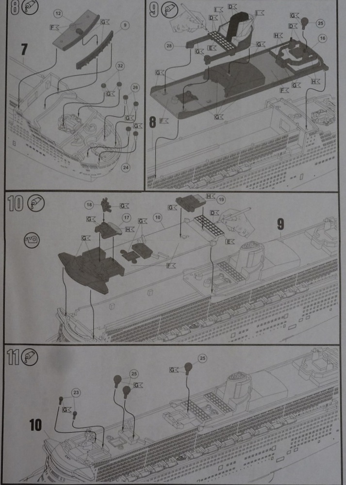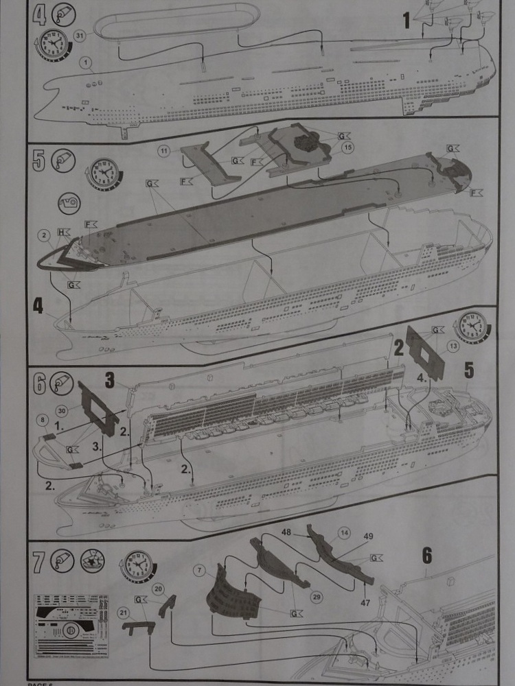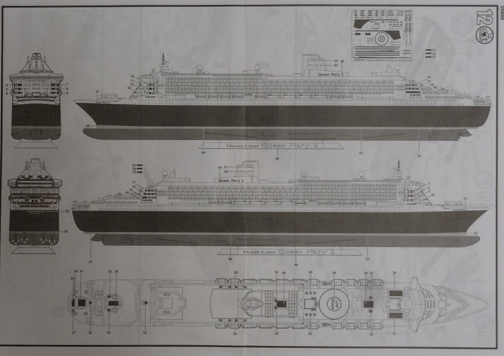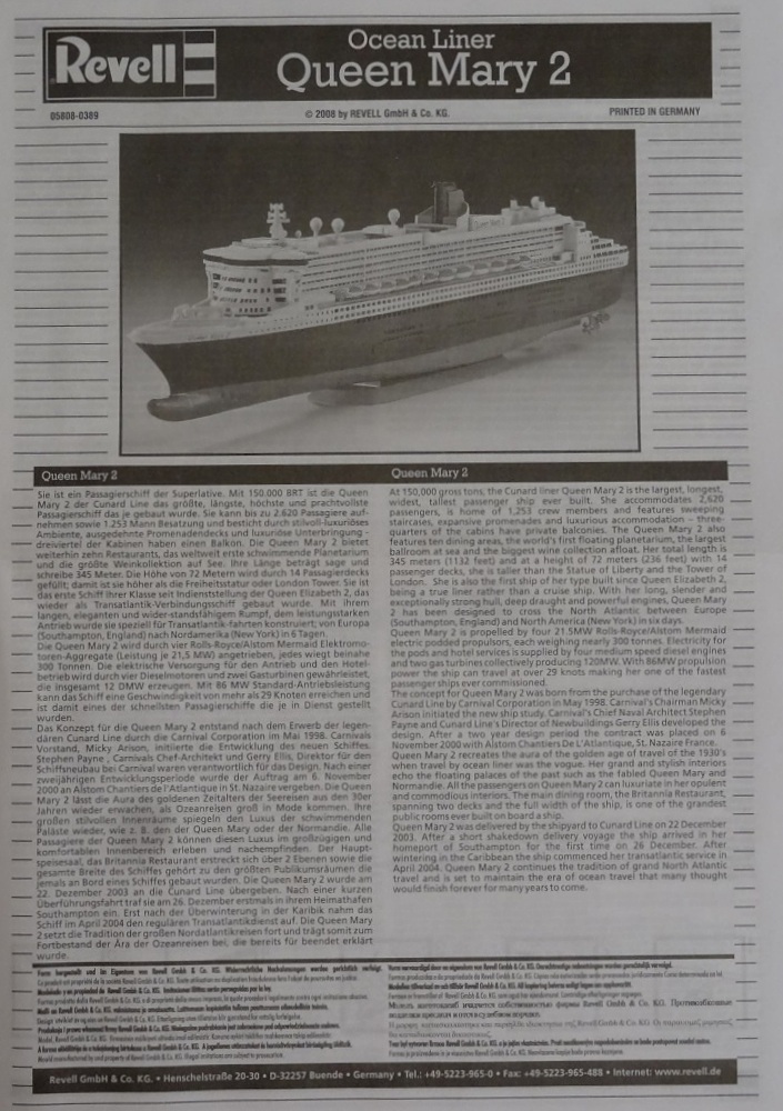 Инструкция выполнена в традиционном стиле от Revell. На первой странице есть небольшая информация о лайнере. Процесс сборки поэтапный(всего 12 этапов). Хорошо показано куда нужно наносить декали.
