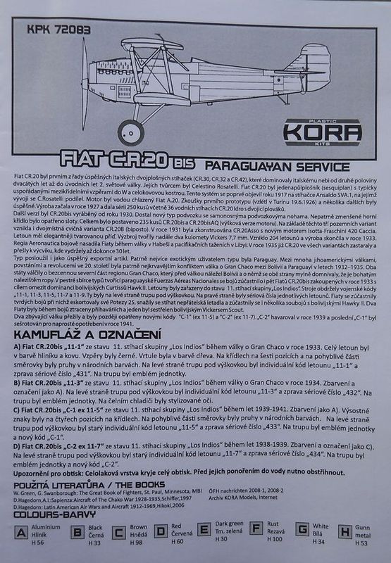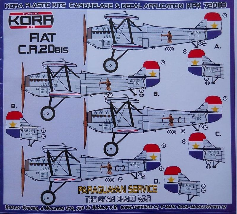 Модель от Kora из пластика в масштабе 1/72 (номер по каталогу 75083). Картонная коробка с верхним открытием. Качество литья не самое лучшее для современного ЛНД. Одни и те же литники идут у производителя на разные наборы, основное отличие в которых: декали и дополнительные смоляные детали. В данном наборе представлен FiatCR.20 bis. Присутствует одна деталь из смолы. Ветровой козырёк кабины выполнен из прозрачной смолы. Декаль даётся на четыре варианта самолёта и выглядит отлично. На ней имеется приборная доска. Инструкция достаточно информативна и наглядна.