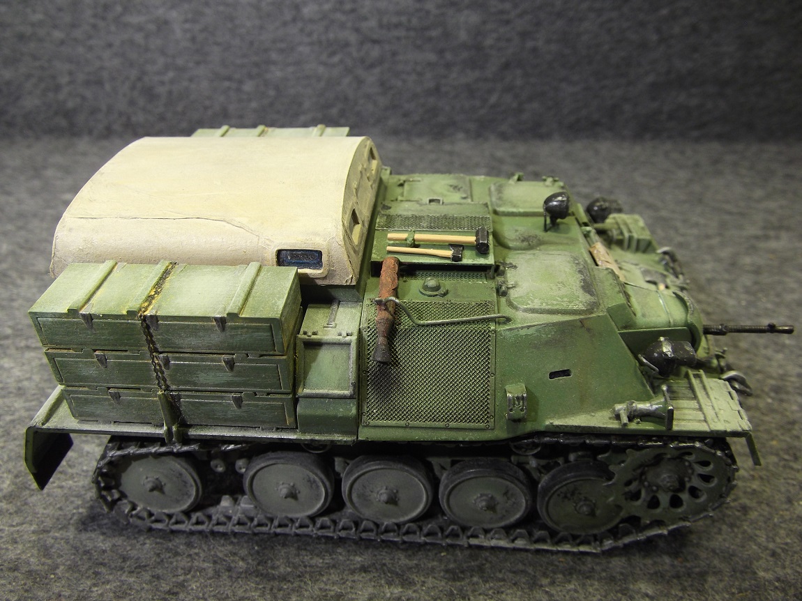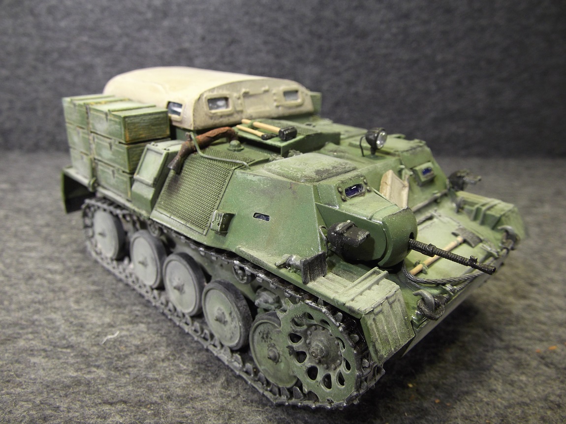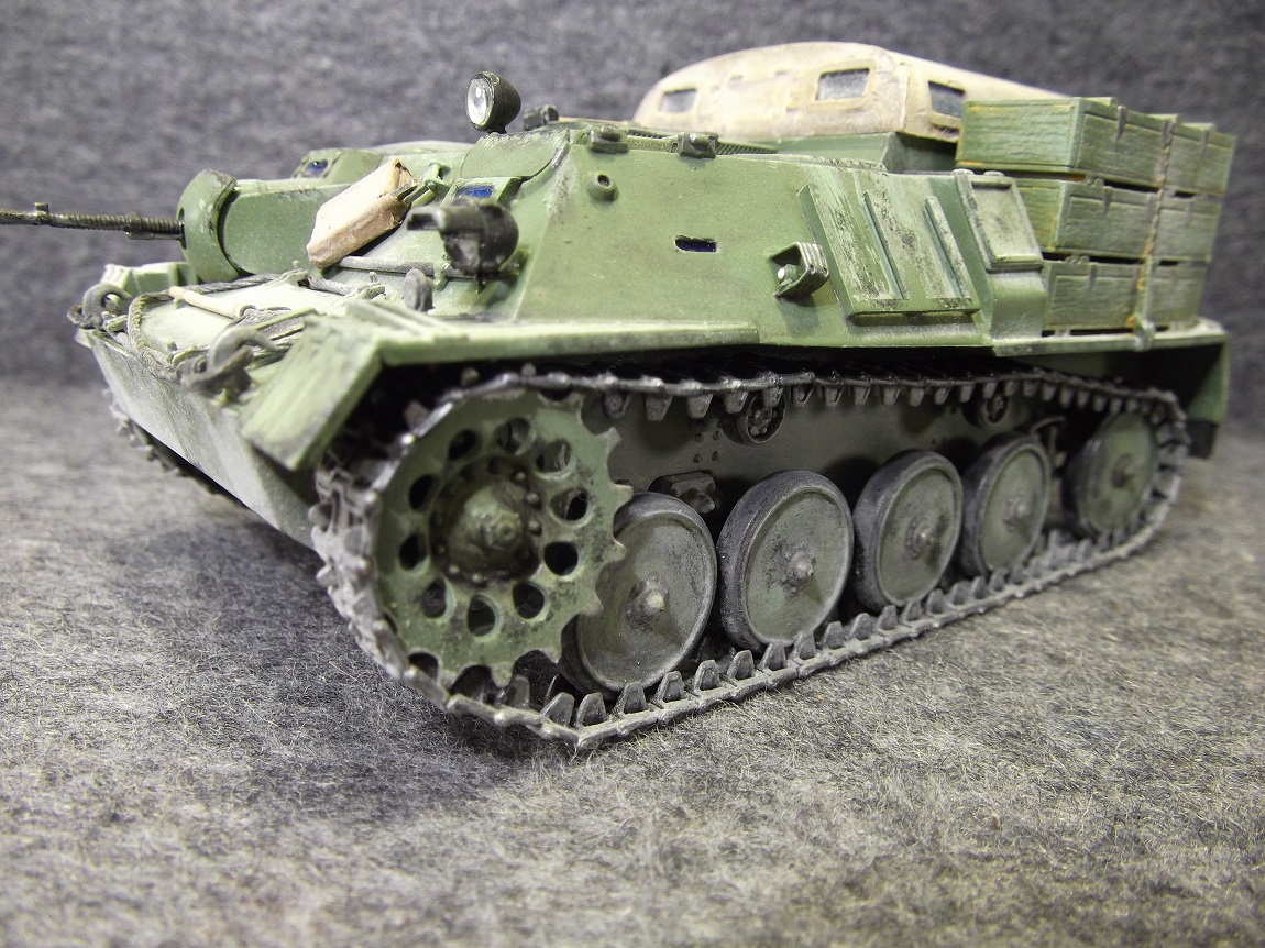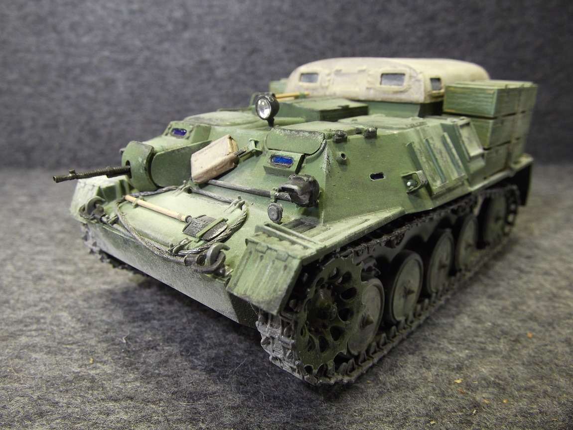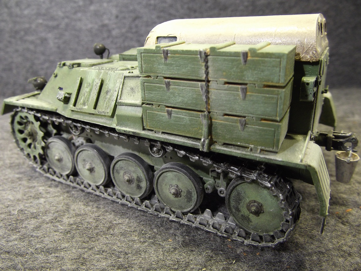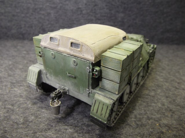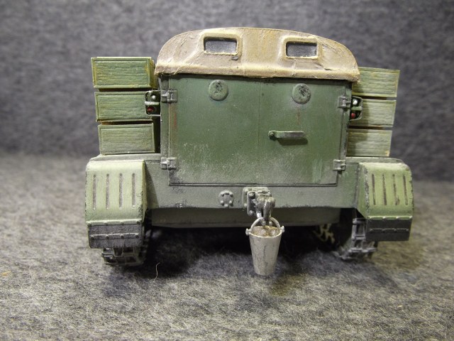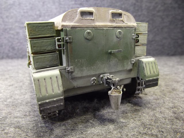 Теперь по самой модели. Довольно много мелких деталей, да и модель небольшая, длиною 11 см. Стыковка хорошая, качество литья тоже. Использовал две платы травления.Поменял фару, сделал буксировочный трос. Изготовил чехол с защитным колпаком механика-водителя. Сзади на крюк просилось добавить ведро. Доработал тент и добавил спинки сидений. Не нашел металлических траков. Пришлось помучится, на сколько мог сделать хоть какие-то провисы. Краска, смывки, масло, пигменты как обычно. Немного добавил пыли. Вроде все.