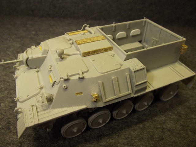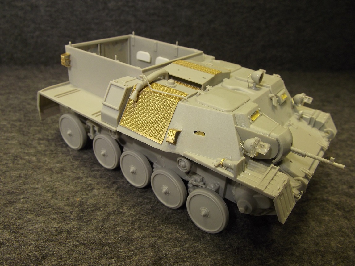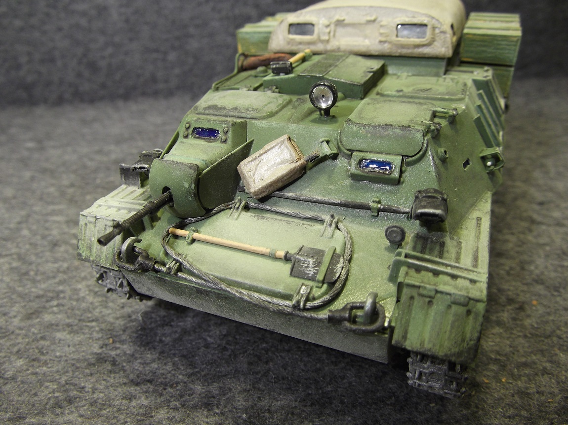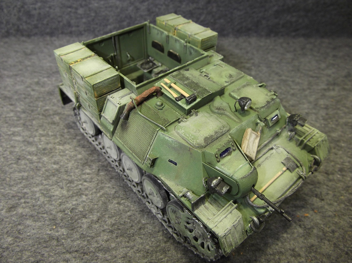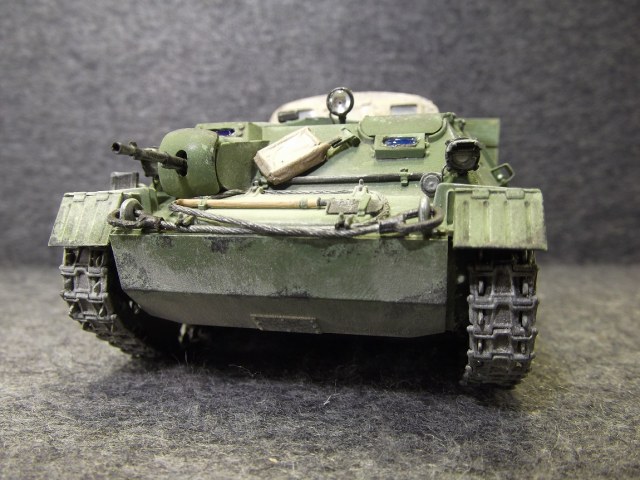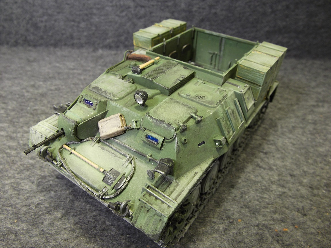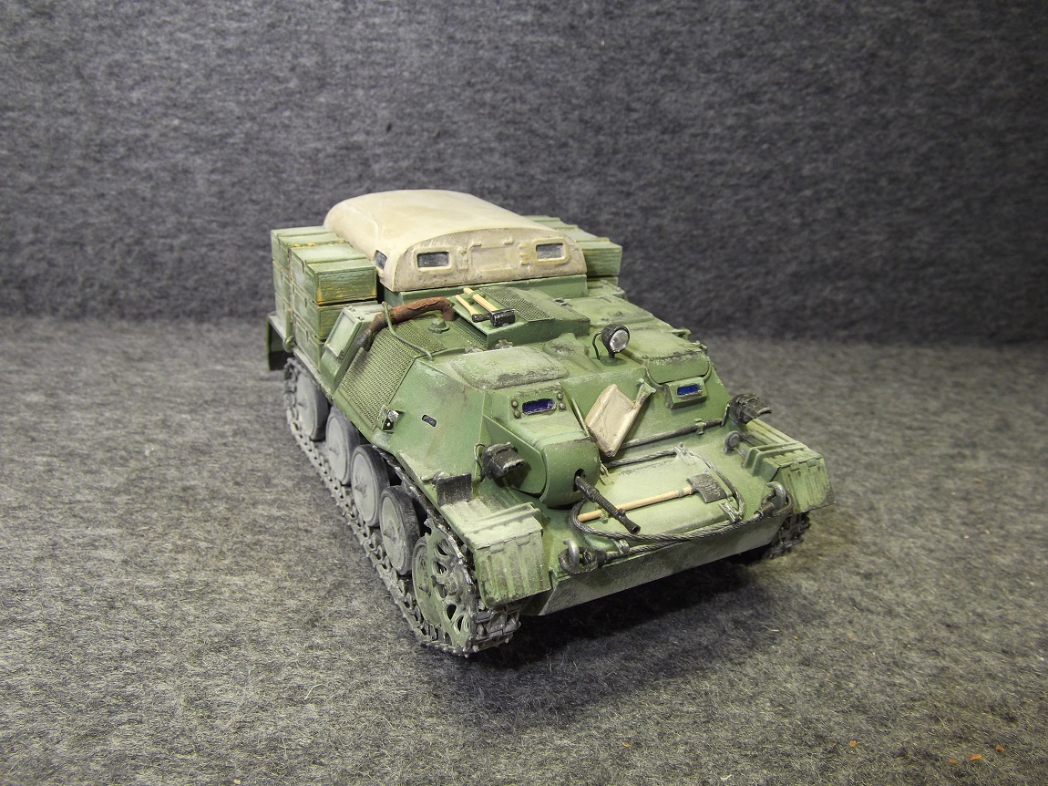 Теперь по самой модели. Довольно много мелких деталей, да и модель небольшая, длиною 11 см. Стыковка хорошая, качество литья тоже. Использовал две платы травления.Поменял фару, сделал буксировочный трос. Изготовил чехол с защитным колпаком механика-водителя. Сзади на крюк просилось добавить ведро. Доработал тент и добавил спинки сидений. Не нашел металлических траков. Пришлось помучится, на сколько мог сделать хоть какие-то провисы. Краска, смывки, масло, пигменты как обычно. Немного добавил пыли. Вроде все.