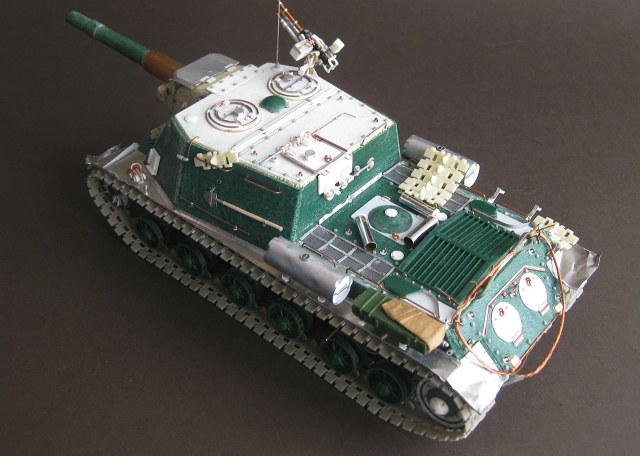 Модель начал собирать с сыном а заканчивал уже сам.Я да же и не знаю стоит ли рассматривать это как модель.Скорее как игрушку.Я не ставил целью сделать полноценную самоходку в 30-м масштабе поэтому катки оставил "родные".