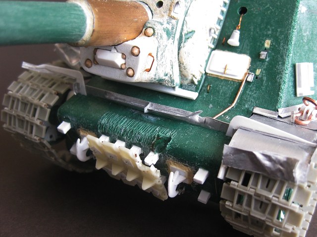 Пару слов о сборке.Все доработки сделаны из листового пластика,жести .проволки и других подручных материалов.Хочу остановится на траках они рабочие и модель можно катать.По моим чертежам была сделана 3D-модель.Выращены на 3D-принтере три трака и перелиты в смоле.Затем траки соединил "пальцеми" из проволки