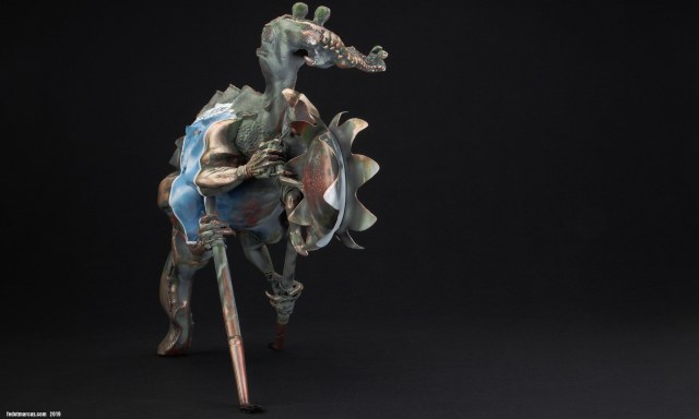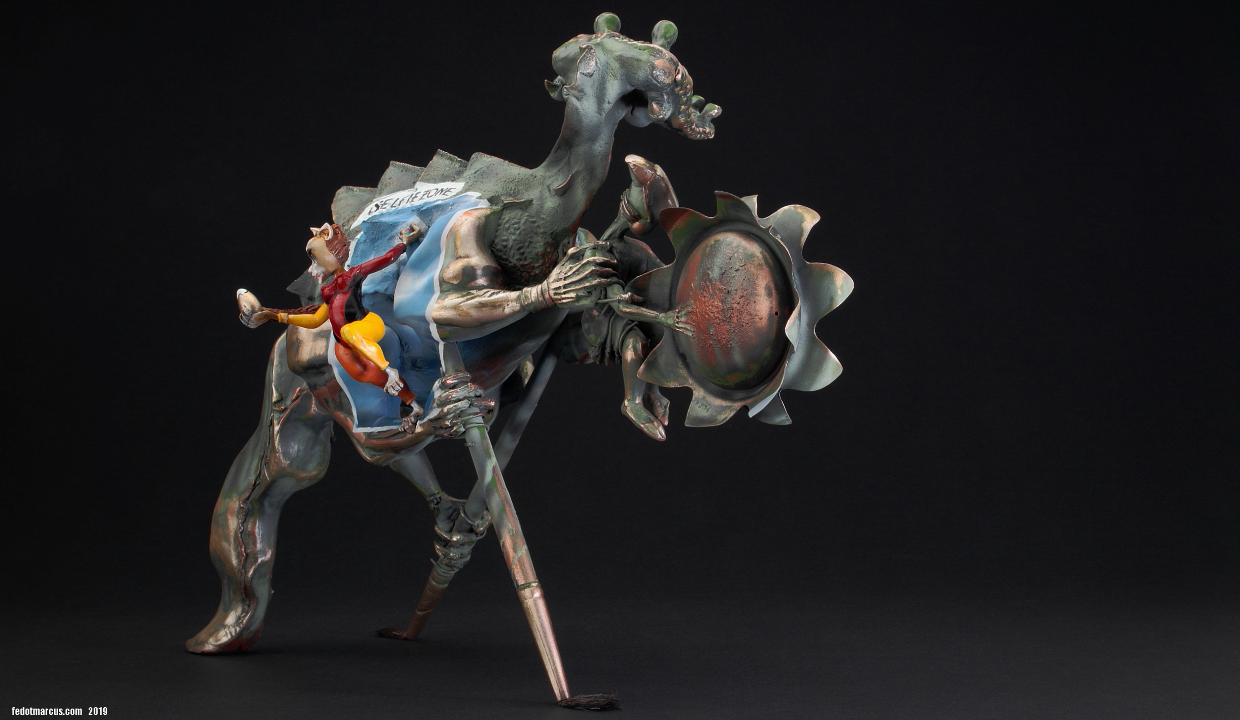 Модель сделана в виде бронзового памятника древнеегипетскому богу Себеку, несущего в руках-лапах проточеловека-ребенка, который оберегает Солнце. Прототипом стали легенды, связанные с данным персонажем. Чтобы уравновесить композицию по правому борту было решено добавить объект, не являющийся частью памятника – рыжую Котейку, у которой, как известно, девять жизней, и она гуляет сама по себе)