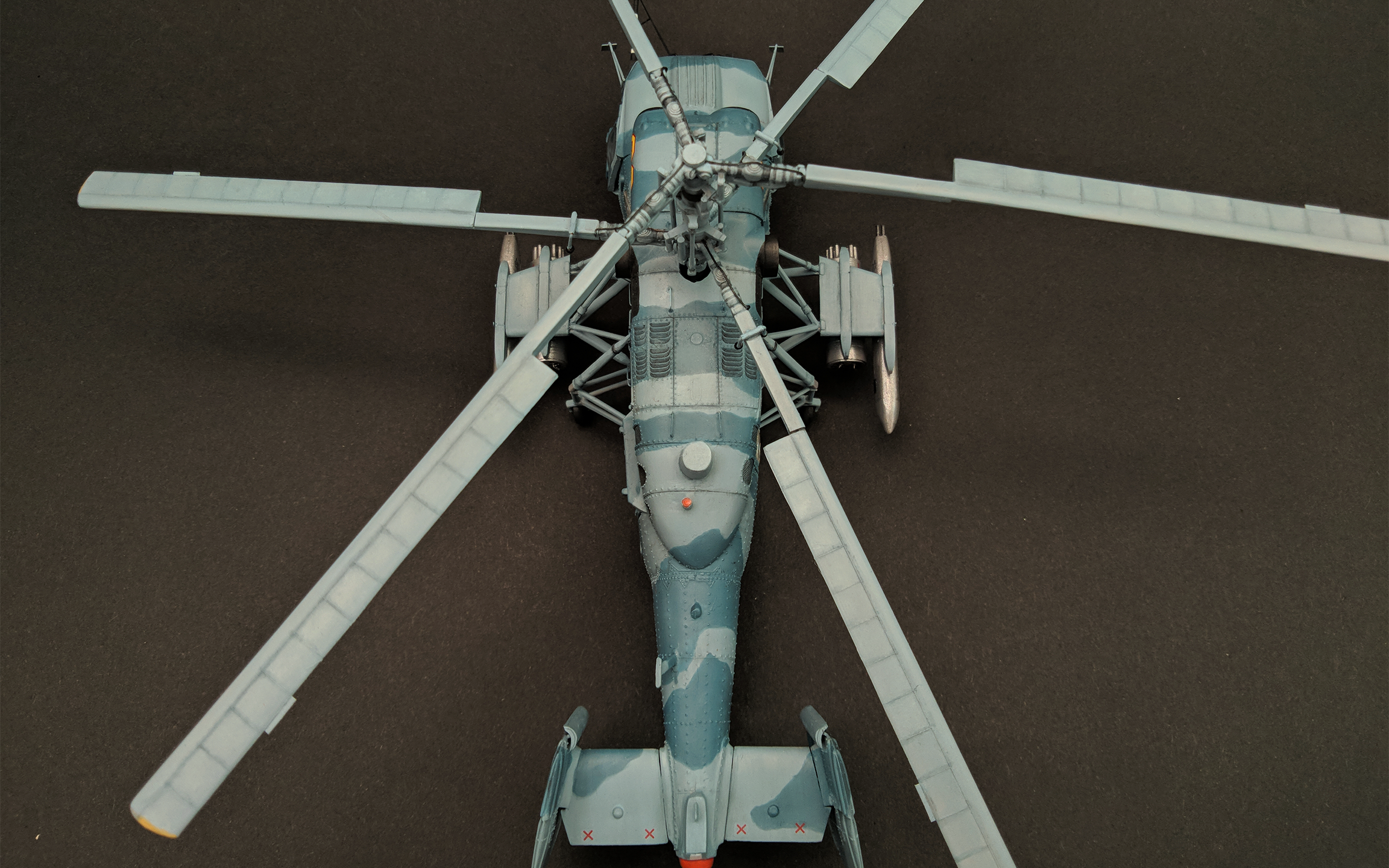 В итоге что сделано: поручни заменил на проволоку, "присадил" задние стойки шасси, добавил небольшой провис лопастей, рассверлил стволы, также добавил проблесковые огни на днище и на крыше, фары, всякие распорки, зеркала, контейнеры УПК-23 из набора Ми-24, несколько деталей в кабине и ещё несколько мелочей, назначение которых я не понял, так как не вдавался в матчасть))