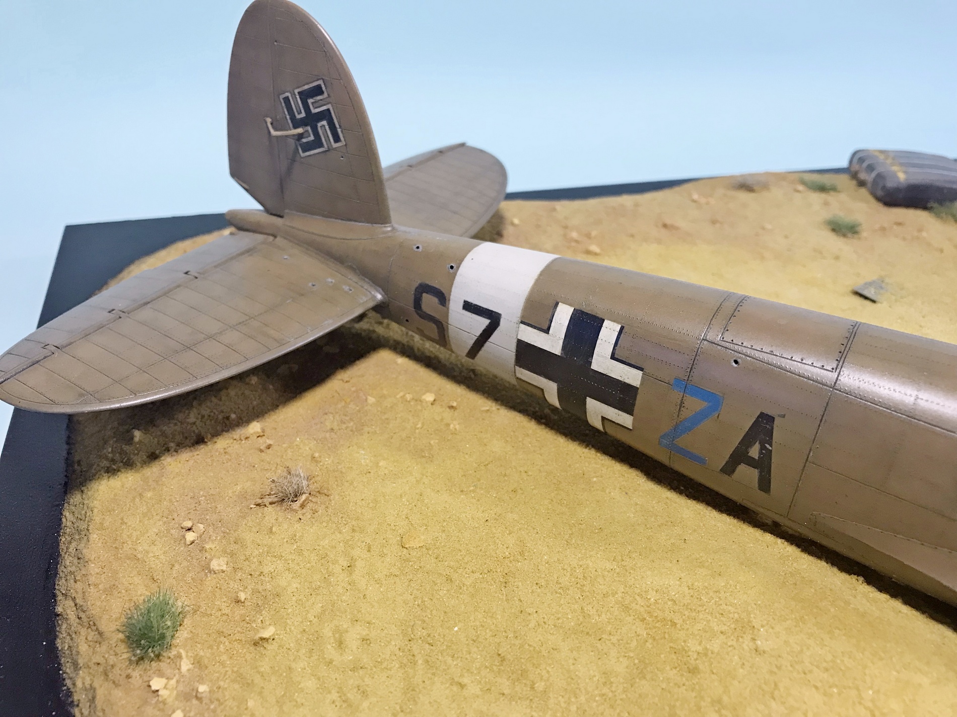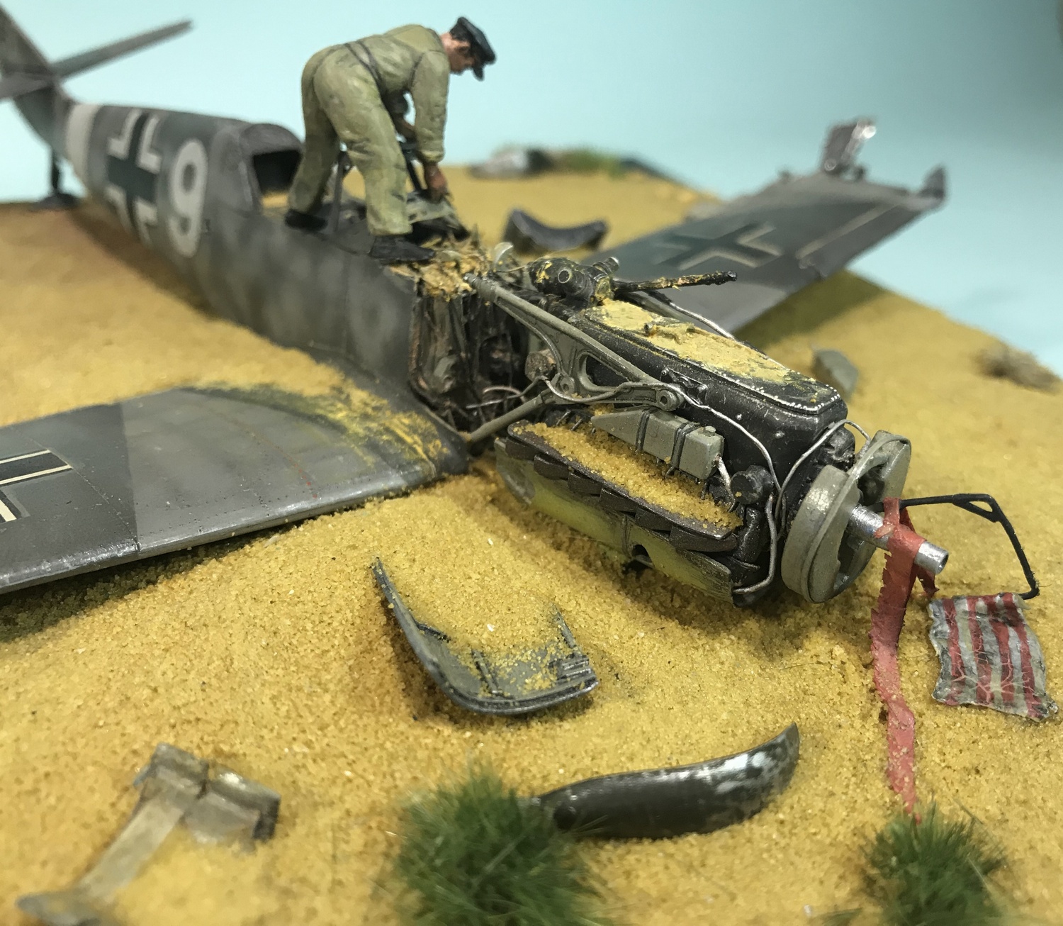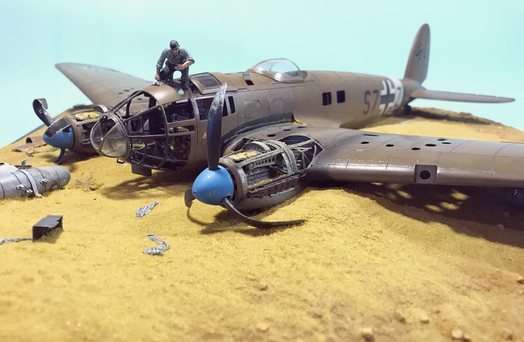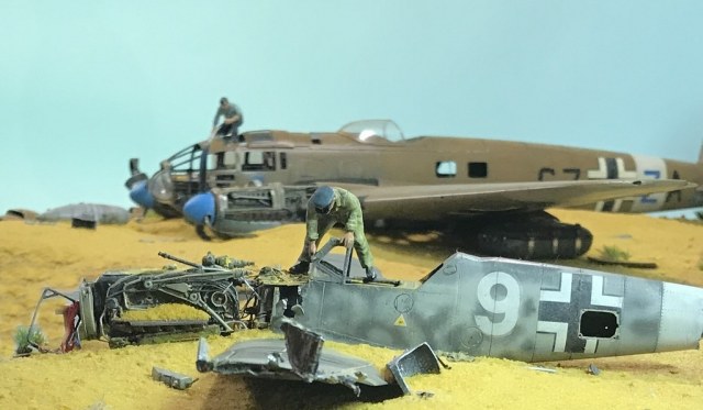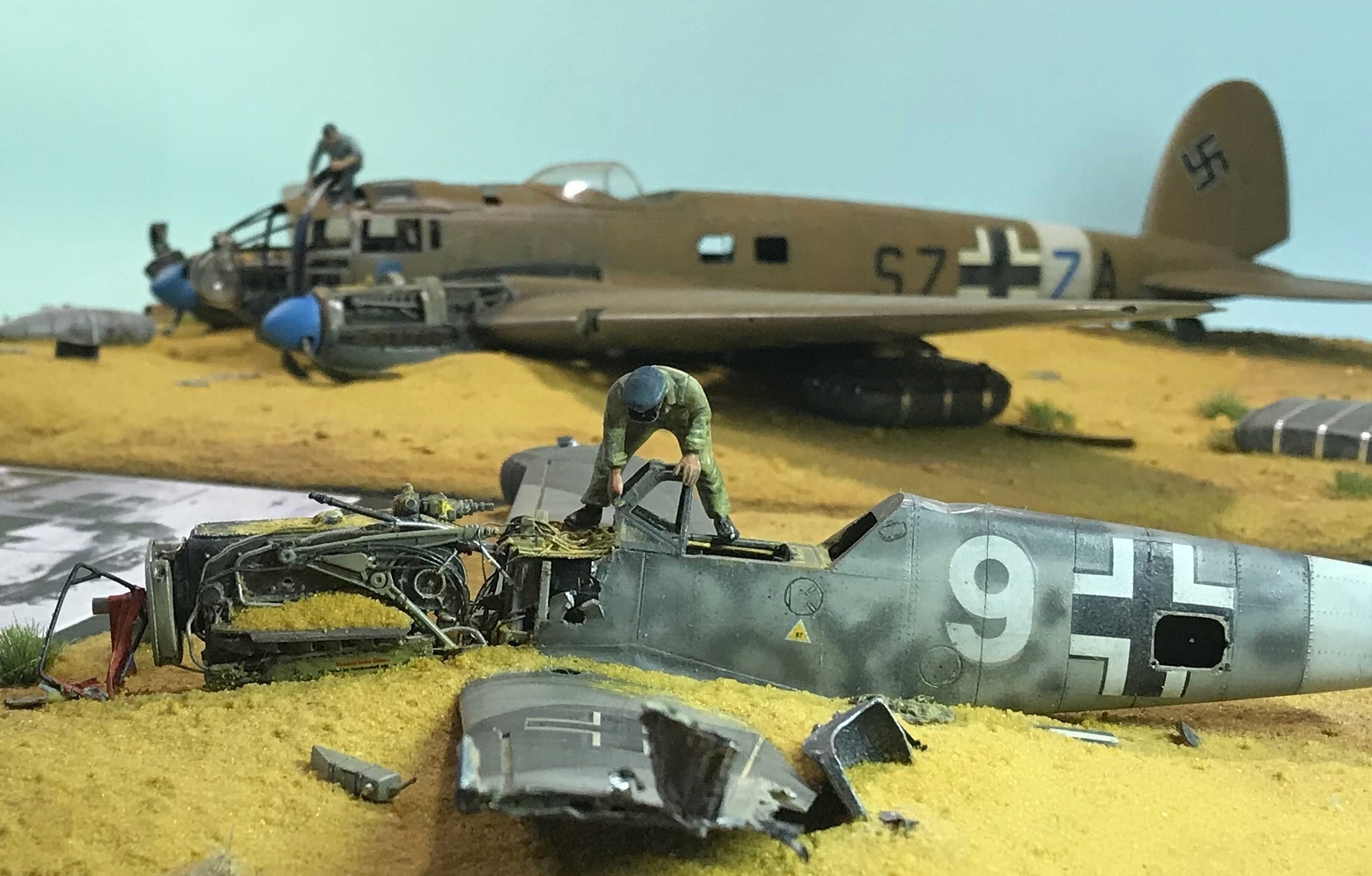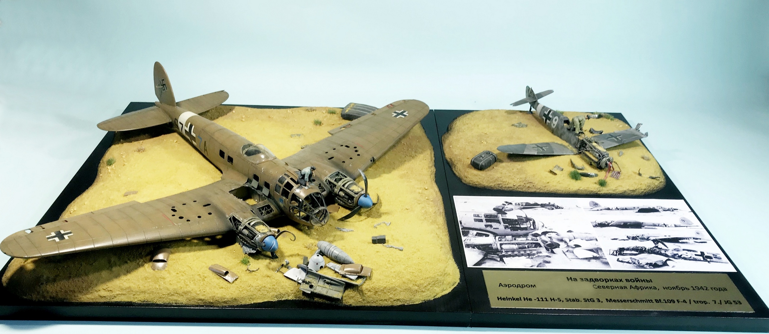 Представляю модельному сообществу фотографии моей очередной диорамы. Стройка продолжалась на протяжении всего 2018 года с небольшими перерывами. За основу были взяты фотографии, сделанные в Египте в 1942 году. В качестве доноров для этого "металлолома" послужили модели Не-111 Н-3 от фирмы "ИСМ" и Bf.109 F-2 от фирмы "Звезда". Обе модели уже хорошо известны, отличного качества и поэтому в отдельном представлении не нуждаются. Сильно загружать информацией по строительству диорамы не буду. Тем кому это интересно могут посмотреть весь этот процесс здесь: : http://scalemodels.ru/articles/12831-He-111H-5-i-Bf-109F---na-zadvorkakh-bolshojj-vojjny.html