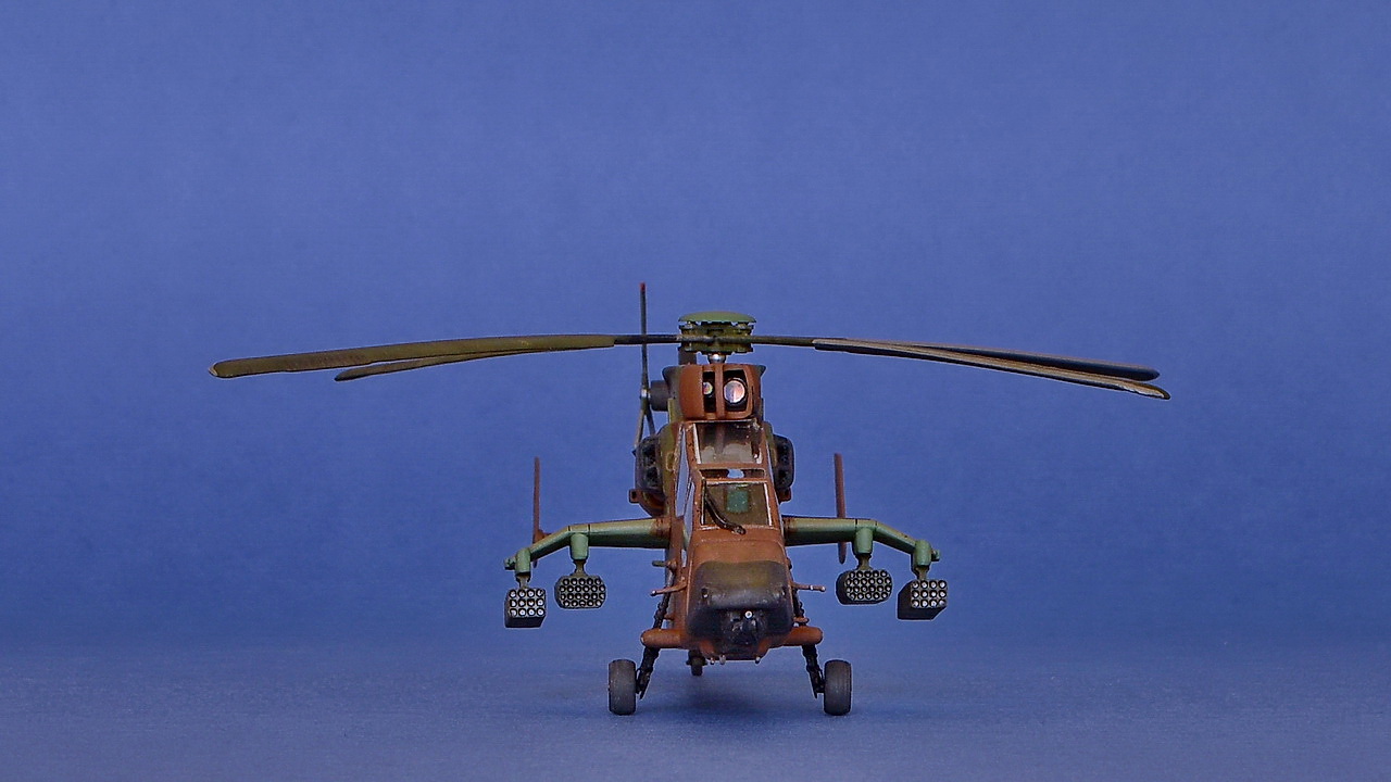Это-да!. Но это, скорее, вопрос к производителю модели: чем они руководствовались, когда сделали именно так, а не как положено. Равно как и основные стойки, капот двигателя,выхлопные сопла двигателей, хвостовая балка, лопасти несущего винта, 30-мм пушка и т.л. и т.п...В описании к модели я упомянул,что некоторые детали не соответствуют оригиналу: рулевой винт, как раз, из них...В глубокий "перепил" с этой моделью уходить не собирался. Не тот случай и не та модель ( очень многое пришлось бы исправлять и менять). Для меня было важно попробовать.