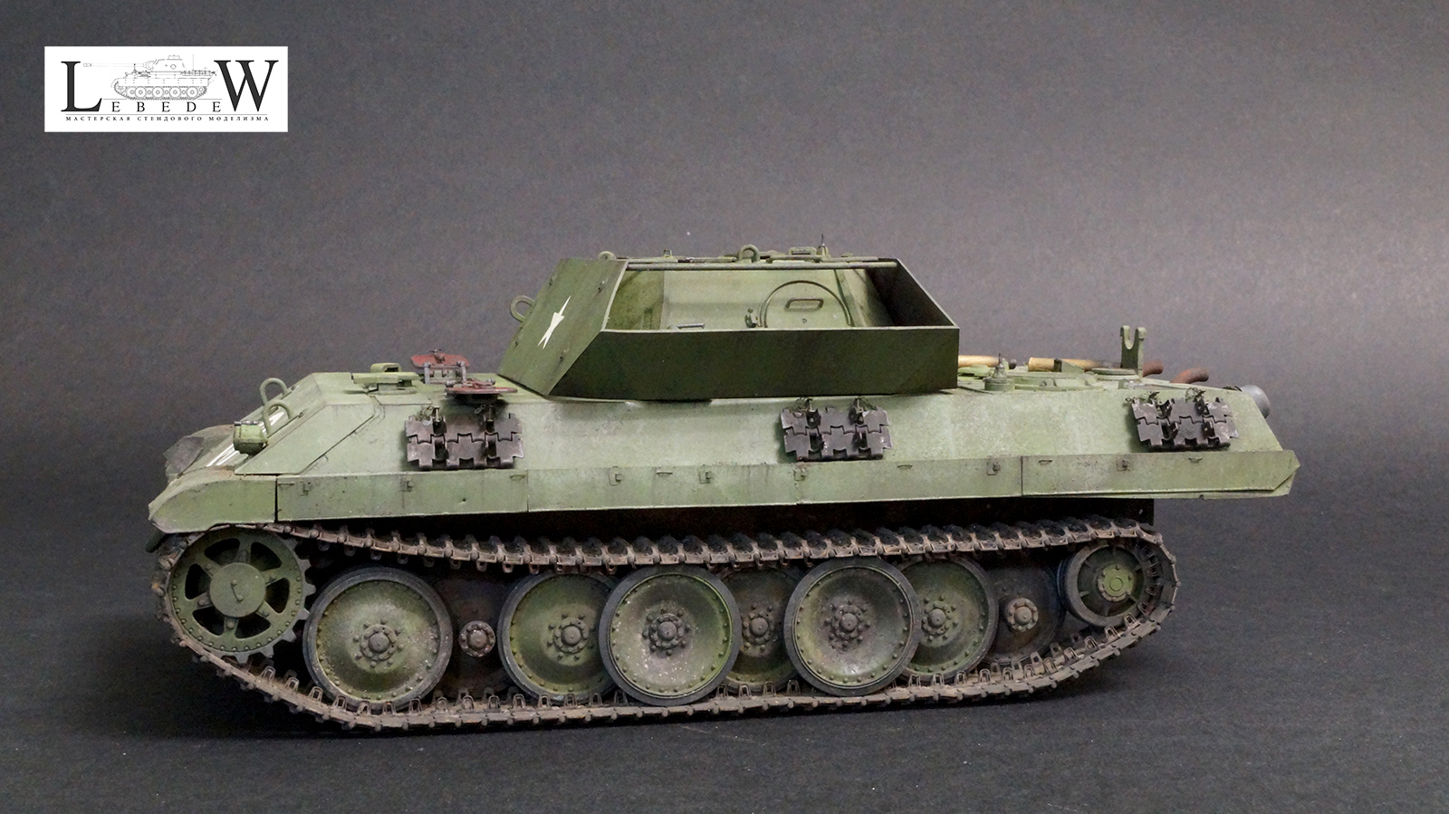 В процессе окраски была безвозвратно утеряна одна декаль. Пластик фальшбортов башни и кормы был весь кривой, так что пришлось попотеть со сборкой. Модель дополнена моей импровизацией в виде отсутствующего дульника, убрал несколько катков, повесил трос и каску. На модели присутствует цветомодуляция, но это для придания эффектности, выцвести он просто бы не успел.