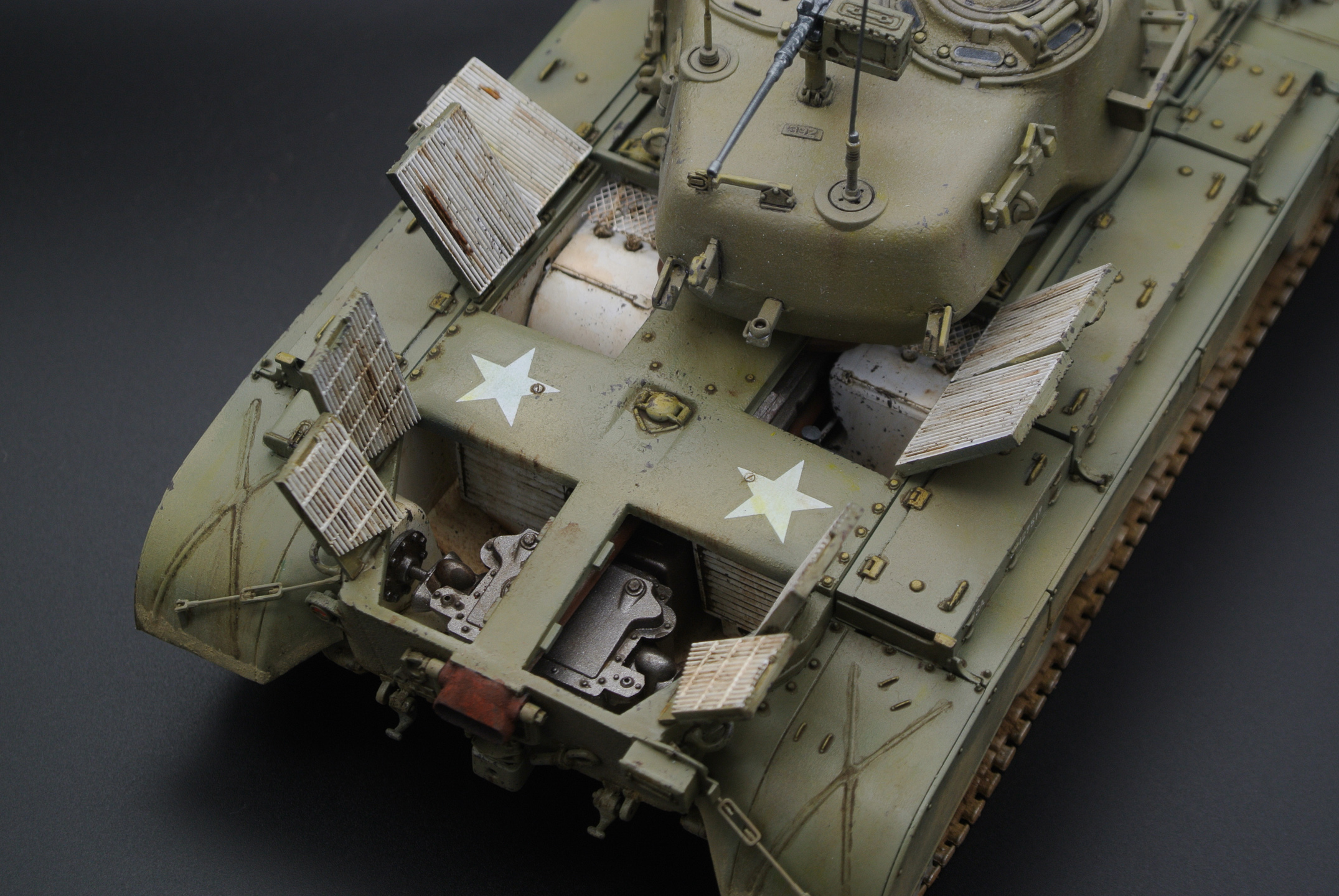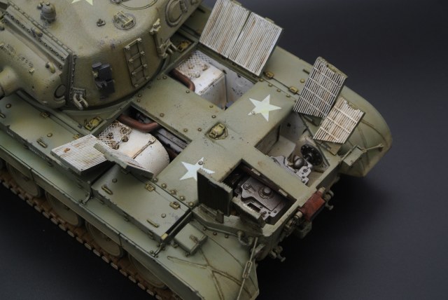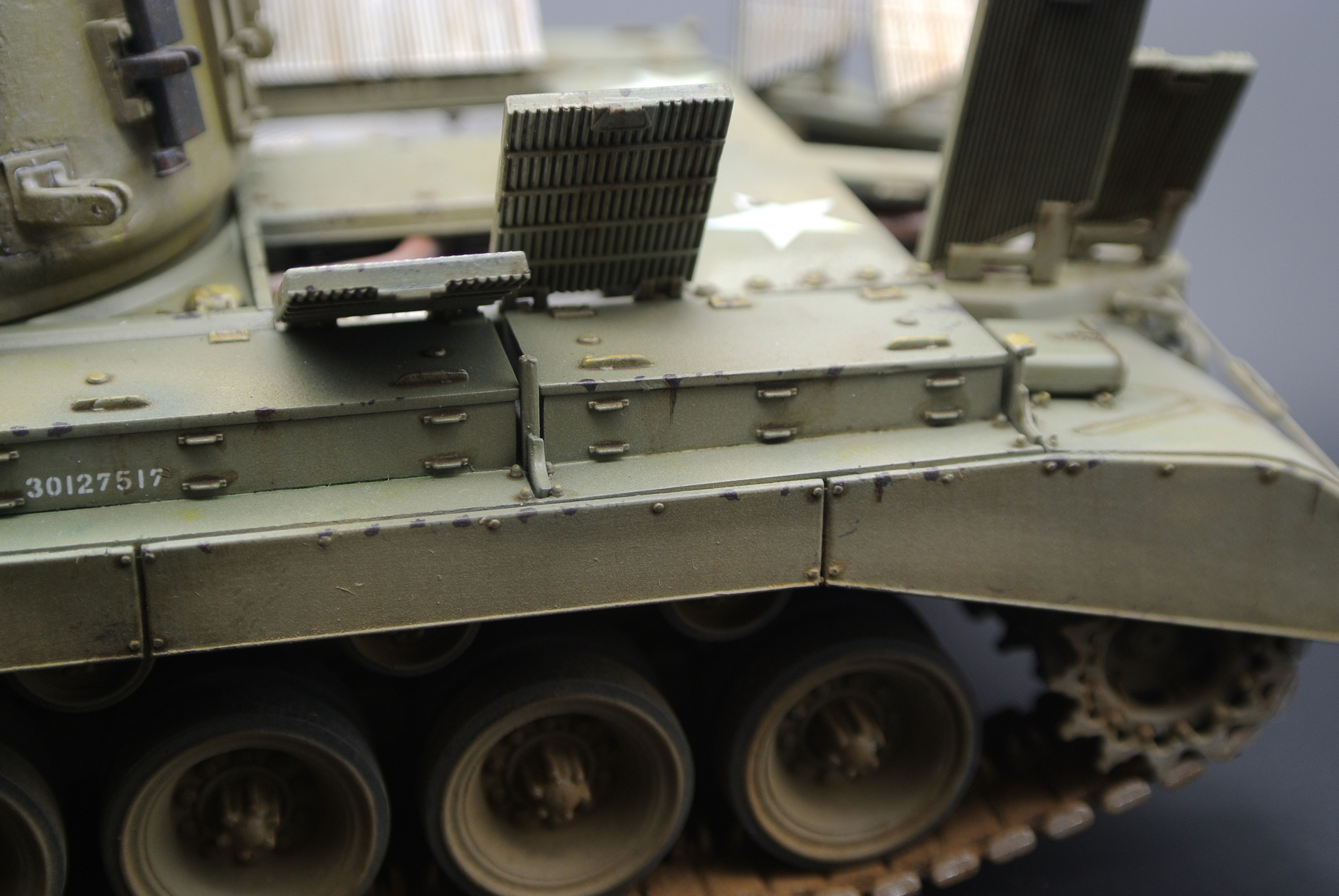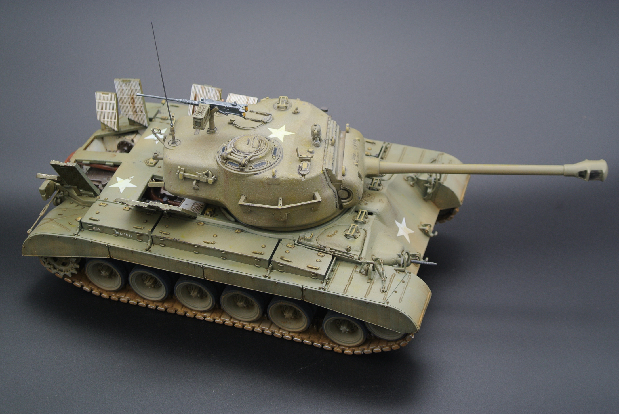 По модели: неплохая детализация, литье без утяжин, показан небольшой интерьер, хрупкие детали упакованы на литниках мягким материалом, цена всего 1500 р. примерно в Леонардо (сейчас в других местах эта модель примерно 2000 стоит). Из минусов - виниловые гусеницы (прошлый век уже!) с ужасным швом по торцу, которые даже суперклеем не клеятся, отсутствие прозрачных деталей, смещение прессформ, особенно заметное на мелких деталях, стыкуемость 4/5. Платка травла могла бы быть и побольше - всего 2 детали сеток для интерьера МТО. Еще один минус (для меня, по-крайней мере) - гусеницы даны послевоенные, хотя сама модель могла бы заявляется как M26 (T26E3), т.е. без послевоенных модификаций.