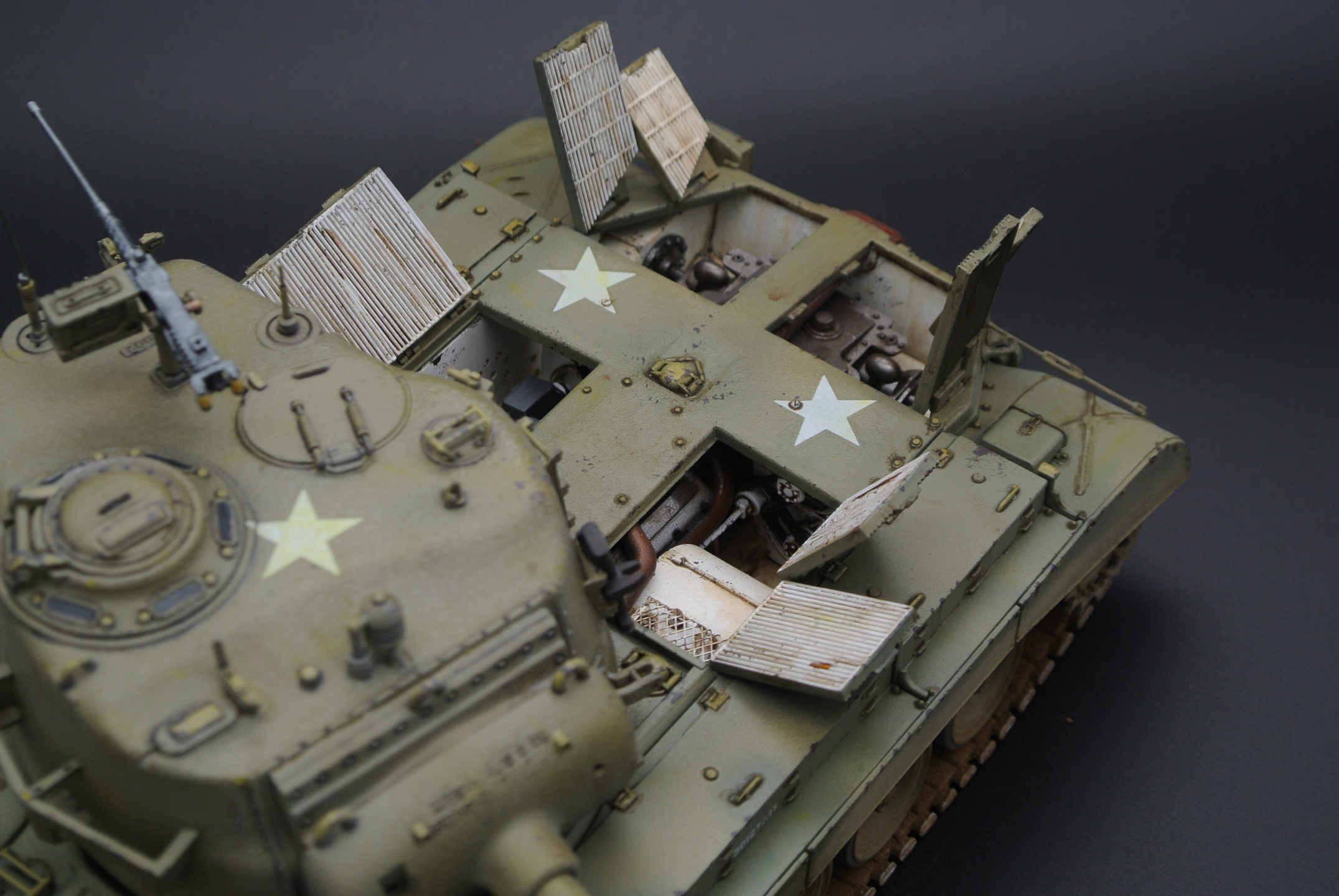 Доработки сделал совсем небольшие: стекла для фар (спасибо щедрому Dragon'у), рассверлил стволы пулеметов и просверлил недостающие отверстия в каких-то крепежных деталях на левом борту башни, антенна из тянутого литника.