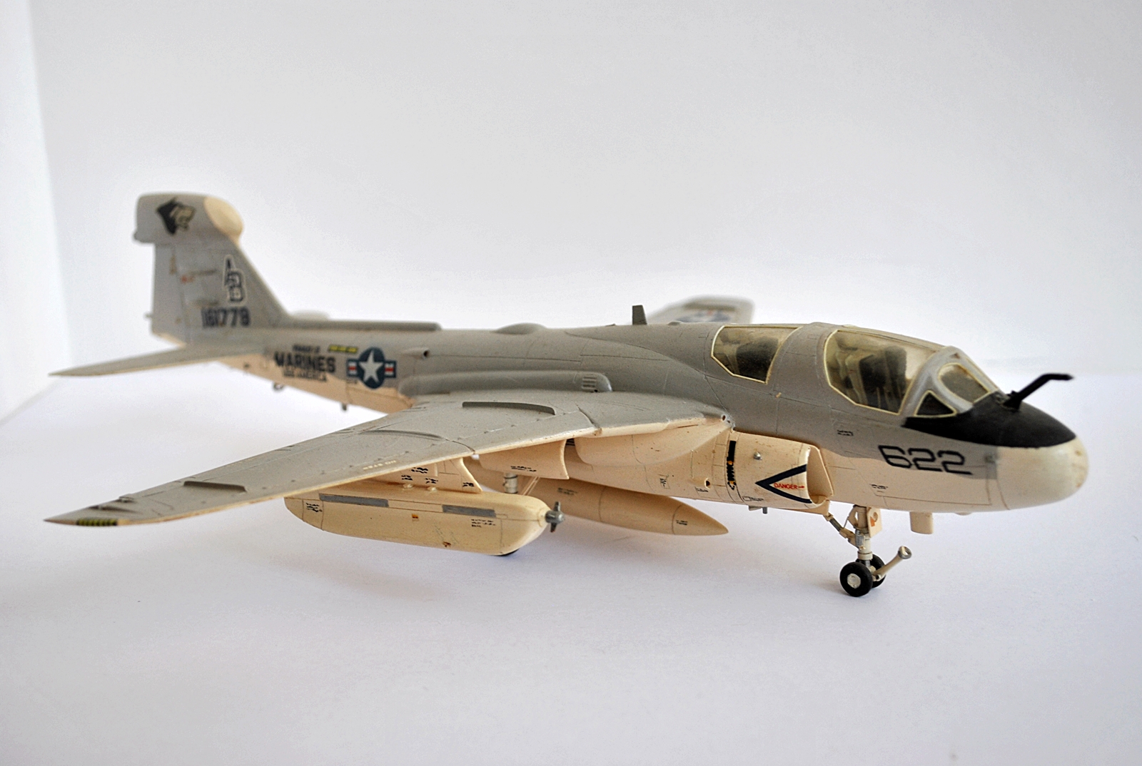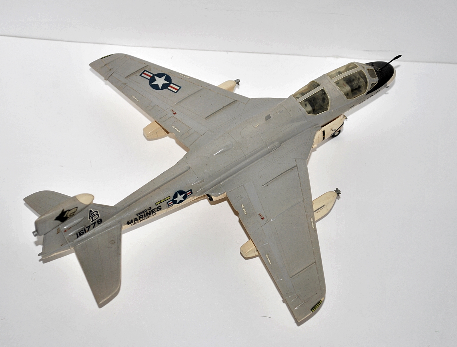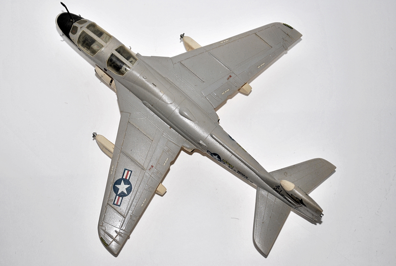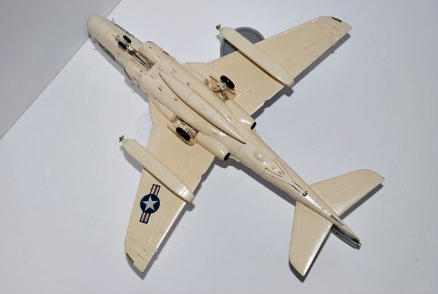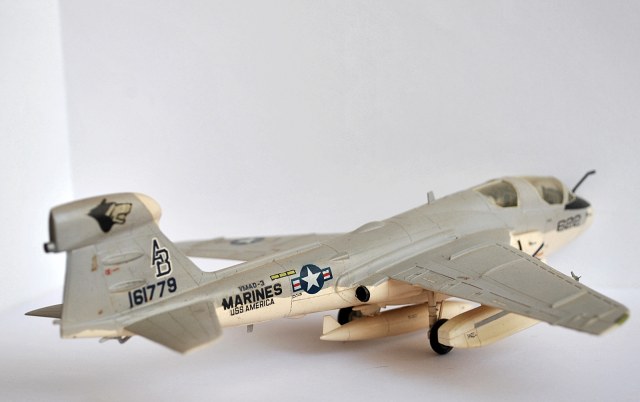 Процесс изготовления это сказка:сначала все вырезалось скальпелем,затем на наждачке обтачивалосьдо нужного уровня(пыли было мама не горюй, но и она шла в дело-растворялась в полистирольном клее и получалась отличная шпатлека)и склеивалось.Часть деталей-в данном случае стойки шасси,топливоприемник,гак и др. делалось вручную.Декали рисовались от руки или по трафарету.Надпись-MARINES взята из набора белорусских сухих декалей-они были 3-х цветов:красный,белый и синий-что тже было круто.