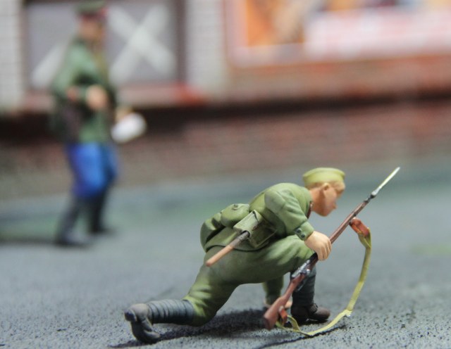 Присоединяюсь к вышесказанному - отличное здание и мелочёвка, но "пластилиновые" бойцы. Особенно командир. И непонятно, почему обмотки в цвет ботинок? Они ж из ткани были.