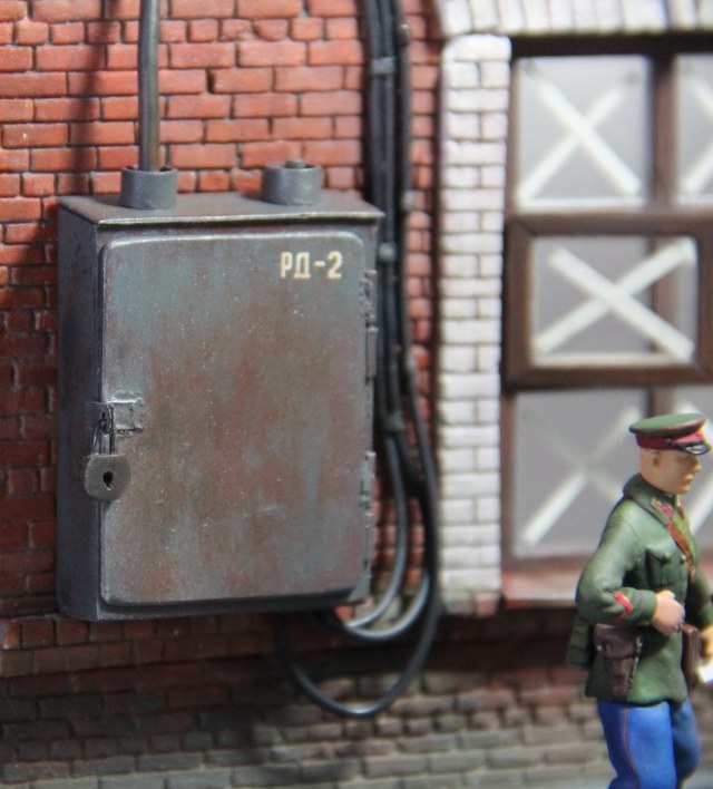 На диораме размеры ящика такие из-за необходимости поместить в нем батарейку на 3В с выключателем. Выключатель замаскирован под правый неиспользуемый заглушенный ввод. А сечения вводного и выходных кабелей в принципе вполне реальные. Если бы не батарейка, то конечно сделал бы более привычный небольшой распредщиток.