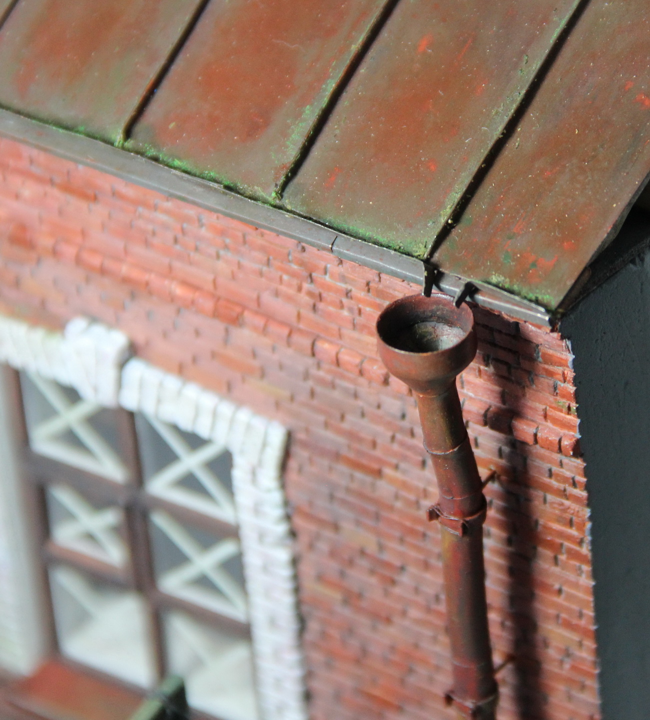 Здание: Отлито из гипса в пластилиновой форме, рельеф кладки нарезан циркулем-измерителем. Полы и перекрытия – линейки, шампура, палочки от мороженого. Крыша из жести от пивных банок получилась грубоватой, в другой раз наверное надо использовать что-то помягче. Имитация насыпной теплоизоляции крыши – из мелких опилок от вышеиспользованных деревянных материалов. Интерьер весь самодельный – стул, сейф, стеллаж, тарелка репродуктора. Асфальт из наждачки. Водосточная труба – коктейльная трубочка. Фонарь – работающий из светодиода. Рамки тренажеров – из деревянных линеек, мешки слеплены из эпоксилина.
