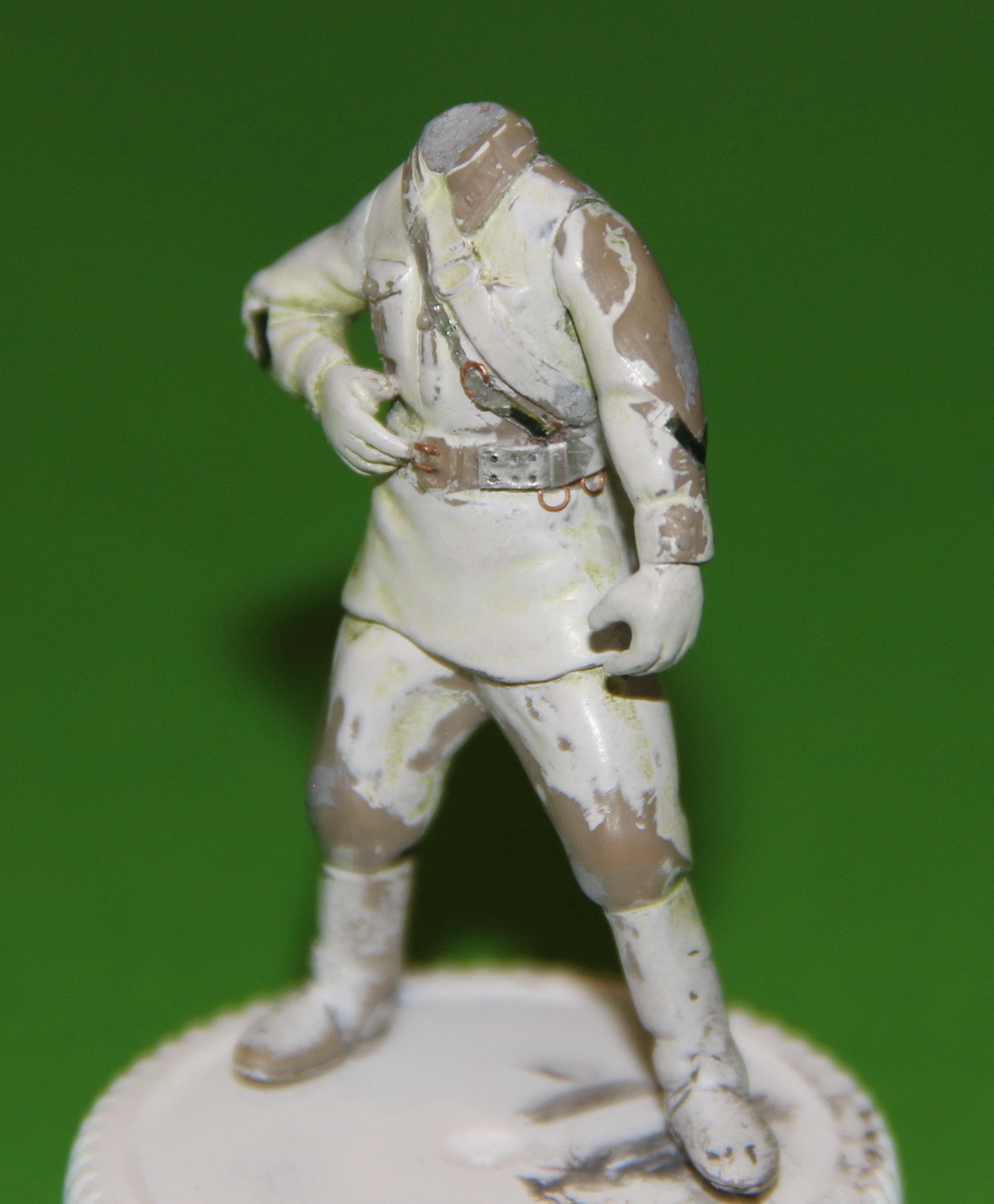 Фигуры: С исходных фигурок срезаны почти все ремни, и некоторые карманы, новые – из доширака и фольги. Ножом скорректирован рельеф утюгообразных звездинских ботинок, доделаны подошвы из доширака и каблуки. Сточены непомерно ребристые обмотки и сделаны новые из полоски изоленты (ИМХО это гораздо легче, чем из фольги или тянутого полистрирола). Головы заменены смоляными копиями голов из наборов Мастербокса, поскольку звездинские с ее родными касками портят всю фигуру. Аналогично - подсумки и противогазные сумки. Саперные лопатки – смоляные копии Миниарта, т.к. Звезда дает поздние (половинчатые) чехлы. Командир переделан из стоящего пулеметчика, немного скорректировано положение ног. Фуражка, кобура ТТ и офицерская сумка взяты от звездинского же командира, фуражка доработана звездочкой и ремешком с пуговицами, на сумке переделан ремешок и застежки, портупея и нарукавые угольники - из доширака и фольги, кольца из проволоки. На петлицах получилось сымитировать только по одному кубарю, поэтому - младший лейтенант. Пуговицы сначала делал из тянутого литника, а позже (у командира) – из заклепок Мастерклуба.