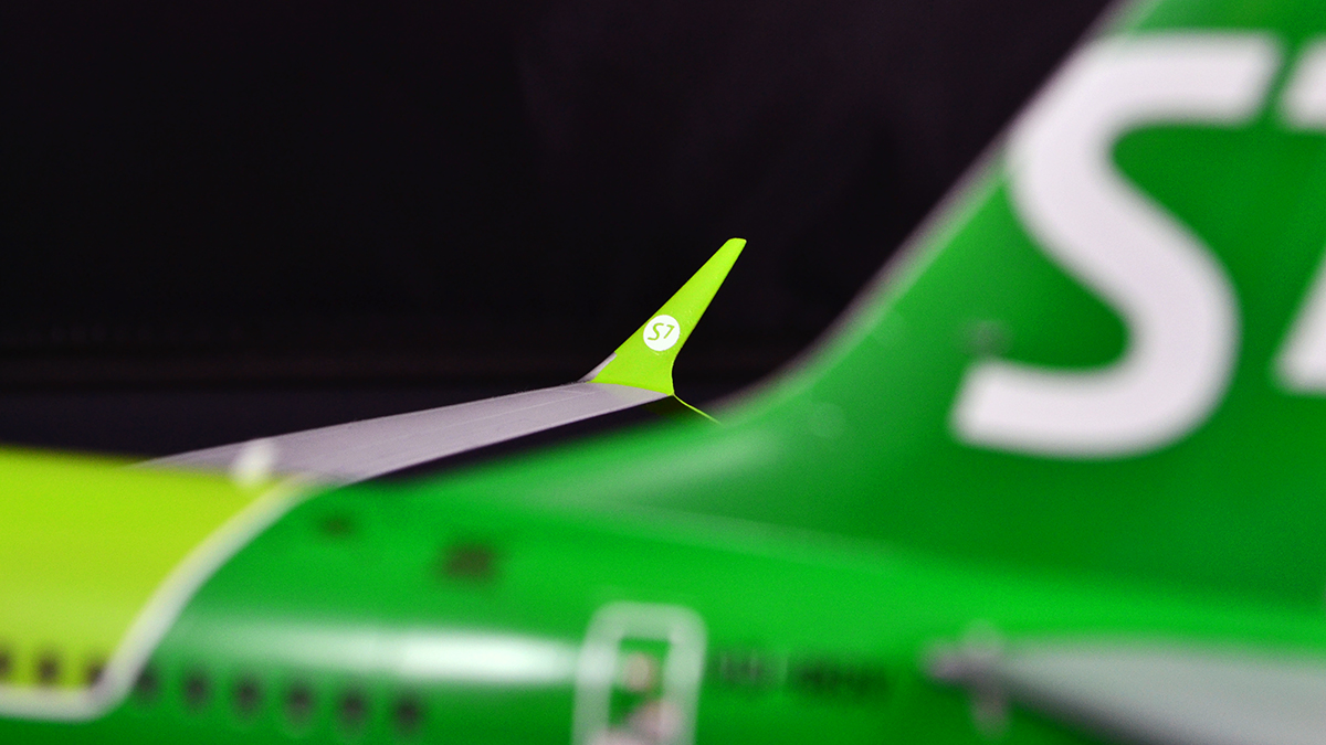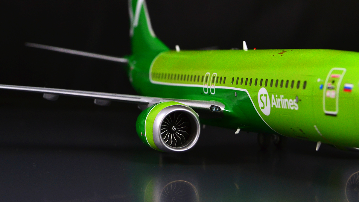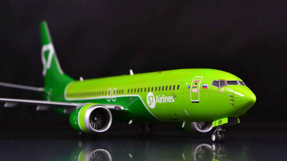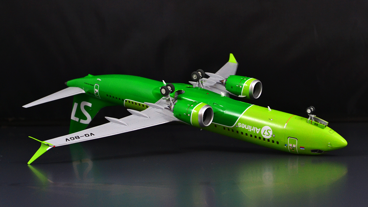 Не обошлось без небольших переделок исходника: была увеличена носовая стойка шасси, с неё же удалена ненужная рулежная фара. Был убран воздухозаборник ВСУ, который Звезда благополучно оставила от NG, хотя на Максе он совсем другой формы - створку я изобразил декалью. Ну и по мелочи: рассверлил сопло ВСУ, зашпатлевал выпускающиеся фары на пузе (их тоже на Максе нет), сделал Logo lights на стабилизаторе, добавил БАНО на законцовки крыла, маячки использовал от Эльфа. Так же заглушил лишние иллюминаторы, а остальные традиционно залил аканом. Лобовик покрасил через макси от KV-models.
