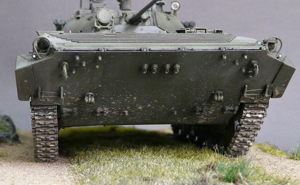 Не хочется вас огорчать, но нашлепки на крыше и бортах башни и на передних люках, которые вы так красиво в металлический отлив покрасили, металлом не являются. Это не сталь, а полимер,- противорадиционный подбой. Поверхность подбоя не гладкая, а имеет мелкосетчатую структуру. Т.е. на модели эти накладки должны выглядеть как глубоко матовая поверхность и никакого металлического блеска.