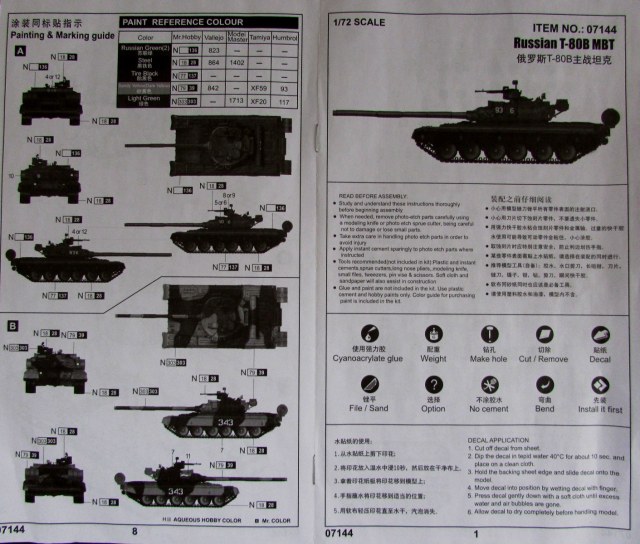 Т-80 до выхода этой модели уже был представлен в "правильном" масштабе. Детализированная, но ВЕСЬМА сложная модель от Modelcollect (причем на данный момент уже все версии) - или древние дрова от Revell, точнее, Matchbox (которые вообще местами не похожи на Т-80). И вот, наконец, данной моделью (а в будущем - как минимум, еще и Т-80БВ) наc порадовали китайские товарищи из Trumpeter.