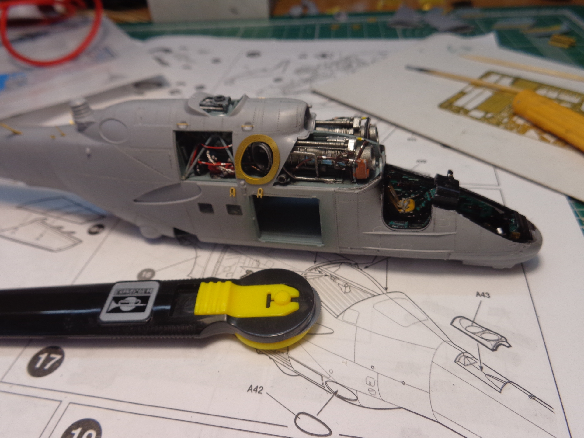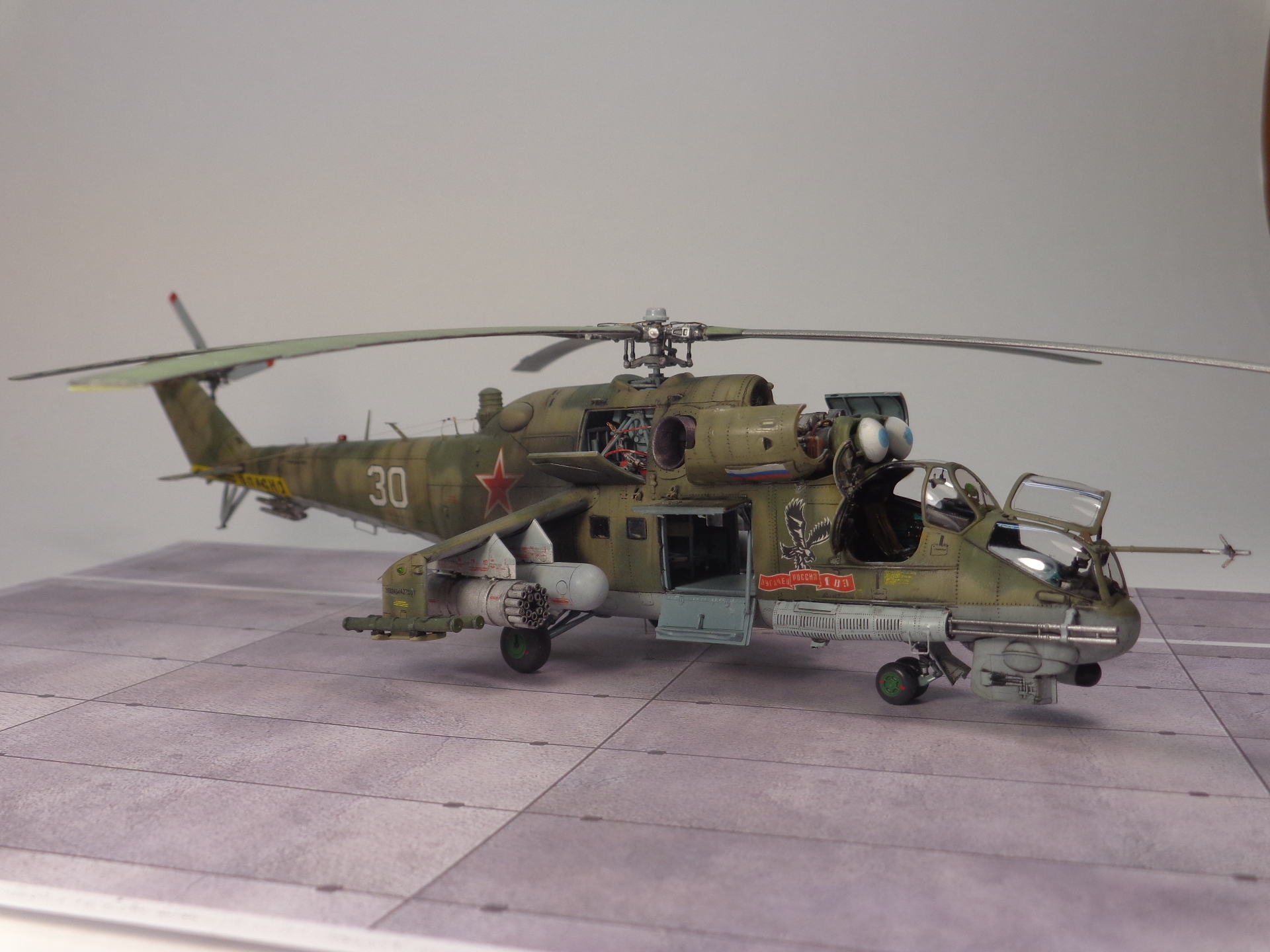 Всем доброго времени суток! Представляю вашему вниманию модель Ми-24П. В сборке использовалось два набора фототравления от Микродизайна - экстерьер и интерьер, а также частично декаль от Authentic Decals (эмблема, триколор, бортовой и заводской номера). В сборке модель очень понравилась. Отличная стыковка, большое количество деталей, выбор вариантов сборки. Единственное, пришлось углубить расшивку. Кроме того из подручных средств (проволоки и тянутого литника) были доработаны двигатели. С помощью трумперовского ревитера накатал клепку. Отдельно стоит поблагодарить ребят из Микродизайна - постарались на славу. Все встает на свои места идеально. Приятно было работать. Единственное, инструкция маленько подкачала. Не совсем иногда понятно что и куда клеить. Поэтому есть на модели пара косячных моментов.)) Тем кто будет использовать это фототравление, советую пользоваться фотографиями из альбома Ми-24 в группе Микродизайна в вконтакте. В окраске использовал в основном водорастворимые краски АКАН из серии "Вертолеты России" и Тамию. Отдельно стоит остановится на декалях и схеме окраски. Authentic Decals для этого борта дает схему окраски только левого борта. Да и то не известно верная она или нет. Фотографий во всемирной паутине я так и не нашел. Выяснил только, что это сызранский борт. Нашел только очень похожую схему сызранского борта, но для Ми-24В. В общем, по ней и красил. В конце концов одну фотографию именно этого борта я все-таки нашел. Правда там ракурс такой, что и не поймешь какая там схема камуфляжа. Но вроде похожа.)))) Декали меня слегка подрастроили своей хрупкостью. Хорошо хоть все сразу в воду не окунул. Начал с триколора. Он рассыпался буквально сразу после намокания. Пришлось остальные декали покрывать футурой. Вроде помогло, хоть не так мелко рассыпались. Пока производил манипуляции с окраской и декалями, постоянно что-нибудь отламывал: то статики, то ПВД, то зеркала. Когда надоело подклеивать, сложил все в кучку и приклеил все в самом конце. Ну и под конец стоит указать, что смывка тамиевская, матовый лак АКАН. Попачкал маленько маслом. Вот вроде и все.
