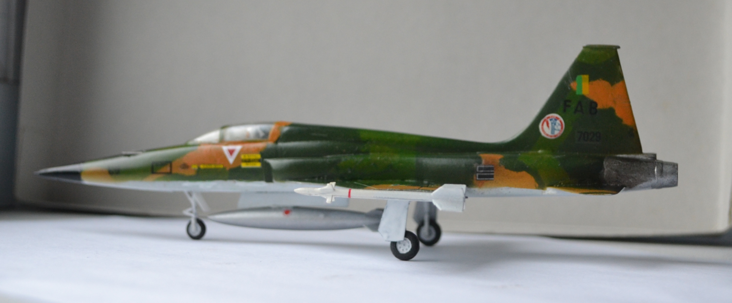 В качестве прототипа использовал схему окраски бразильских ВВС, правда с оговорками - даже беглых взглядов на фото прототипа было достаточно, чтобы понять, что модель не очень копийна. Однако заниматься перепилингом желания не было, потому лишь срезал с модели внешнюю расшивку, заровнял швы и грубые выемки на брюхе. Створки колёс шасси и воздушные тормоза на брюхе сделал в убранном положении.